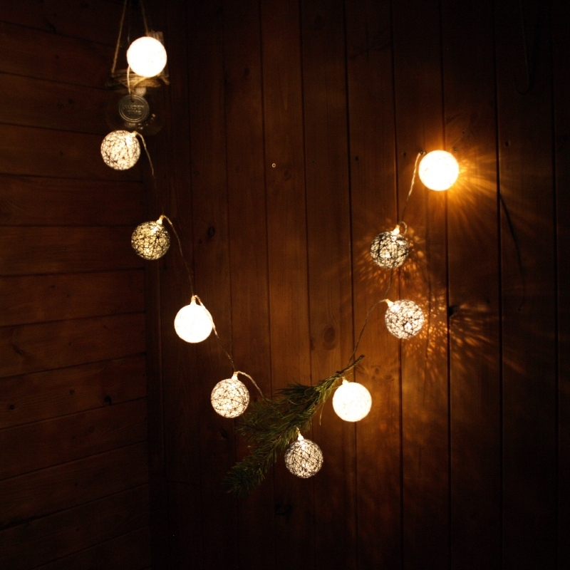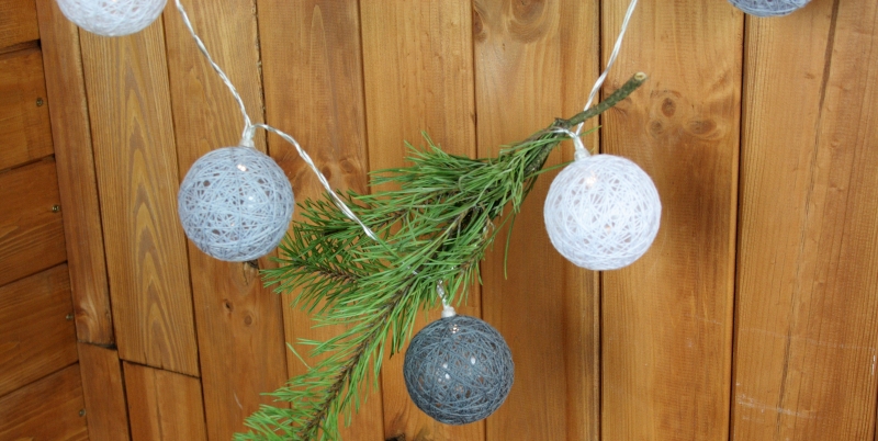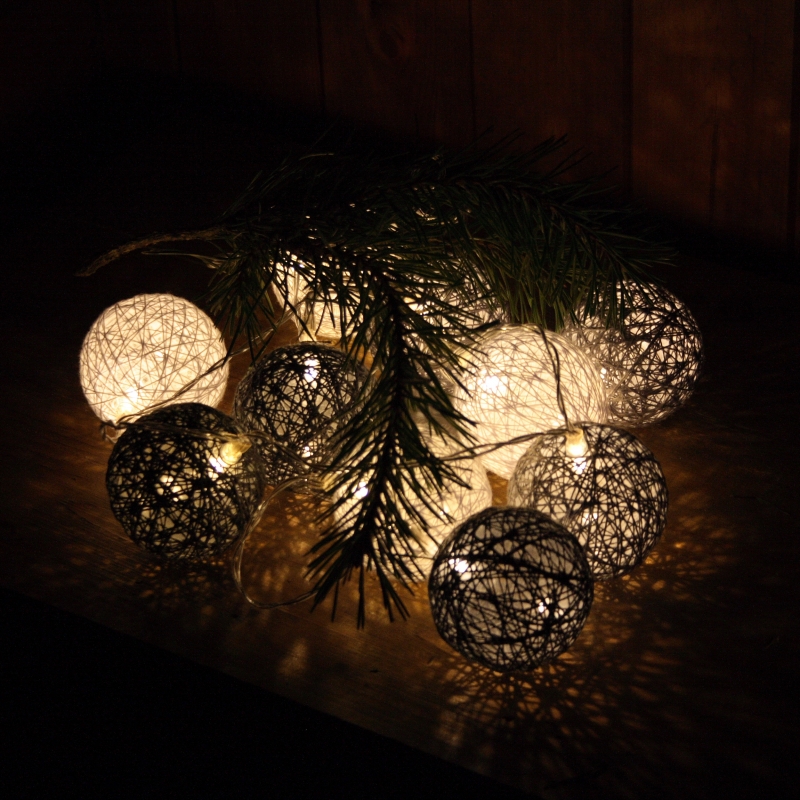 Vánoční osvětlení, které tvoří bílé, světle šedé a tmavě šedé kuličky.