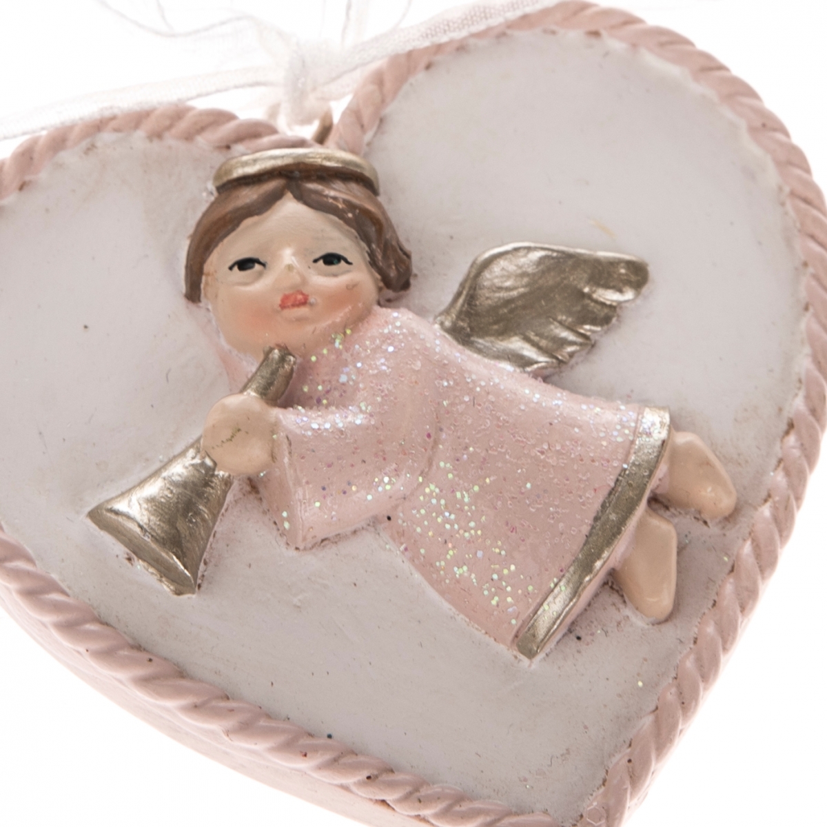 Vánoční ozdoba medailonek ve tvaru srdce s platickým vyobrazením letícího andílka s trumpetou. Šaty anděla jsou pokryté duhovými třpytkami, které budou nádherně zářit ve světle světýlek vánočního stromečku.