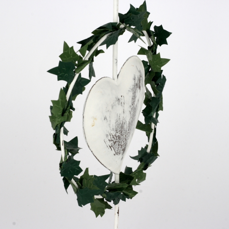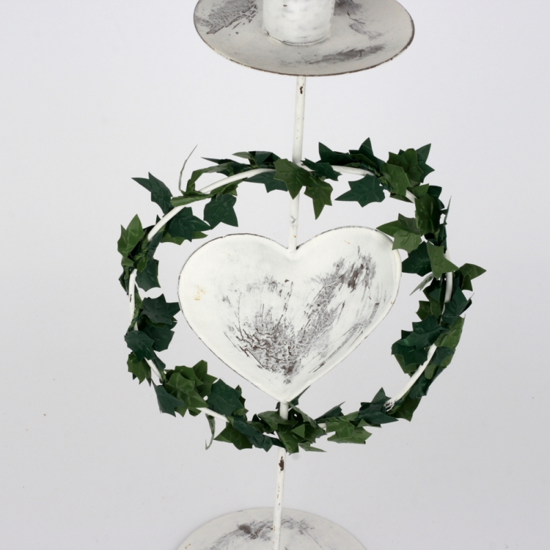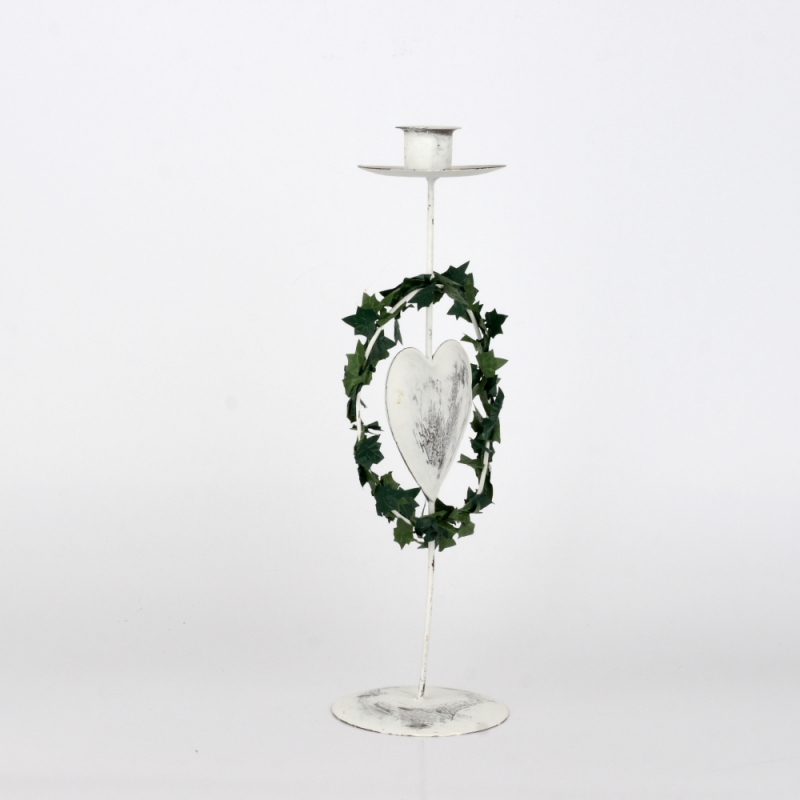 Kovový bílý svícen s patinou je doplněn o umělé listy břečťanu, které na světlé konstrukci krásně vynikají.