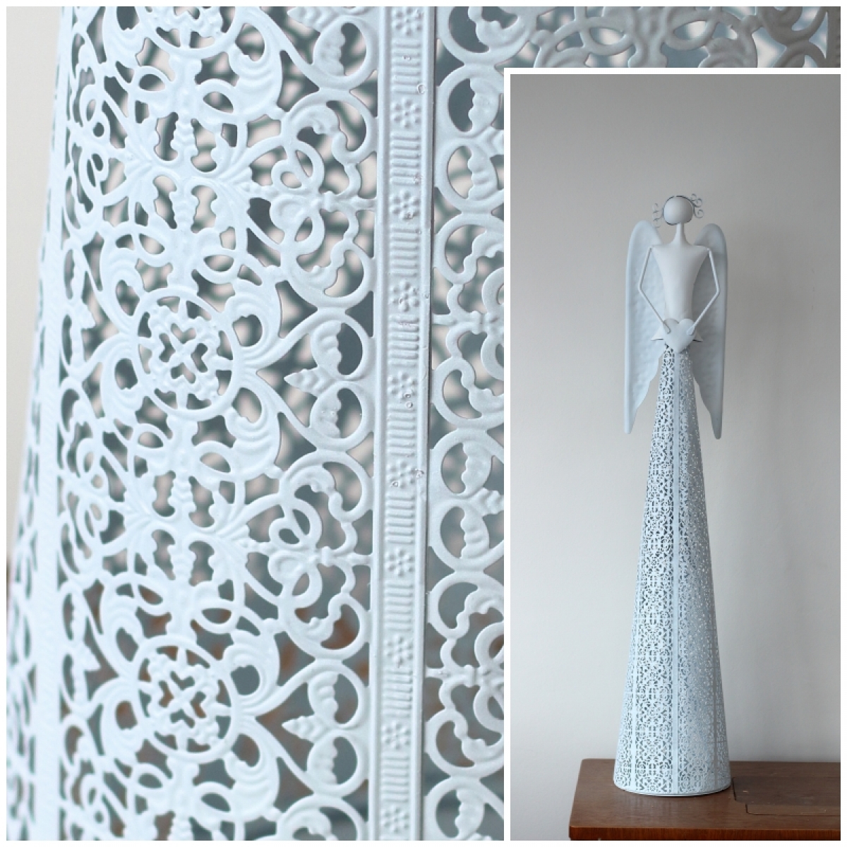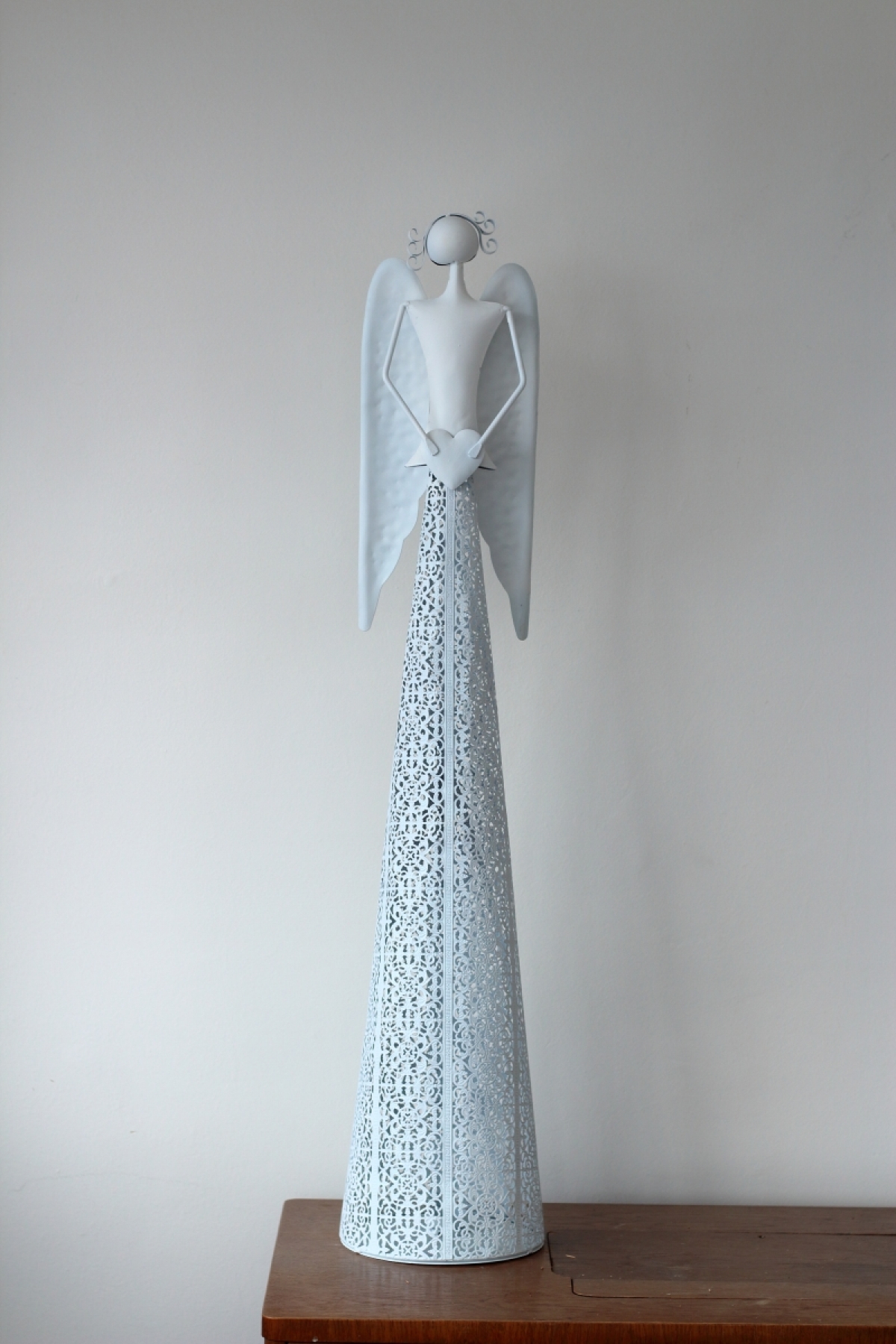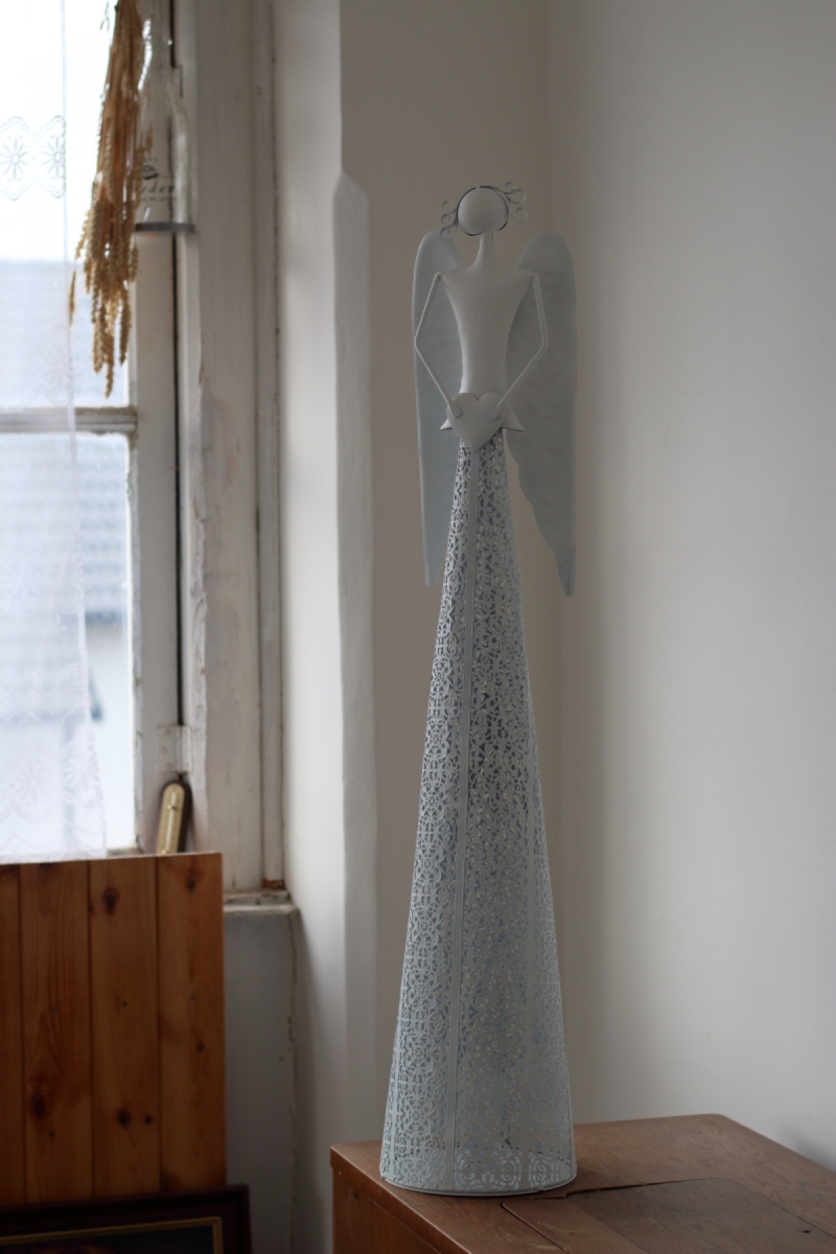 Vánoční výzdoba inspirace - kovový anděl vysoký 98,5cm se srdcem má ve spodní části otvor pro bezpečné uložení a zapálení čajivé svíčky.