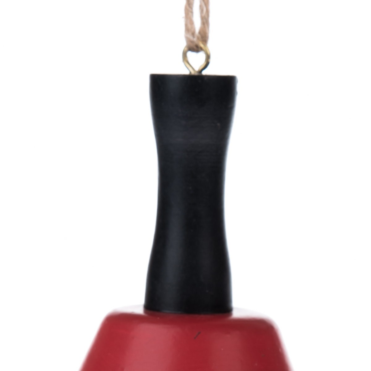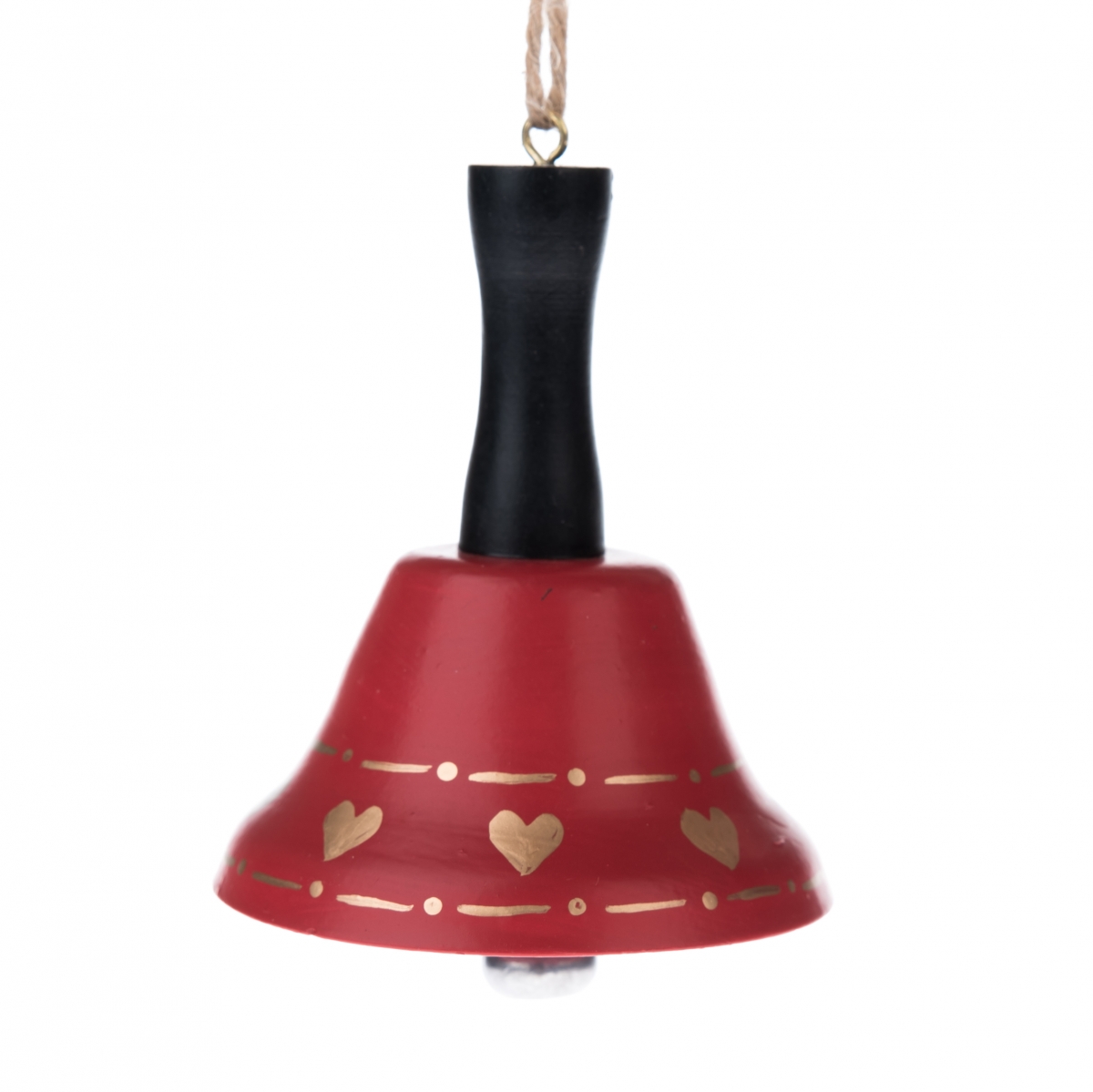 Vánoční zvoneček v červené barvě zdobený zlatými srdíčky vás překvapí jasným a čistým zvukem.