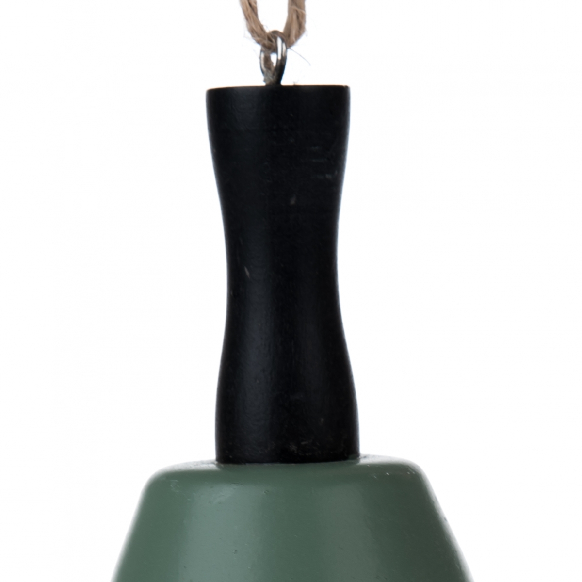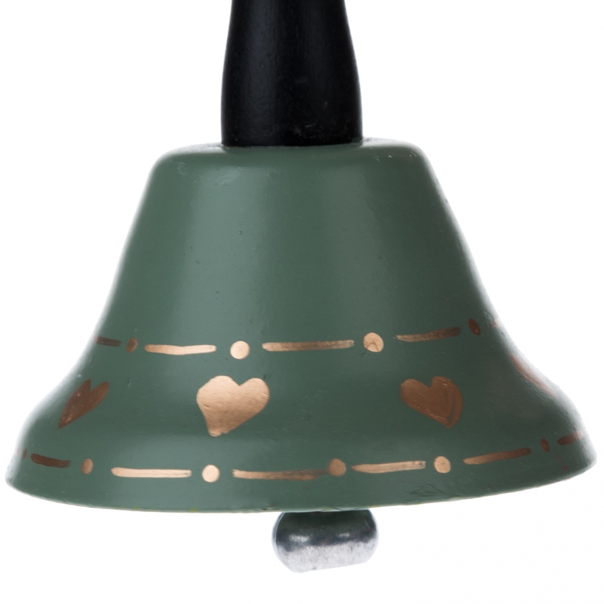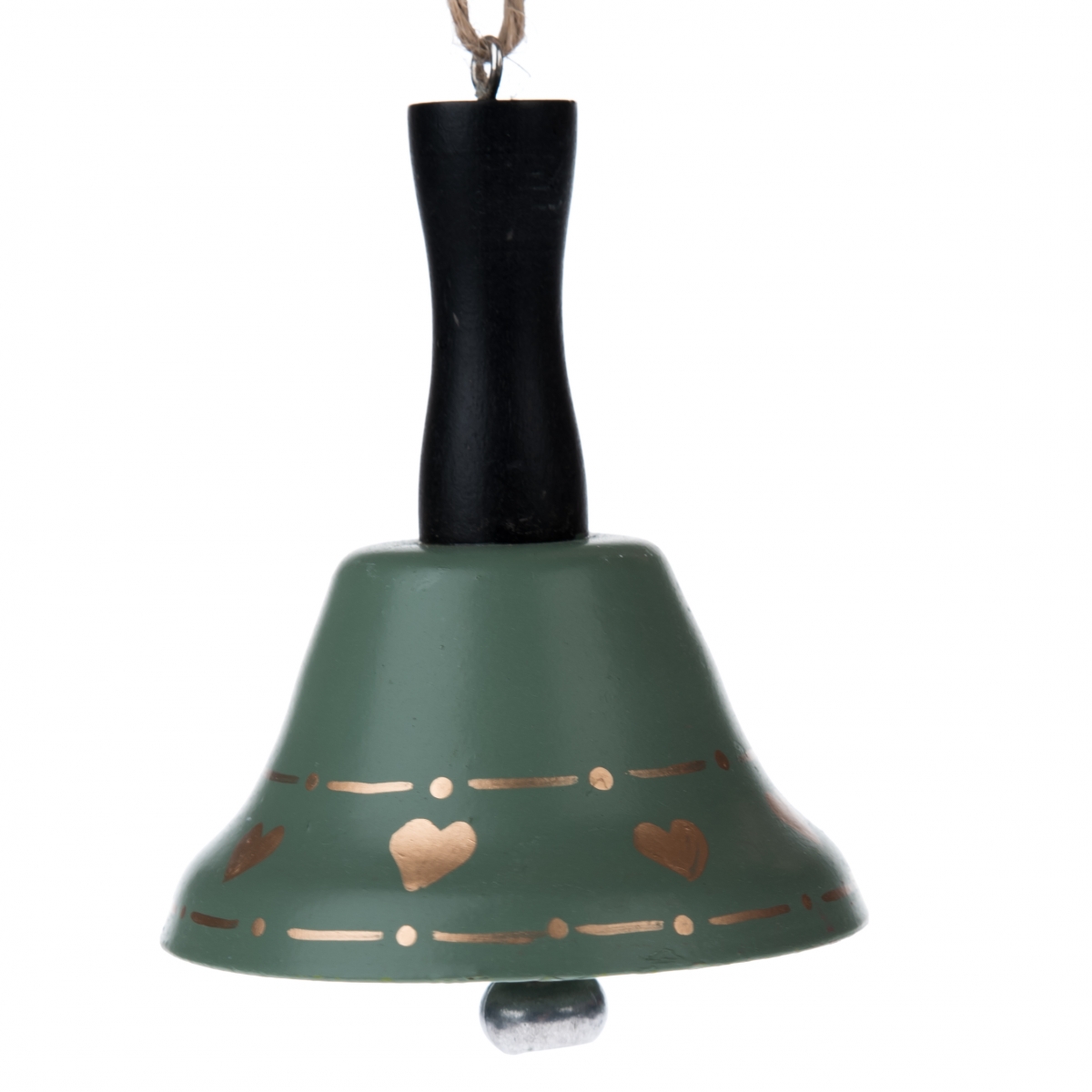 Vánoční zvoneček v zelené barvě má zlaté zdobení s něžnými srdíčky.