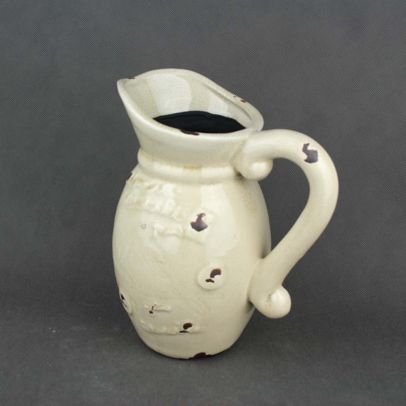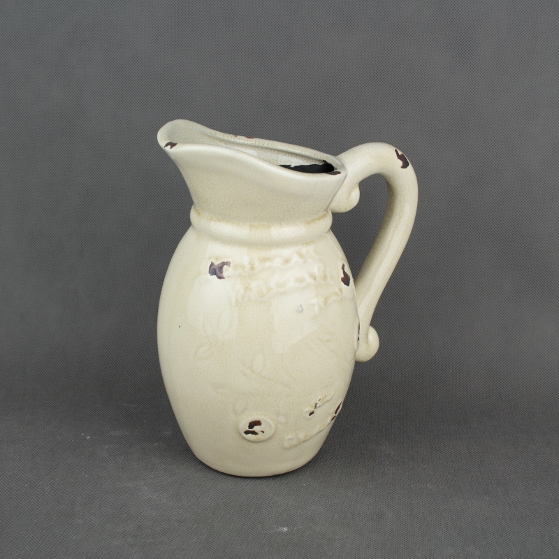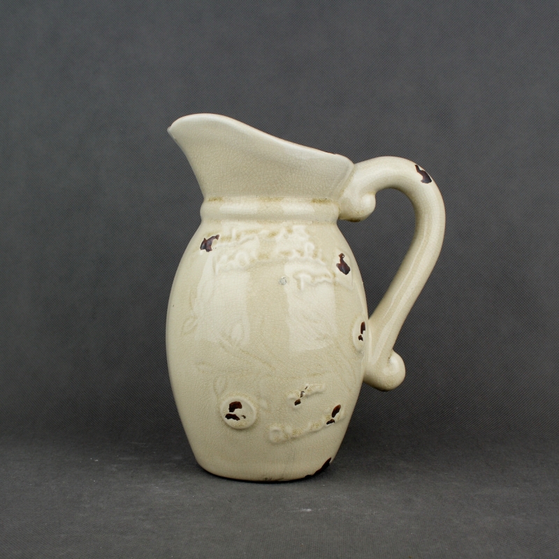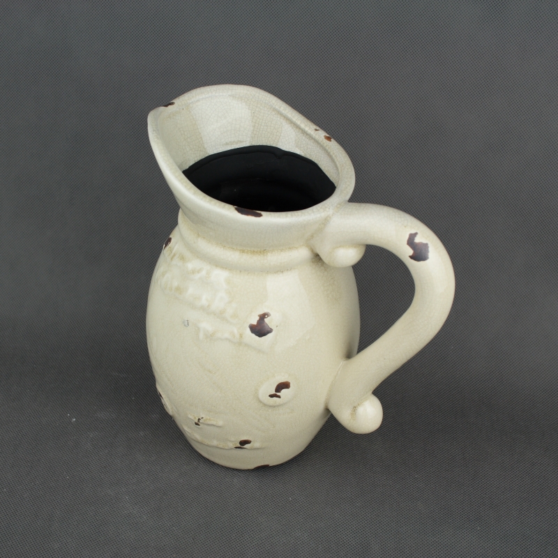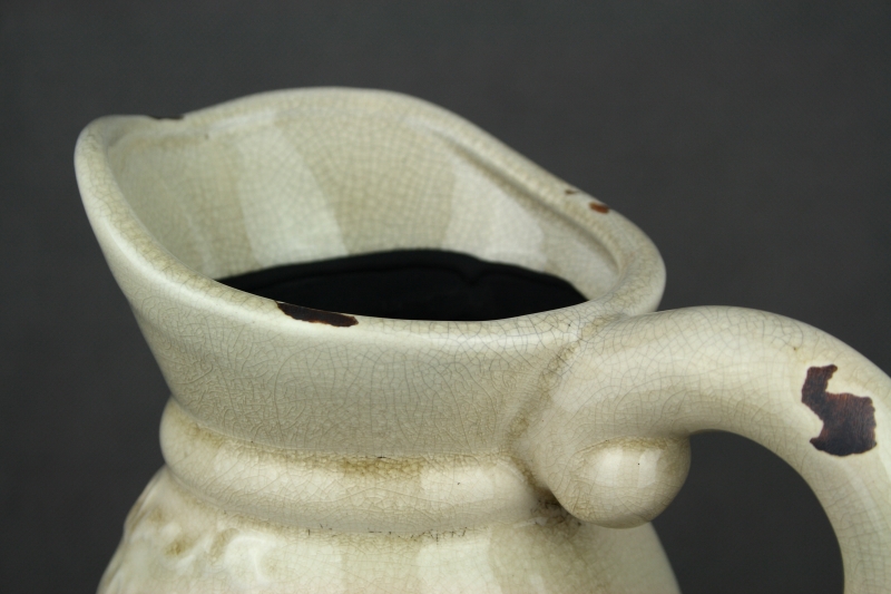 Džbánek světlé barvy se zdobením v podobě plastických nápisů. Džbánek má oprýskaný vzhled, který budí dojem starých časů.