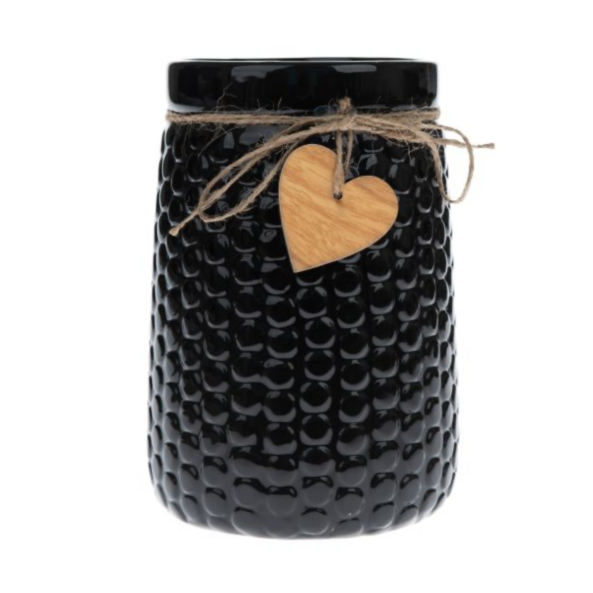 Váza se srdcem keramická tmavá má zajímavý 3D reliéf a lesklou černou glazuru. Je ozdobená jutovou šňůrkou s dřevěným srdíčkem.