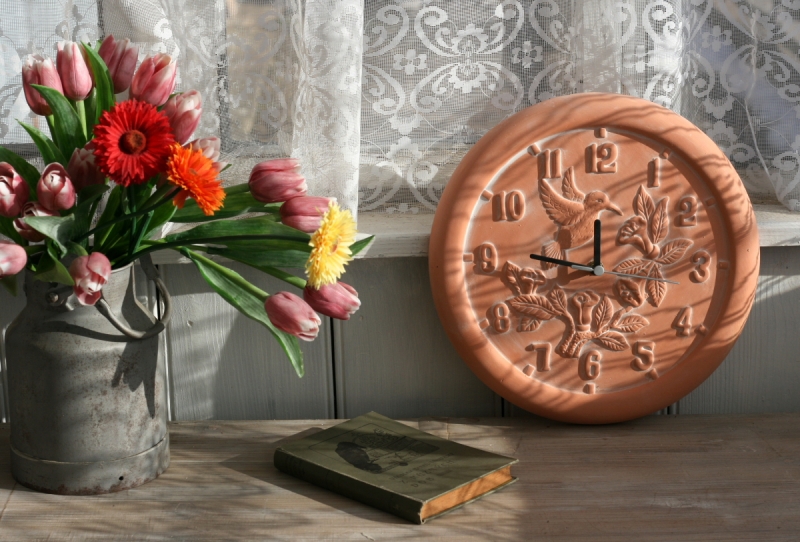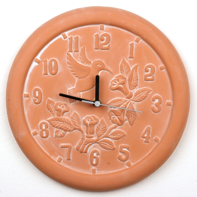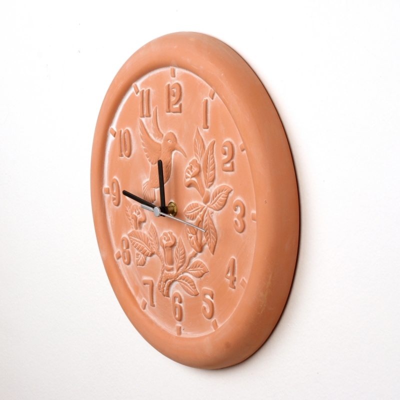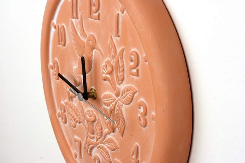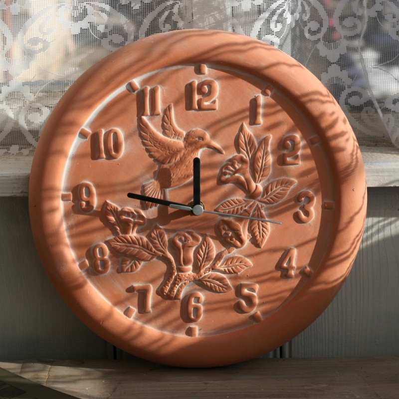 Venkovní hodiny s ptáčky jsou z pálené keramiky bez povrchové úpravy. Zdobí je pouze lehká bílá patina.