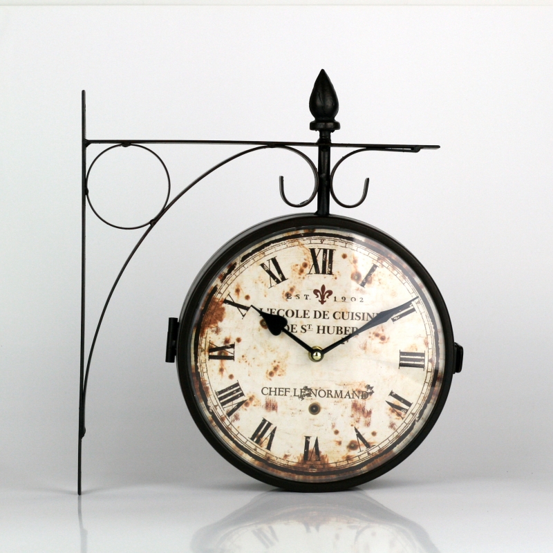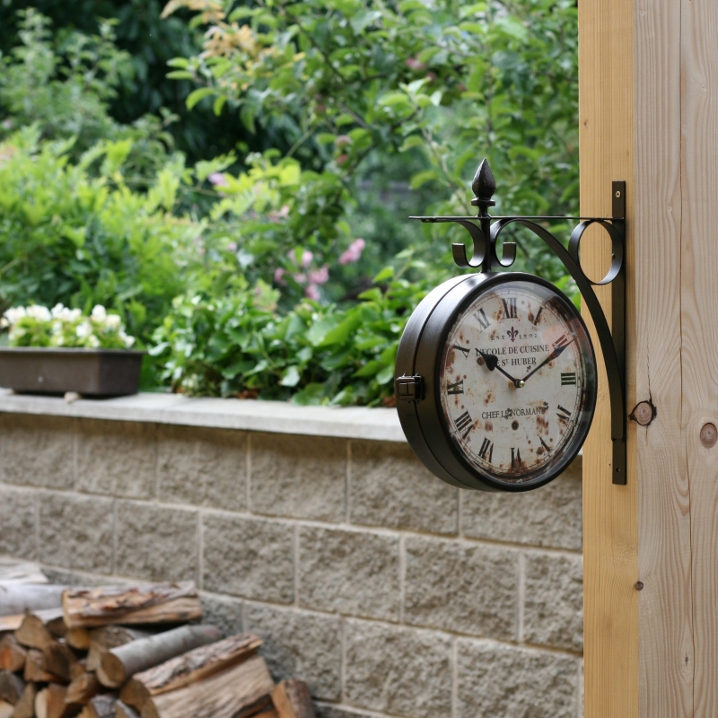 Venkovní nástěnné hodiny patří mezi ty, které mají větší průměr ciferníku, než ostatní hodiny z letošní kolekce oboustranných hodin.