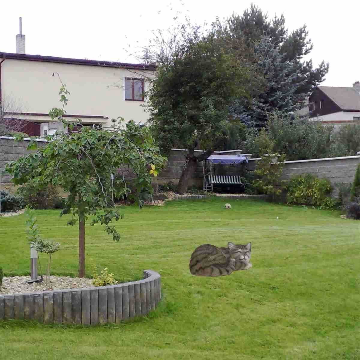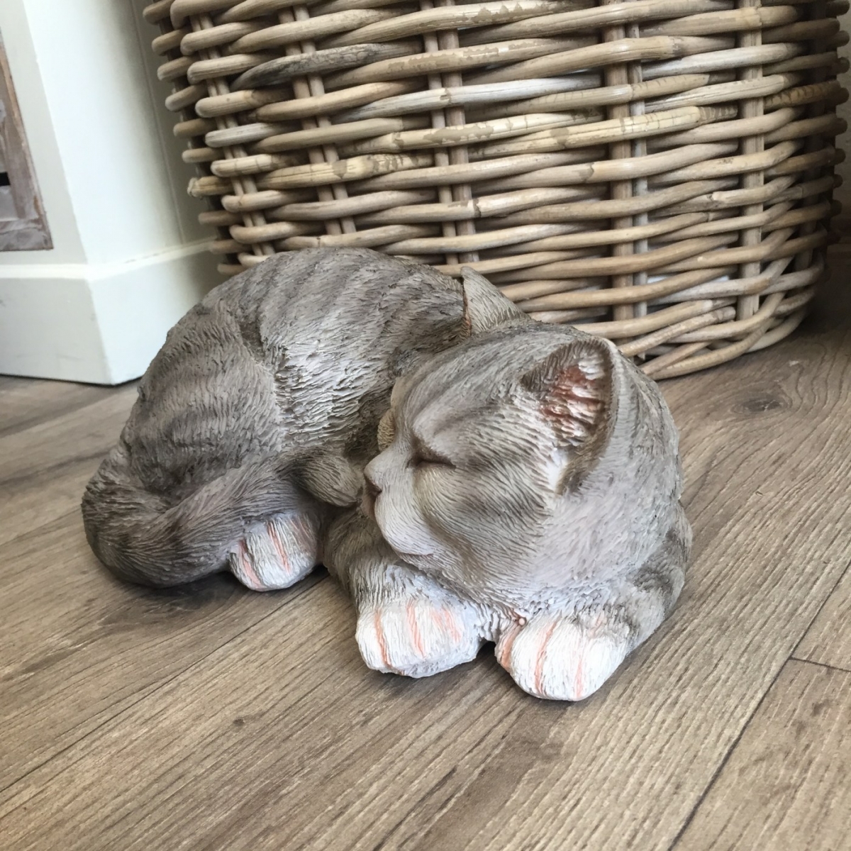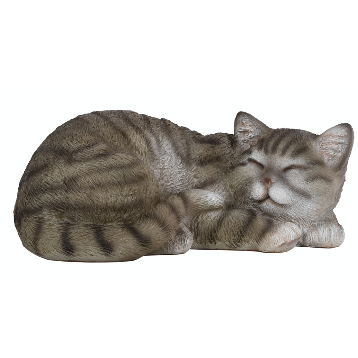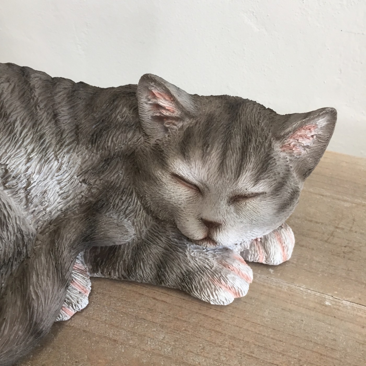 Venkovní socha spící šedé kotě vyrobená z polyresinu je téměř k nerozeznání od skutečného kočičího mazlíčka.