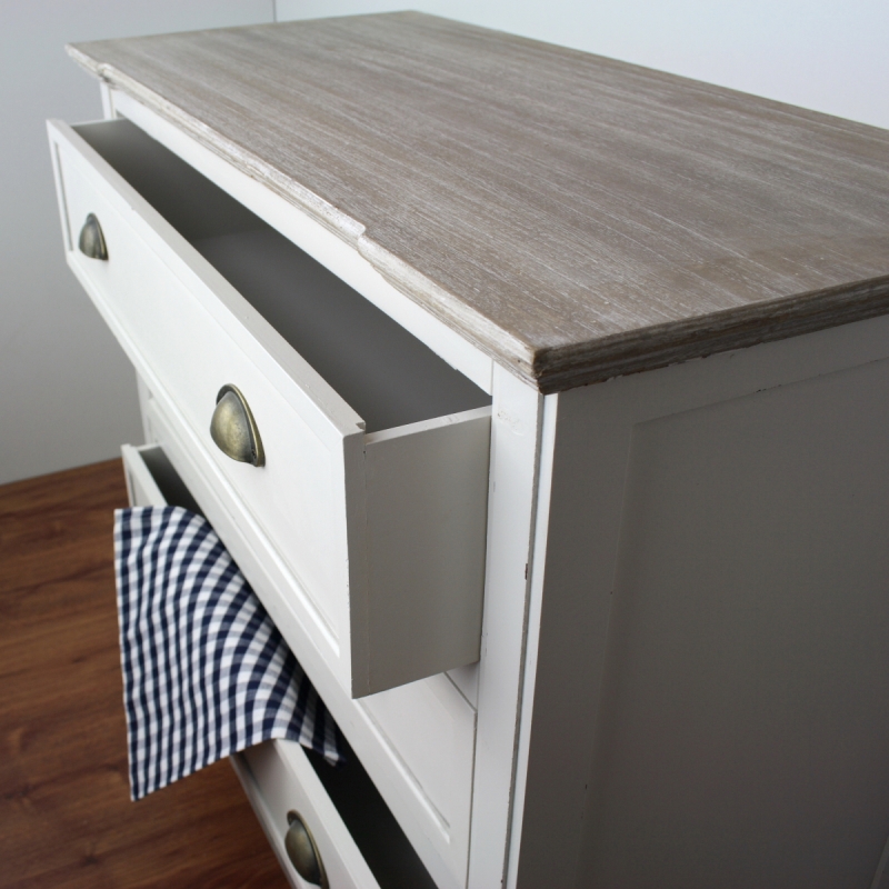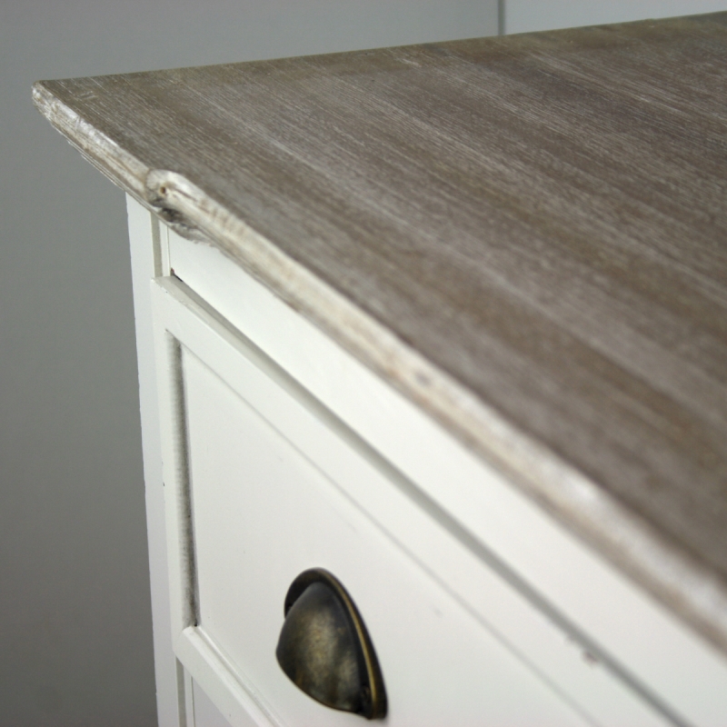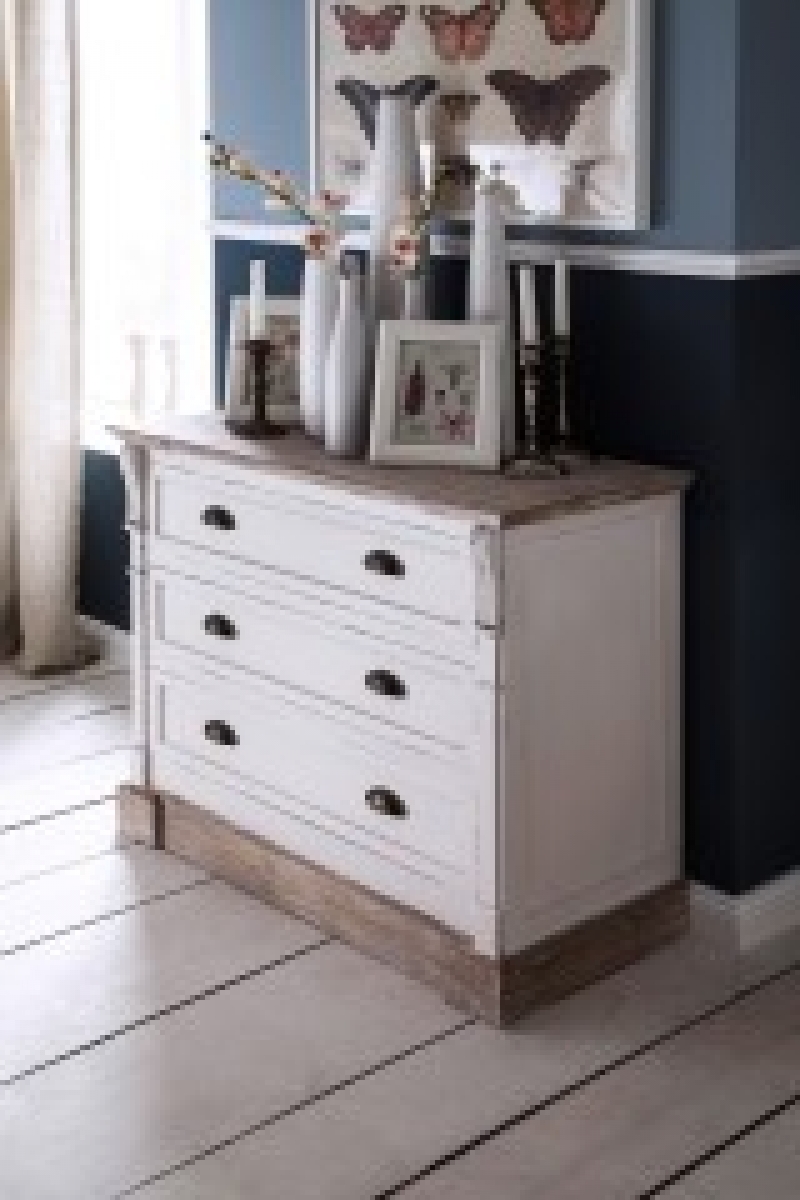 Vrchní deska a spodní lem komody j v přírodních barvách dřeva, zbytek komody je v bílé barvě s patinou.