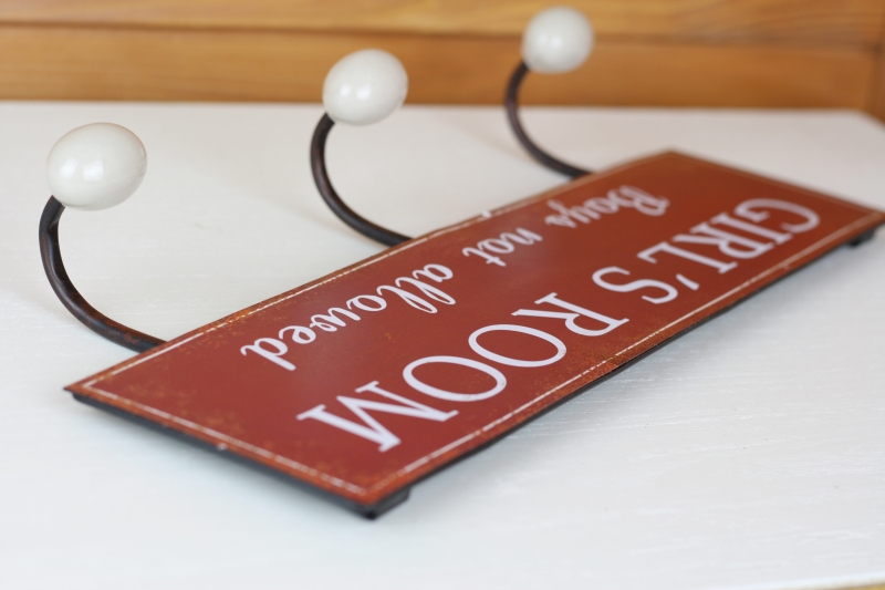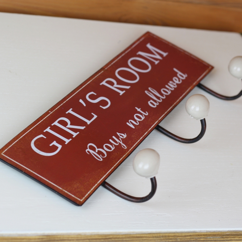 Věšák do dětského pokoje Girľs room 37x15cm není jen tak obyčejný věšák. Cedule, na které jsou připevnění háčky, zakazuje vstup chlapcům, kteří by tak jistě rušili panenky při odpočinku.