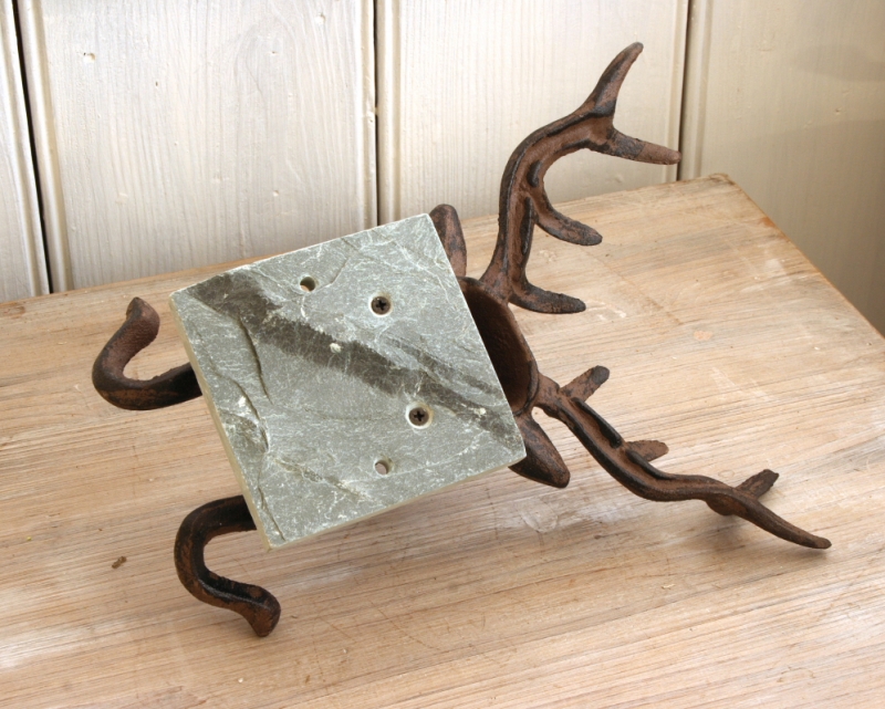 Litinová hlava je připevněná na kamenné desce, kterou na stěnu připevníte za pomoci dvou malých šroubků.
