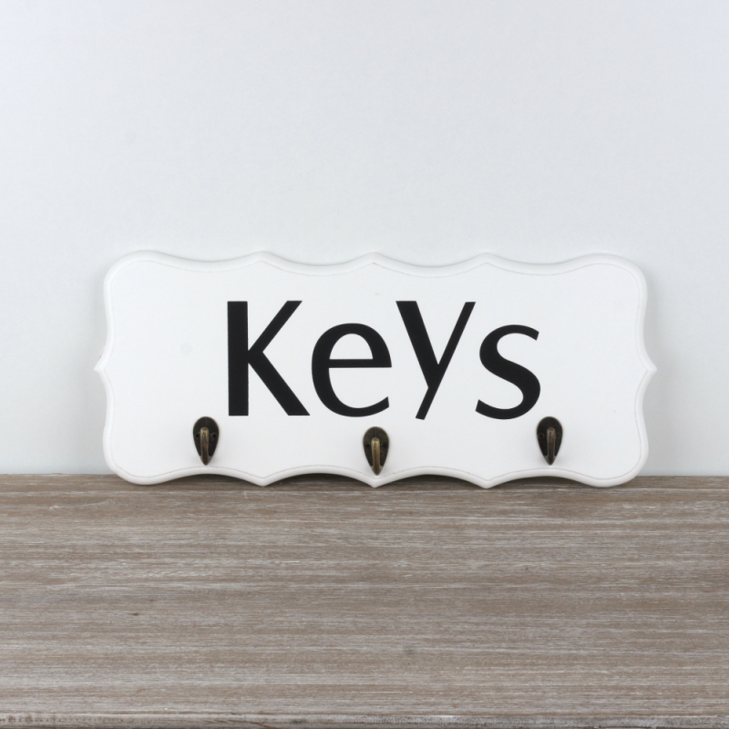 Věšák má bílou barvu a černý nápise KEYS (klíče). Pod ním jsou umístěny tři kovové háčky na klíče.