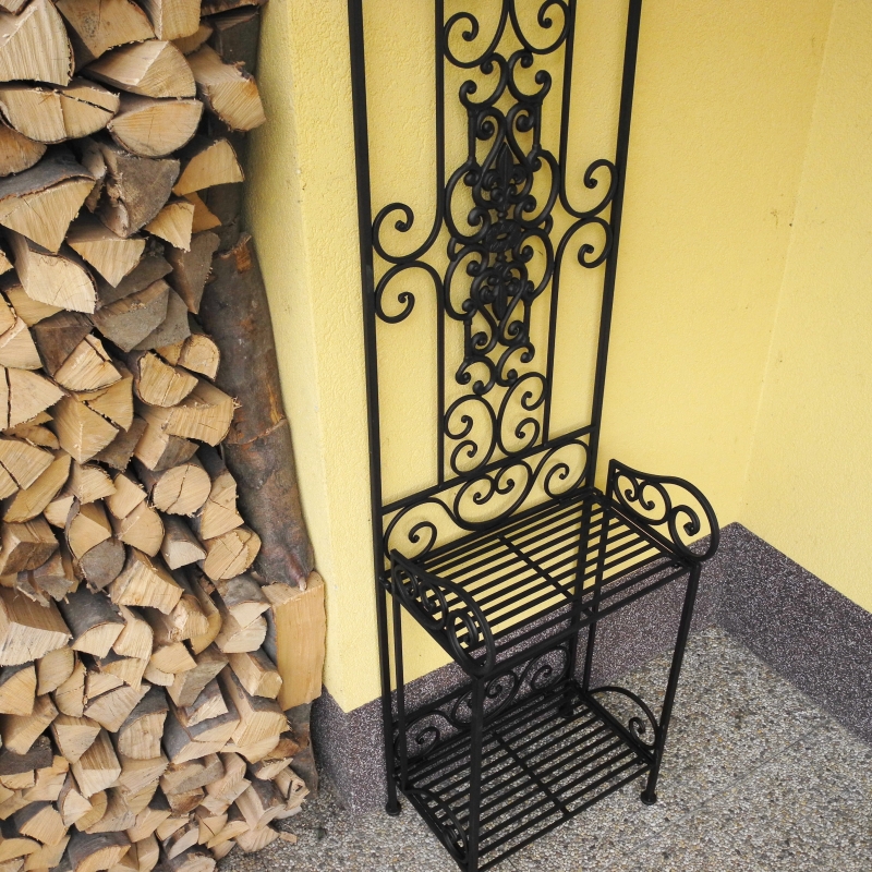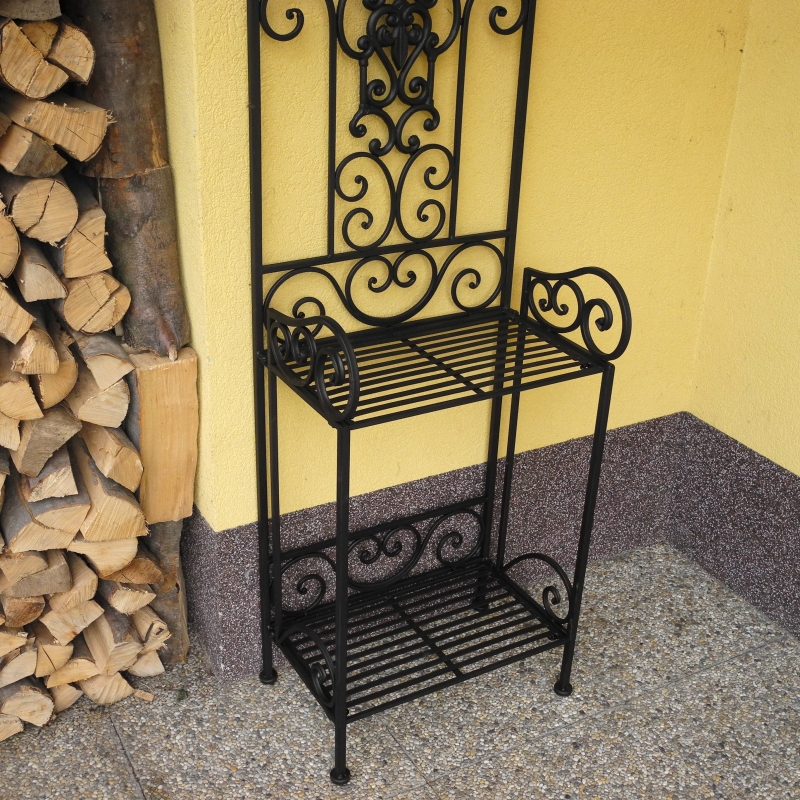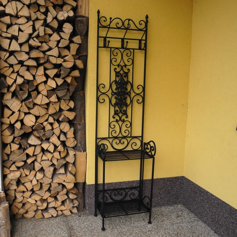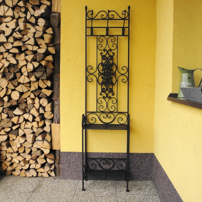 Díky použitému materiálu je velmi stabilní a nemusíte se bát jeho převrhnutí. Na věšáku najdete dvě odkládací poličky a také praktické háčky na zavěšení.