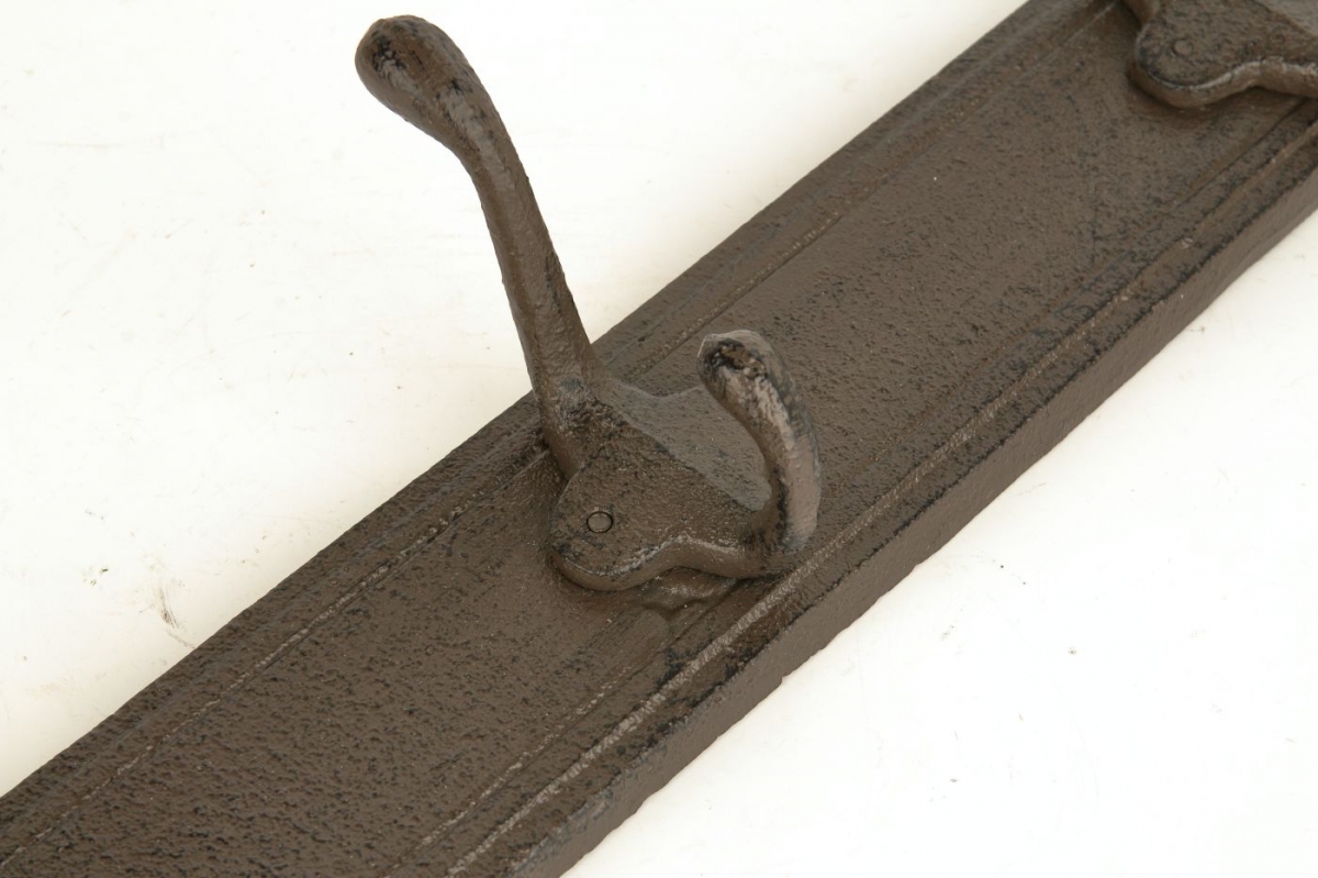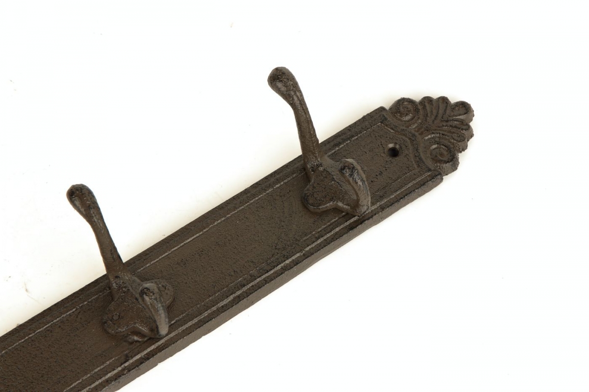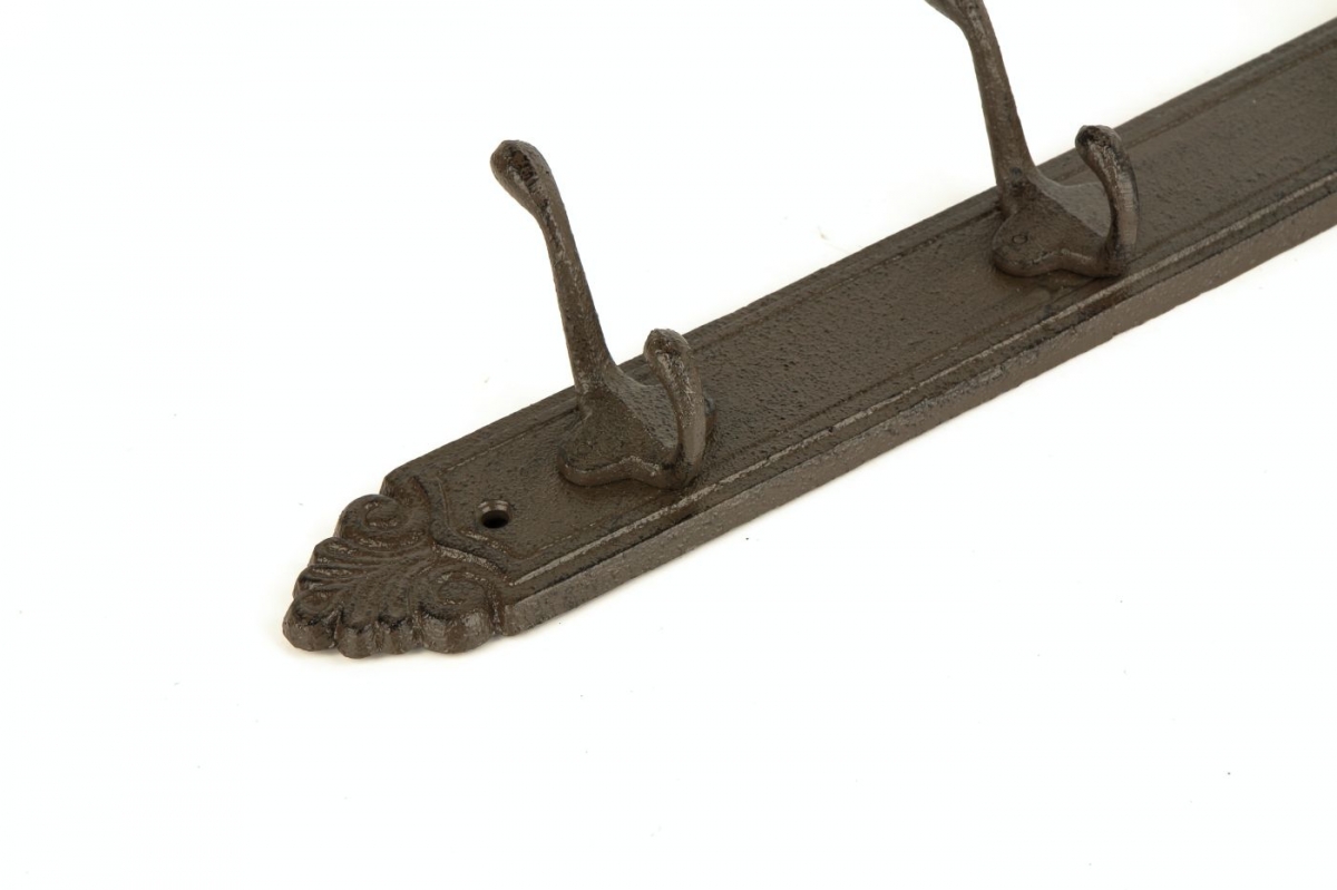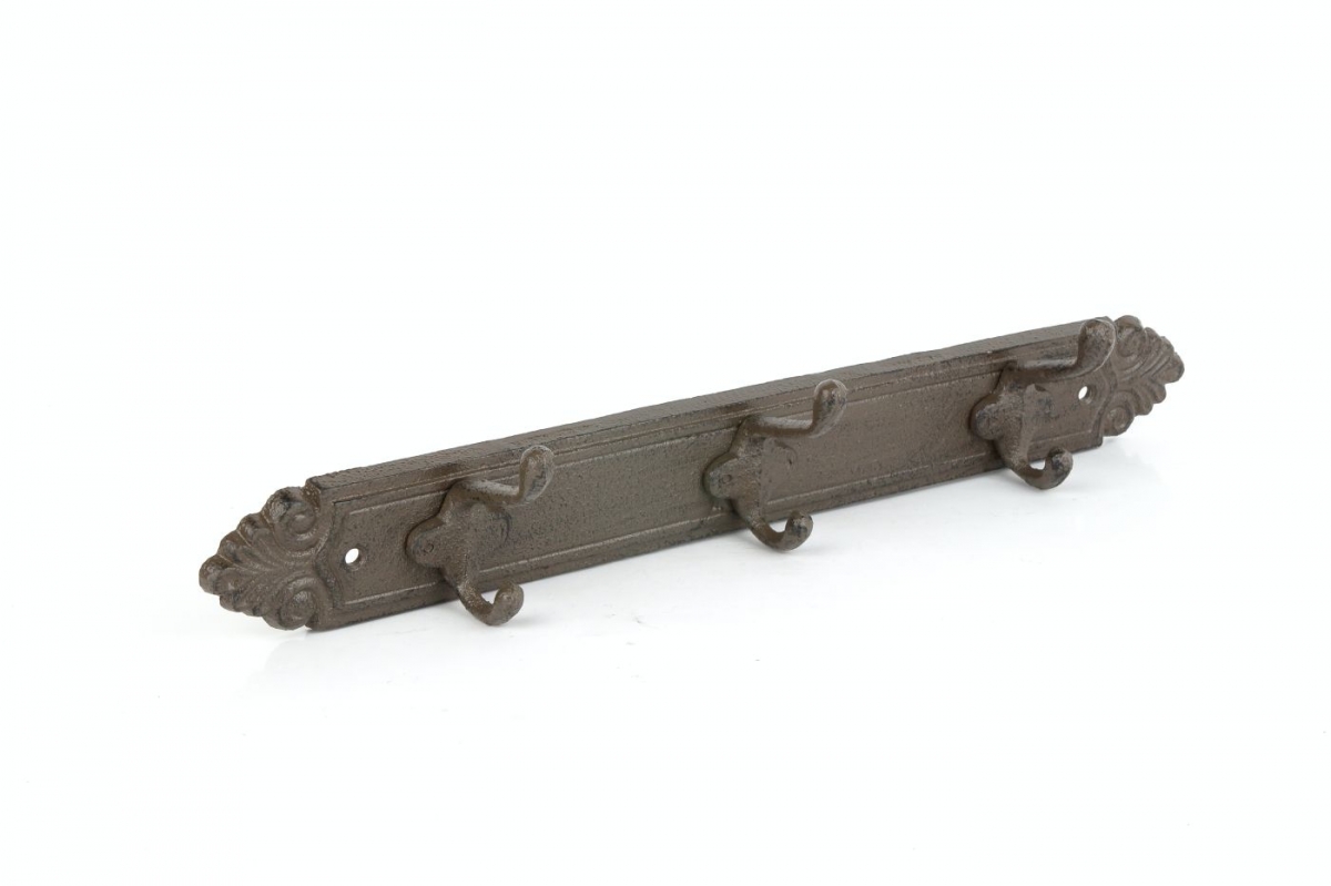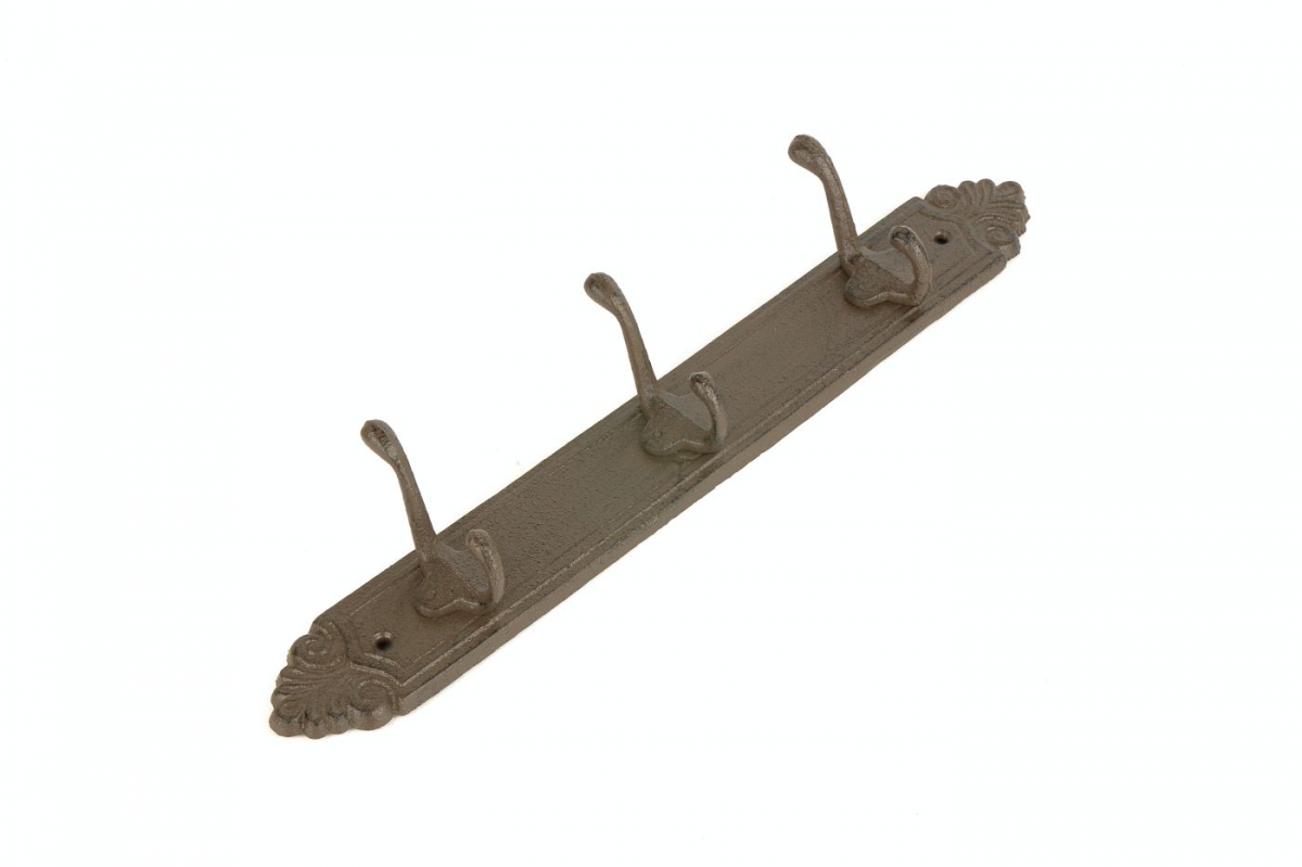 Věšák na stěnu se starožitným zdobením v rozích je vyrobený z litiny a je vybaven třemi dvojháčky pro zavěšení. Neztratí se v koupelně na ručníky nebo župany, v předsíni na kabáty a bundy nebo v kuchyni na utěrky.