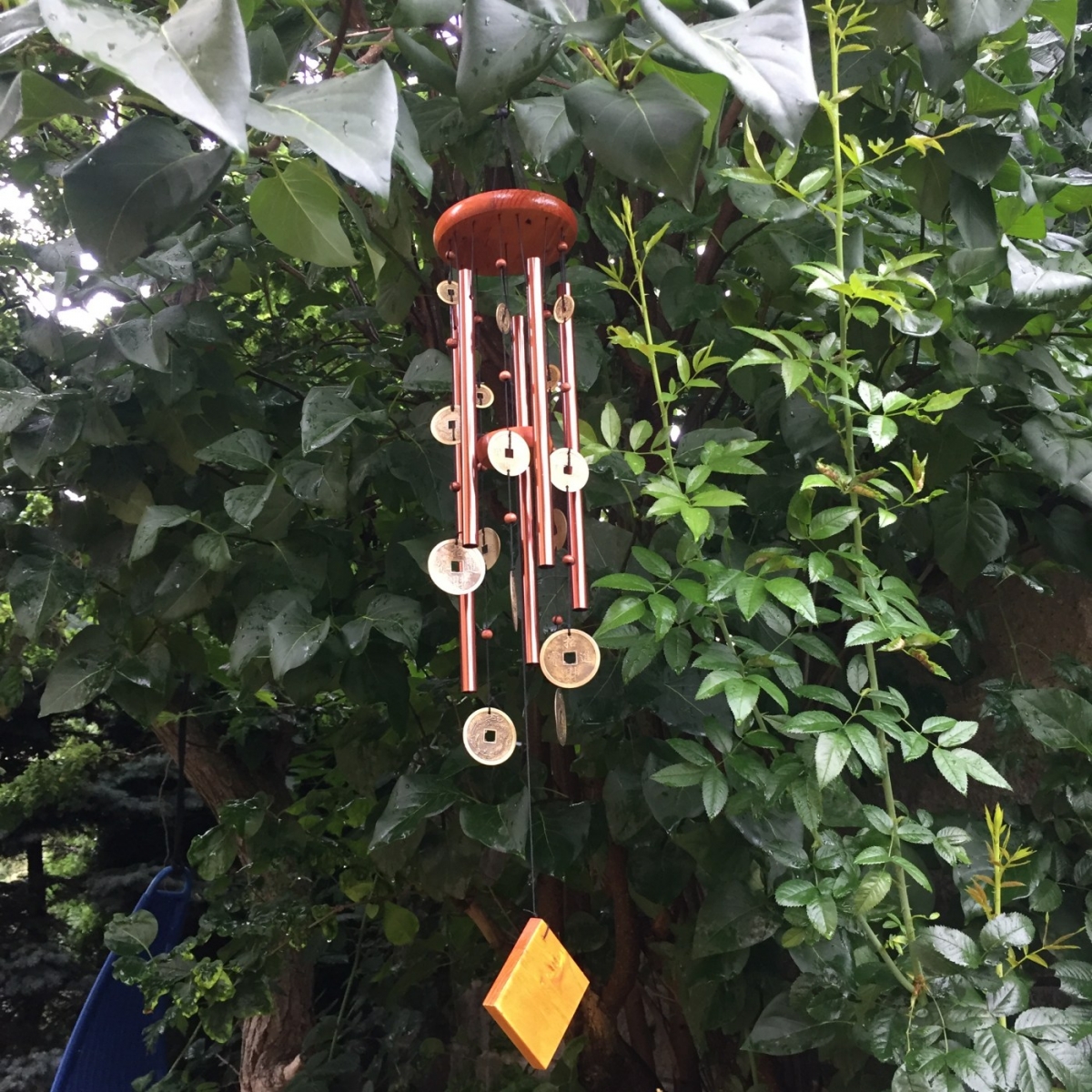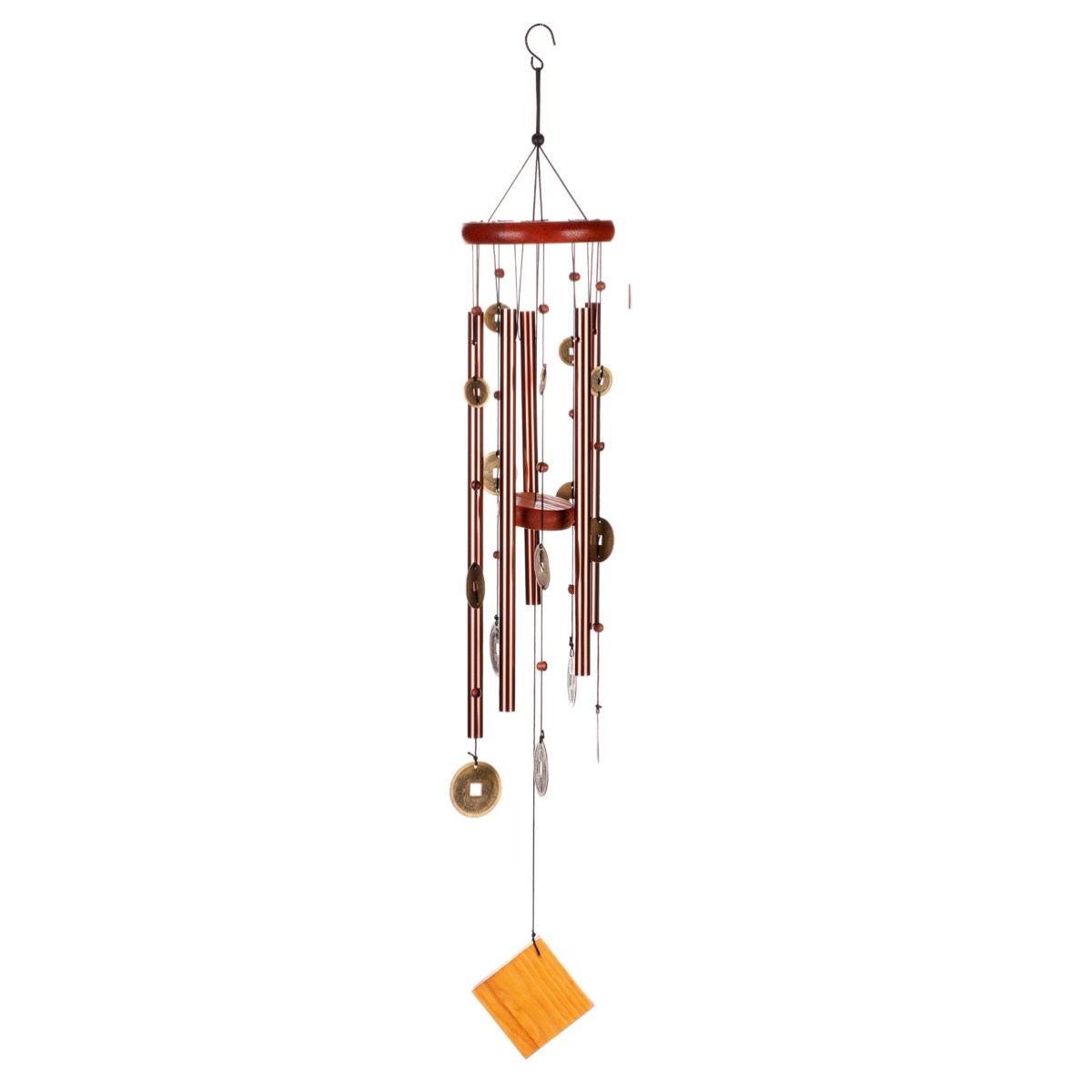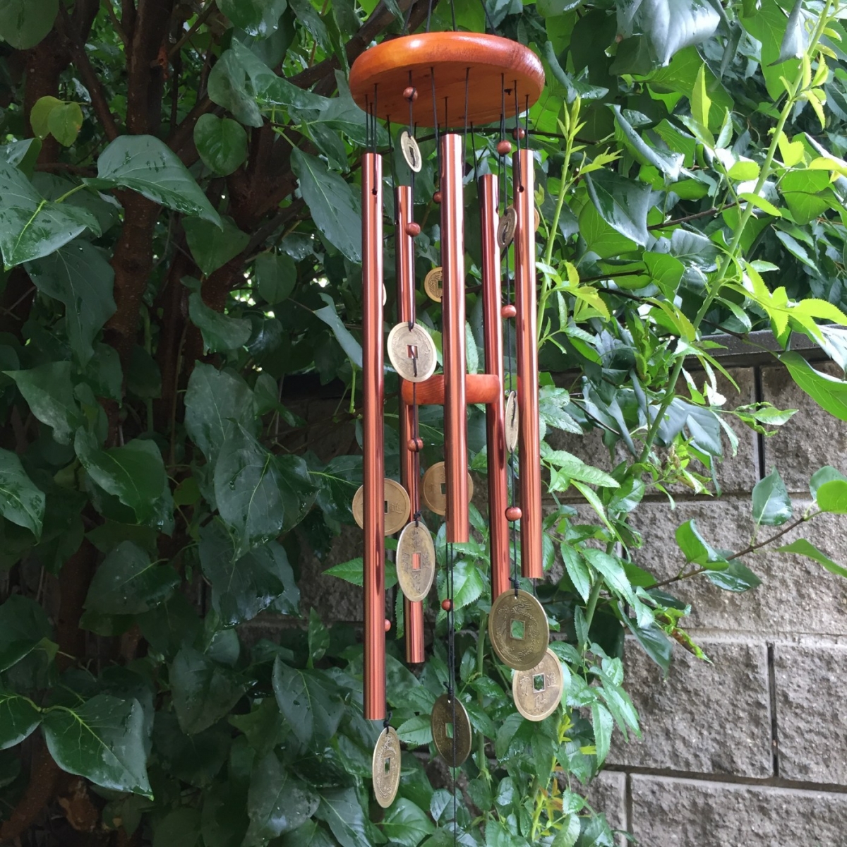 Větrná zvonkohra je složena z dřevěných částí, kovových trubiček různých délek a čínských mincí štěstí, které se při každém závanu větru rozezní jemným zvukem připomínajícím doslova andělské zvonění.