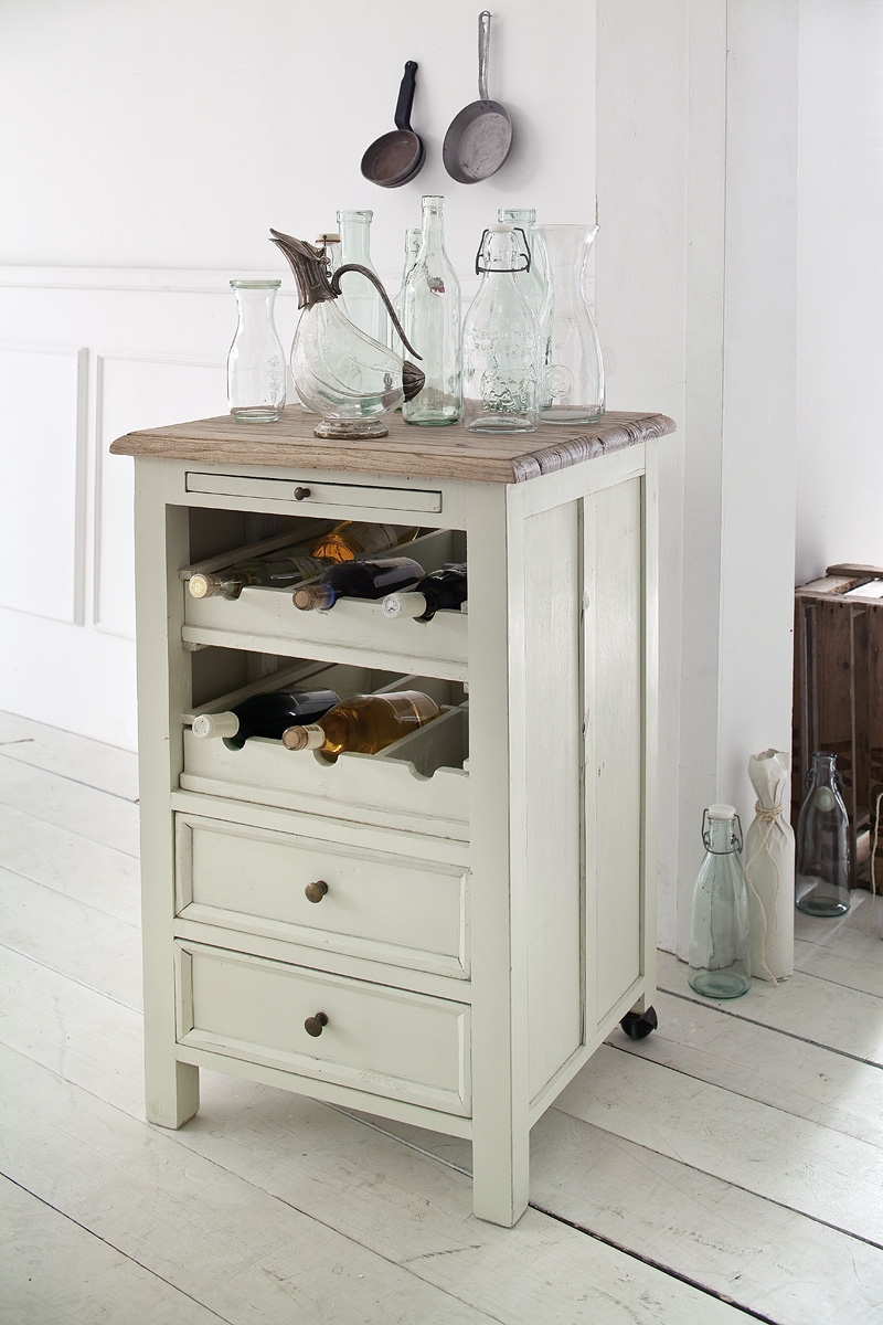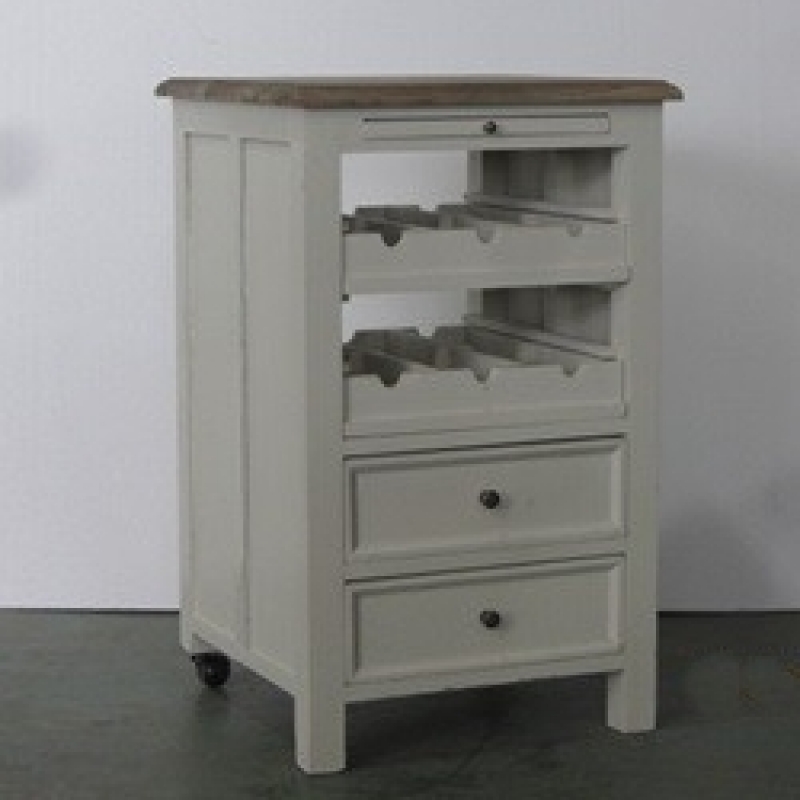 Komoda v bílé barvě s patinou má ve spodní části dva šuplíky a v horní dvě otevřená okna s držáky na láhve vína (celkem na 6 lahví). Těsně pod deskou stolu je malinký šuplíček.