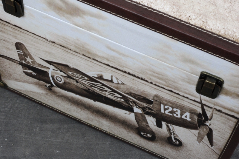 Kufr má ze všech stran fotografie letadla. Na přední straně má dvě západky a na stranách kovové úchyty. Rojy kufru jsou potaženy hnědou koženkou se zlatými nýty.