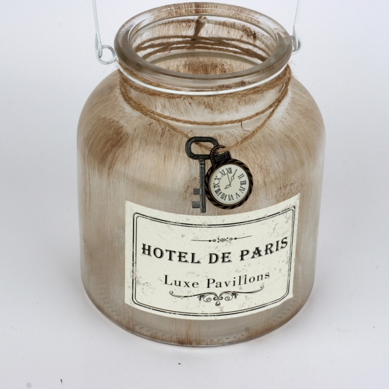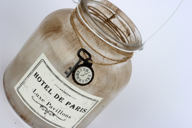 Svícen s nedokonalým nátěrem, starou etiketou a hrdelm ozdobeným malými kovovými přívěsky je dokonalým doplňkem do interiérů ve stylu vintage. Ve stejném designu je v nabídce další svícen a láhev.