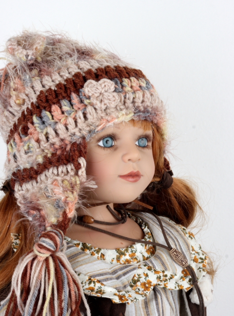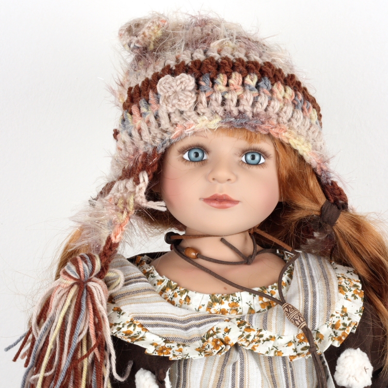 Panenka má dlouhé plavé oči a blankytně modré oči. Kolem krku má ozdobný koženkový provázek s korálky.