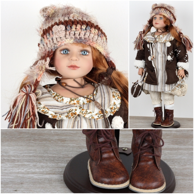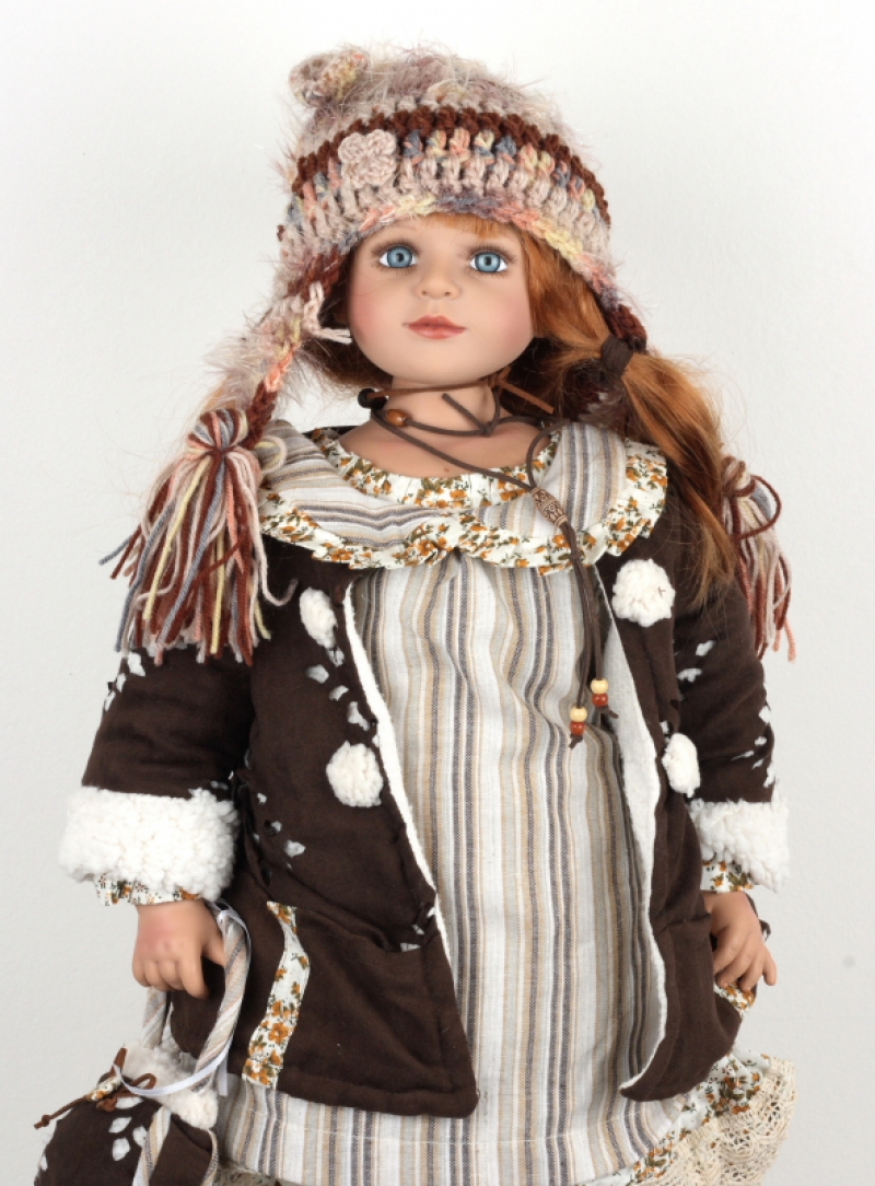 Vinylová panenka Agáta 72cm s teplou pletenou čepicí, kabátem a taštičkou v ruce.