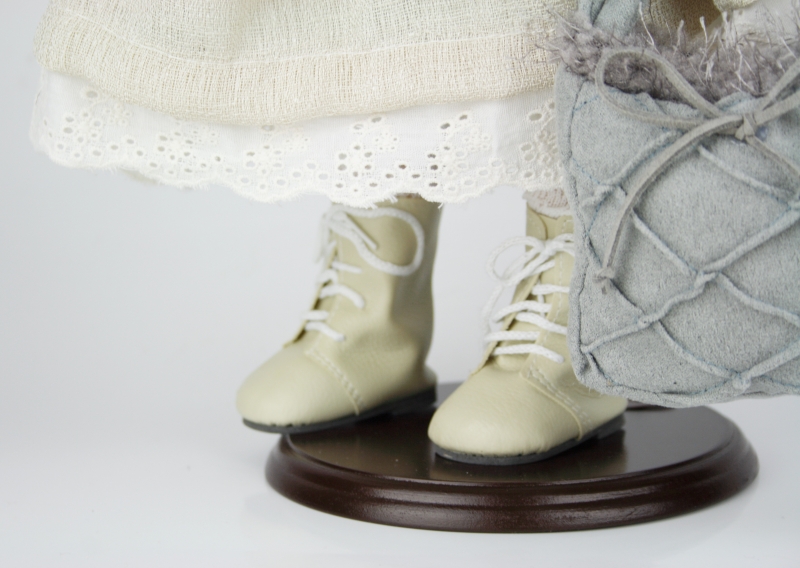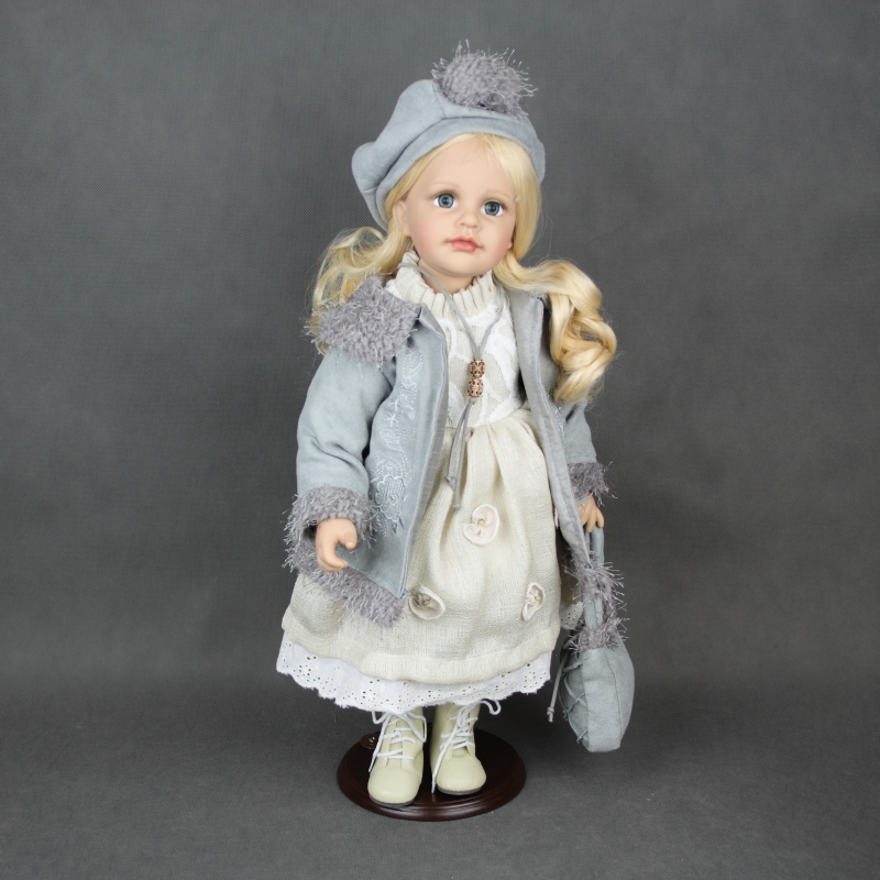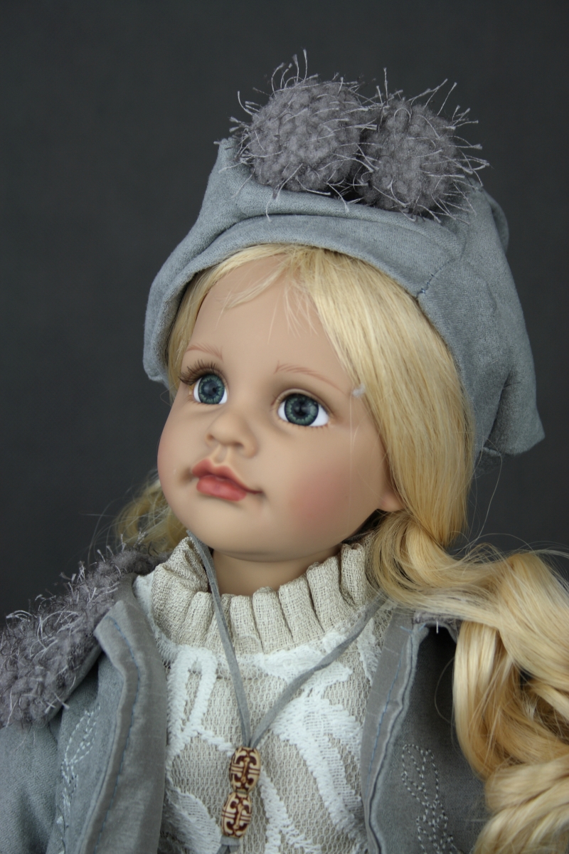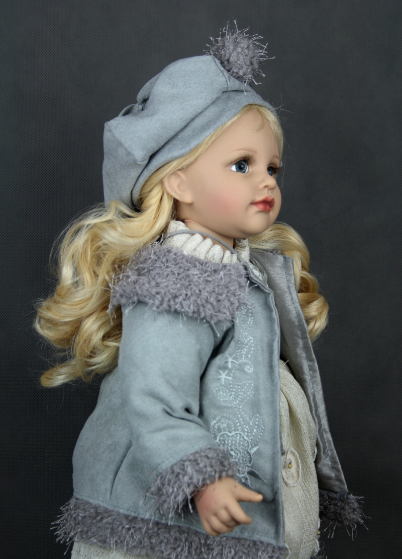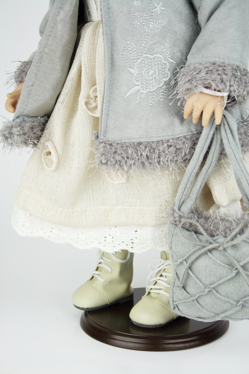 Vinylová panenka jménem Mia měří 53cm. Je oblečena do bílo-hnědých šatů s krajkovými aplikacemi a do šedého kabátku, který je lemován kožíškem. Ke kabátku ladí čepec i kabelka.