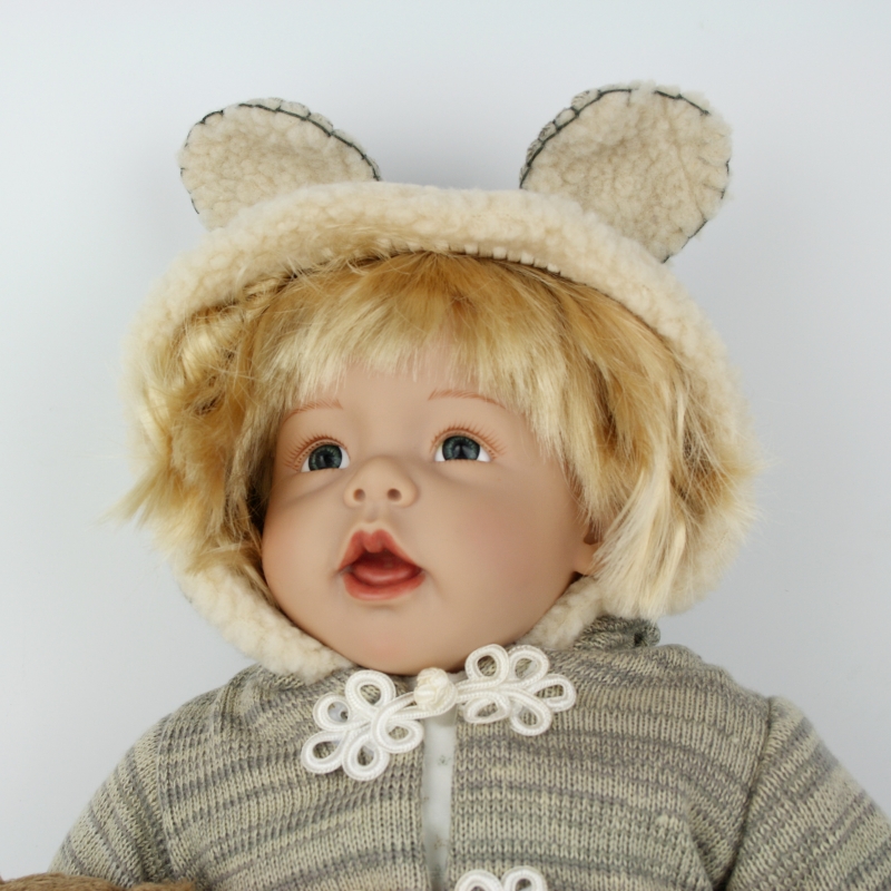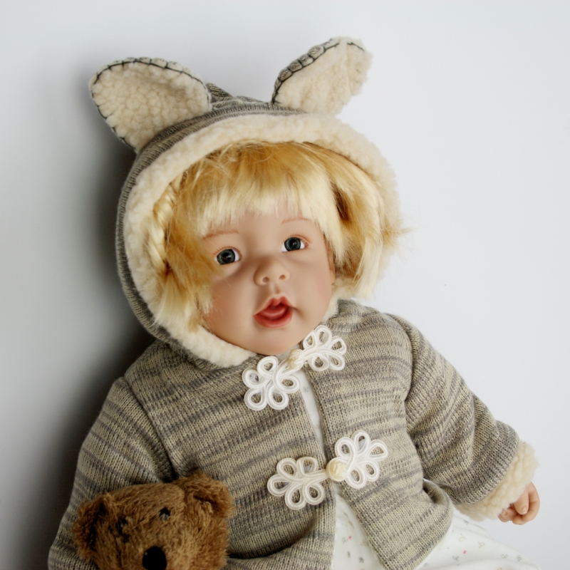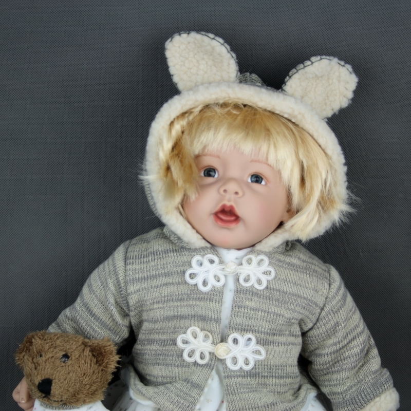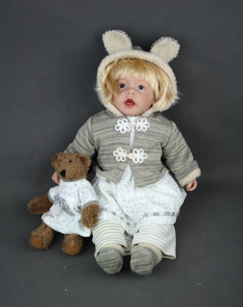 Pokud milujete panenky, nemělo by Vám toto roztomilé blonďaté miminko ve sbírce chybět. Panenka je oblečená do teplého kabátku s kapucí. Z obou stran knoflíků má našité kytičky a na kapuci ouška. Panenka má u sebe také svého oblíbeného medvídka. Spolu tvoří krásný pár.