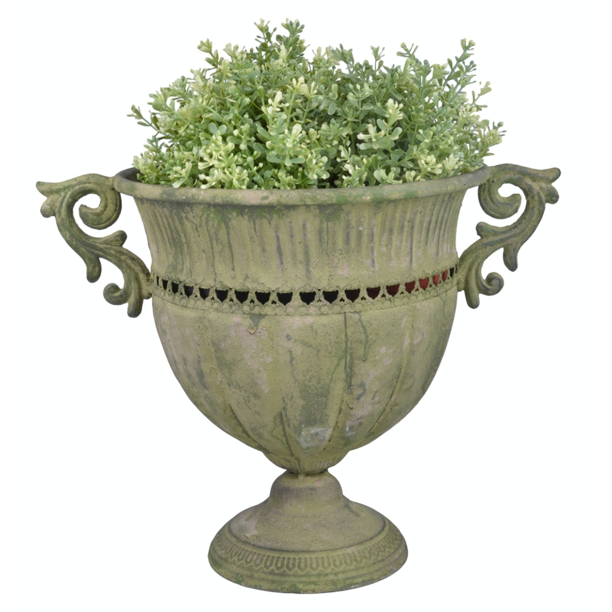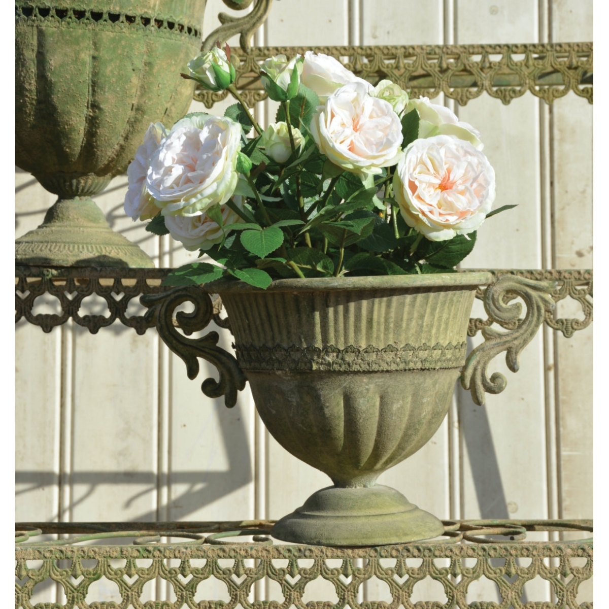 Kovová vysoká váza v antickém stylu s výraznou zelenou patinou bude krásným doplňkem Vaší zahrady nebo terasy. Ať už doplněná o živé nebo umělé květiny.