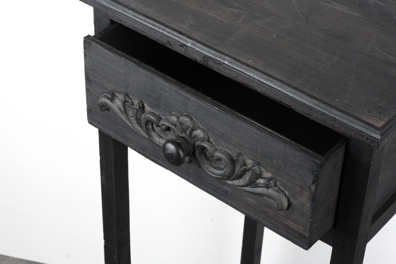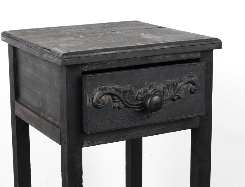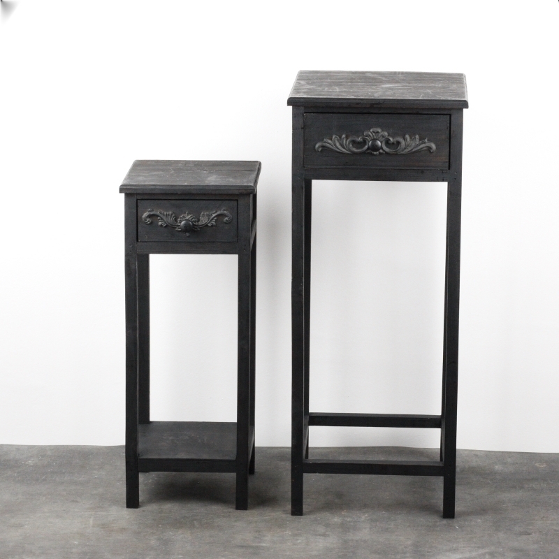 Vysoký odkládací stolek černý 2ks 67/82cm bude klenotem každého interiéru. Jeho netypická tmavá barva a zdobený ornament na šuplíku z něj dělá originální designový kousek.