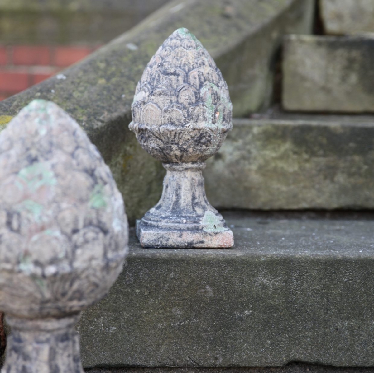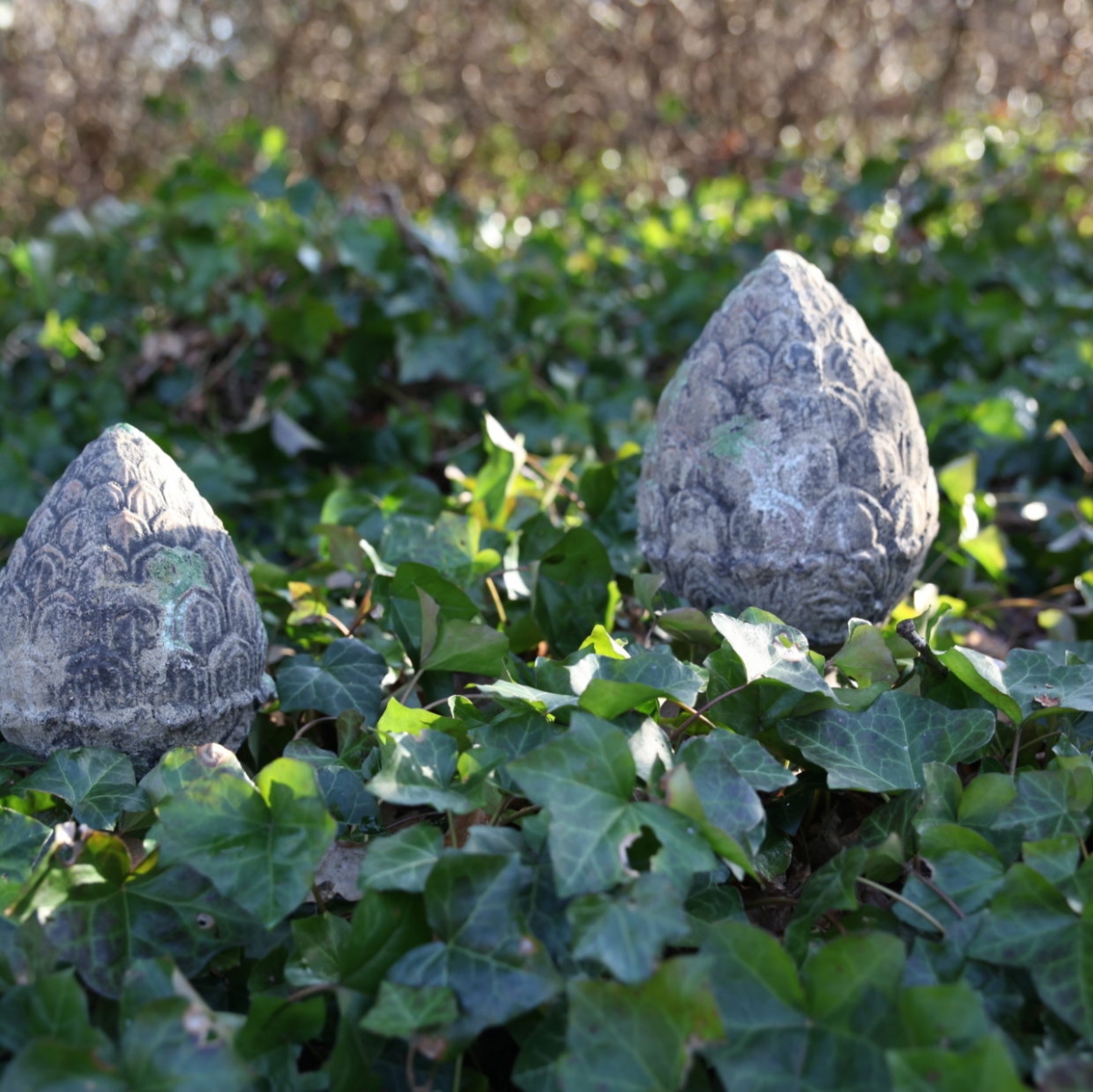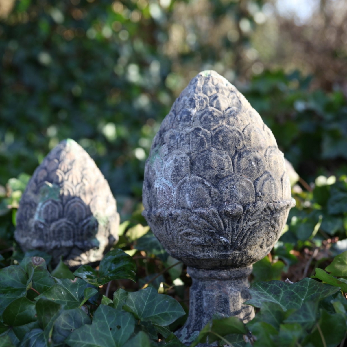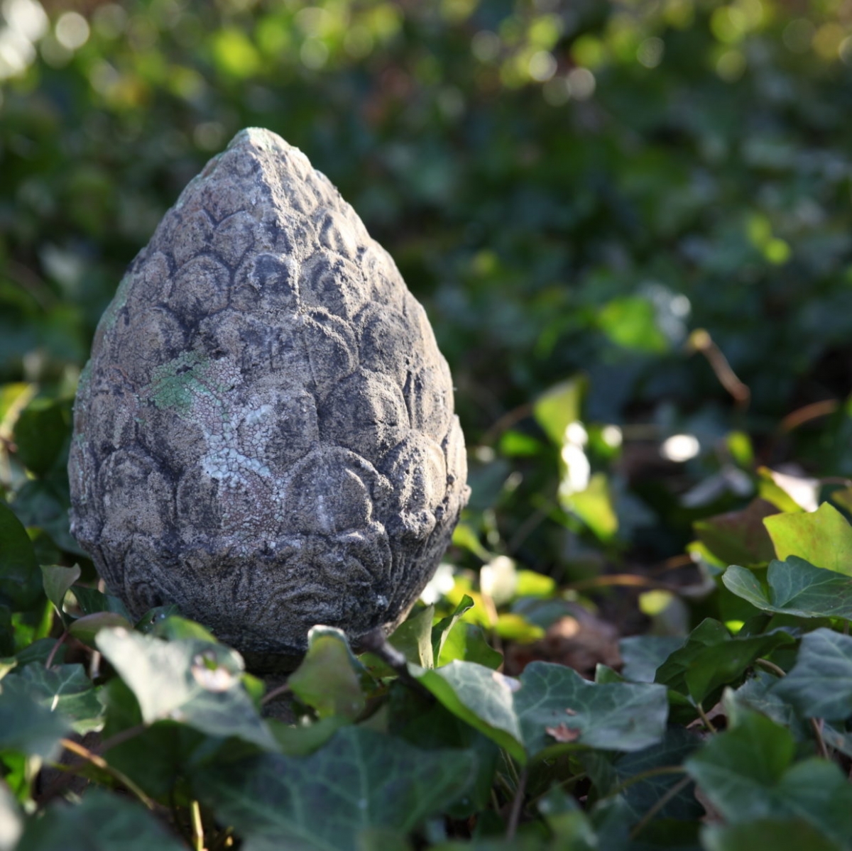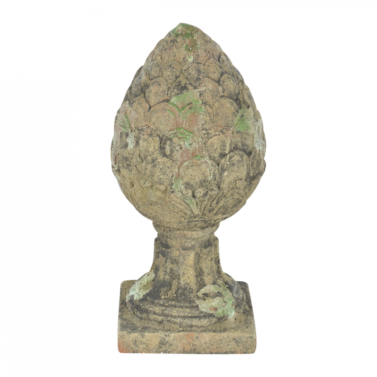 Povrch této zahradní dekorace je navíc opatřen specifickou patinou, díky níž vypadá šiška na podstavci, jako vytesaná z kamene a dlouhá desetiletí zapomenutá v zarůstající zahradě. Dokonce má na sobě i velmi realistický mech a lišejníky.