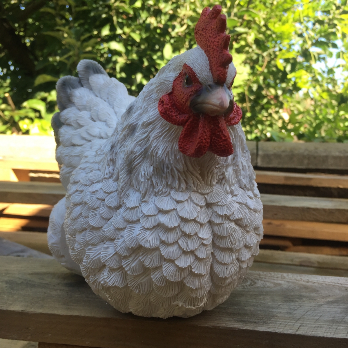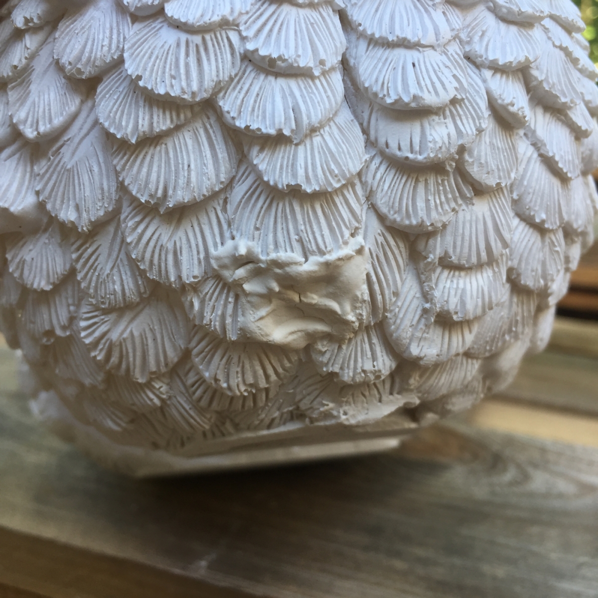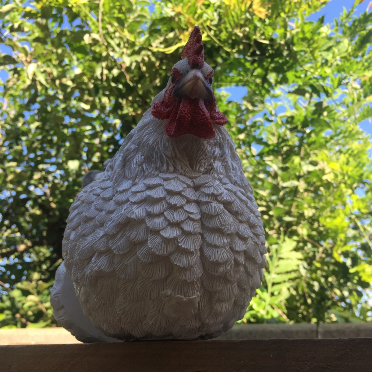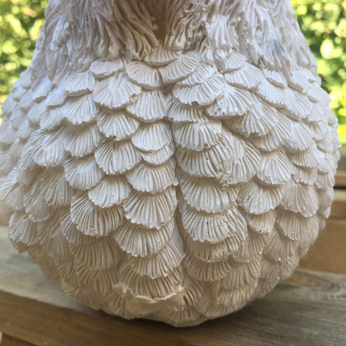 Zahradní dekorace v podobě bílé slepičky je vyřazená z důvodu poškození. Promáčknuté tělo slípky (foto 7-8) bylo námi opraveno tmelem, malou podélnou prasklinu (foto 8) můžete zalít troškou vteřinového lepidla.