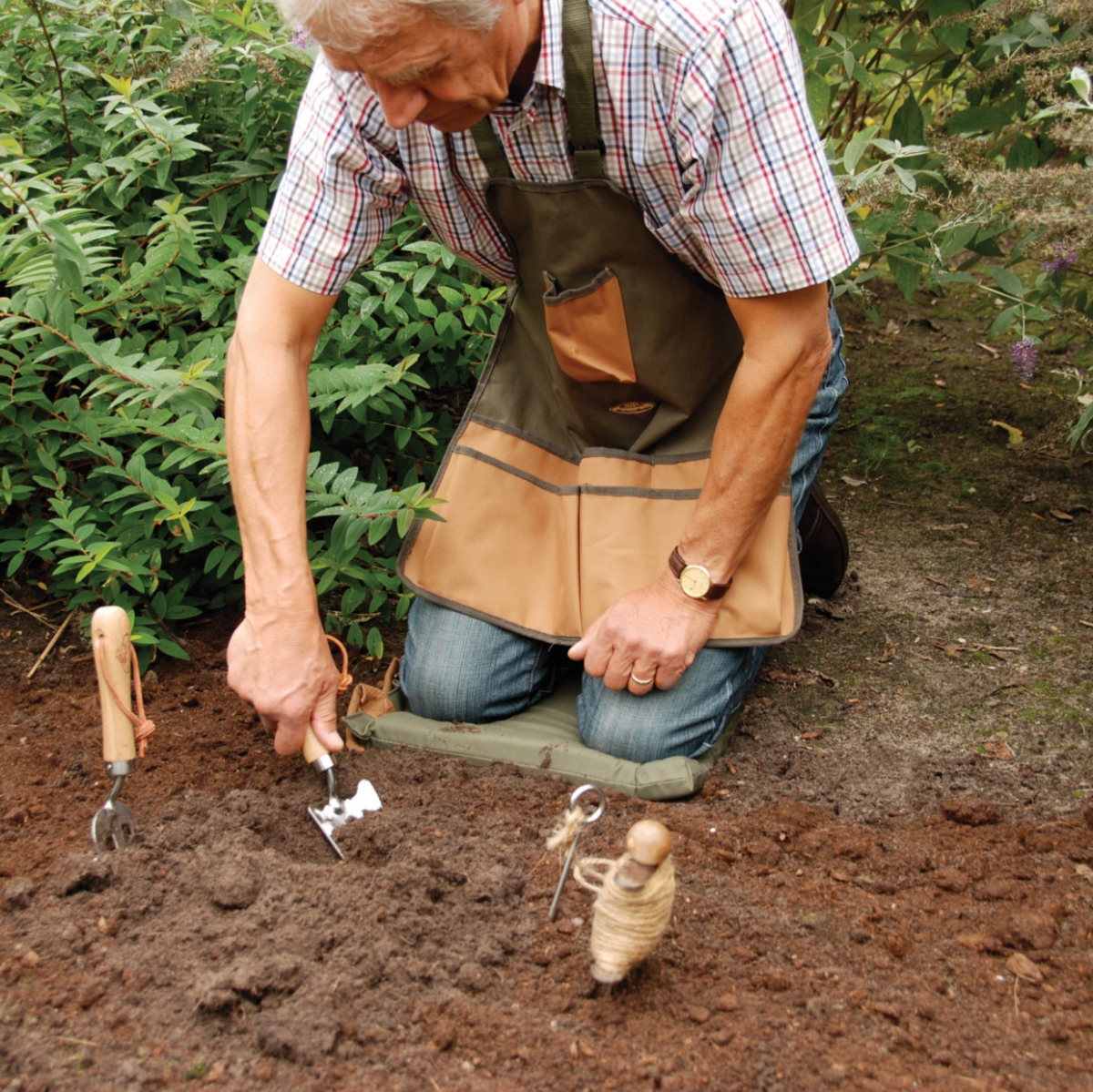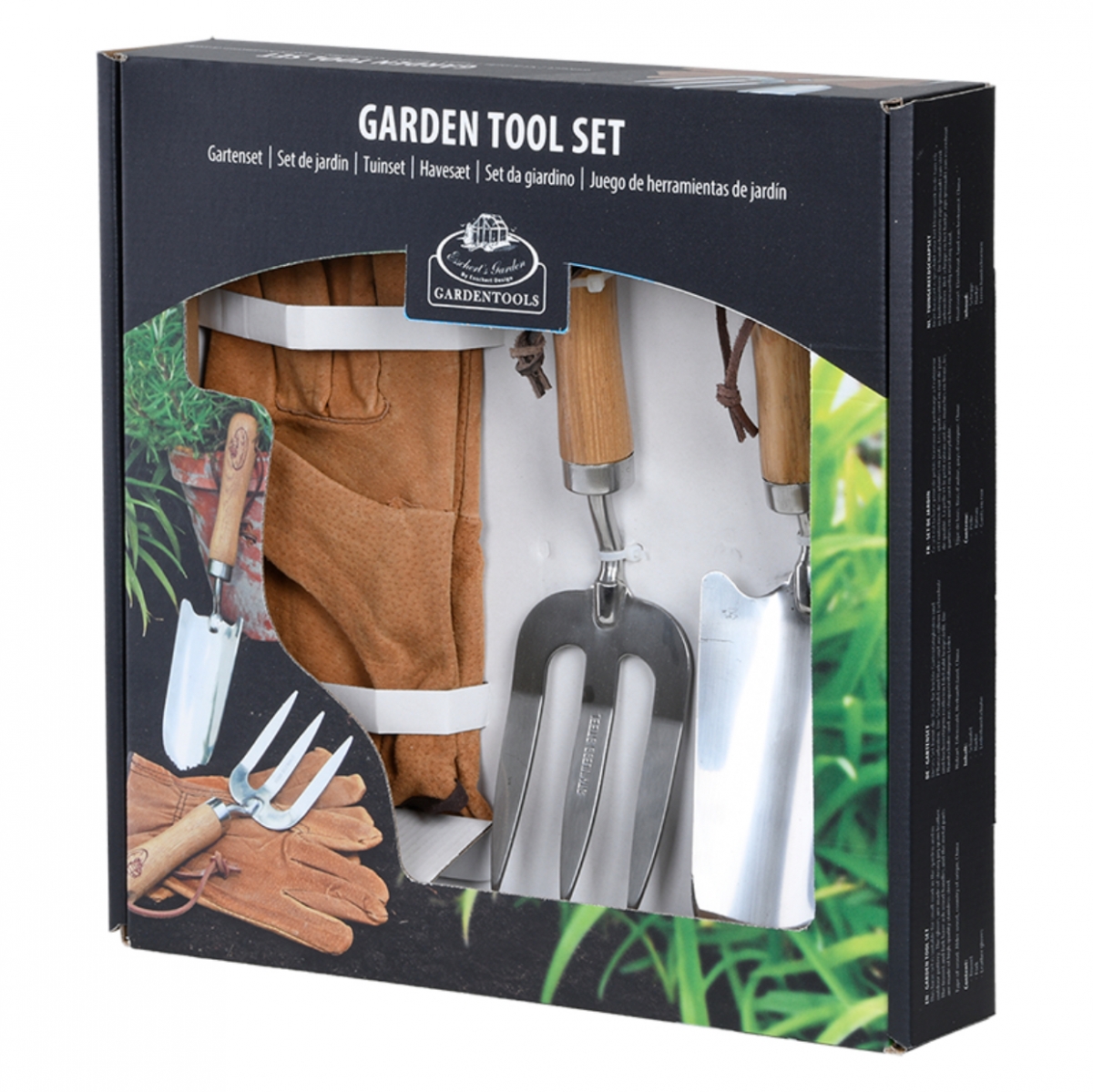 Sada zahradního nářadí obsahuje jednu ocelovou lopatku se špičatou čepelí a dřevěnou rukojetí, jedny ocelové ruční hrabičky se třemi hroty, a také dřevěnou rukojetí a pár kožených zahradních rukavic. Vše zabalené v krabici.
