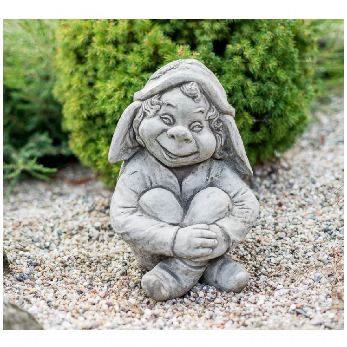 Zahradní socha sedícího skřítka z betonu