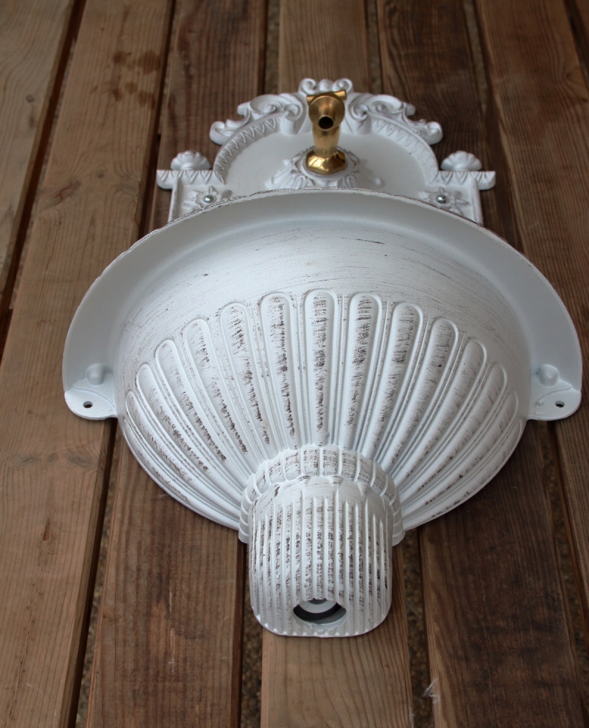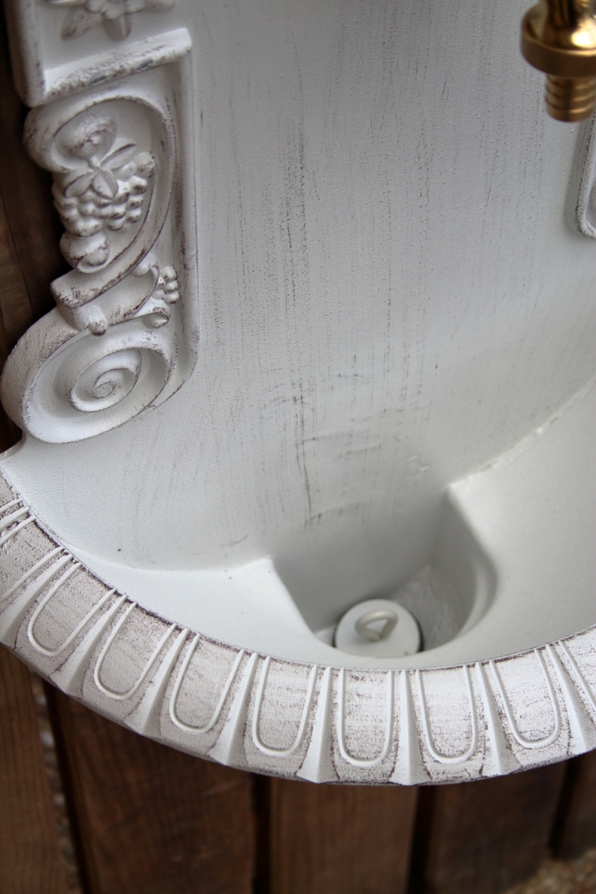 Zahradní umyvadlo s patinou na povrchu.