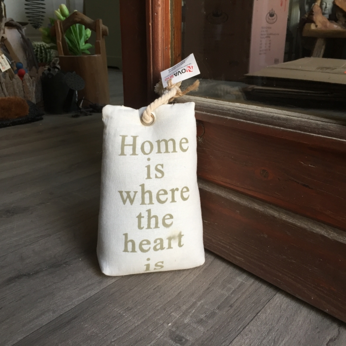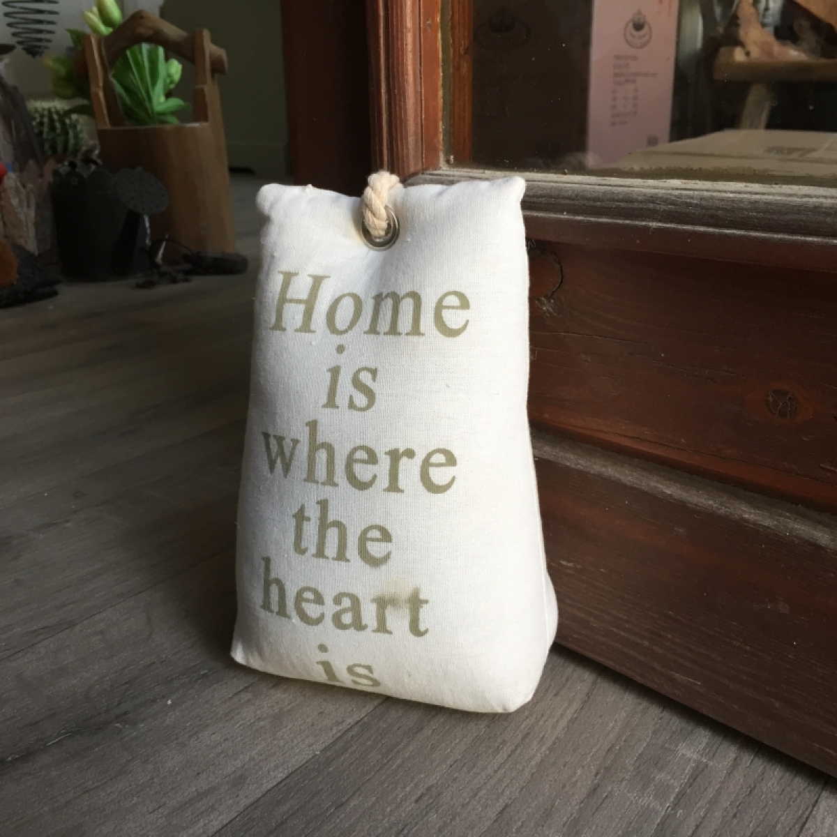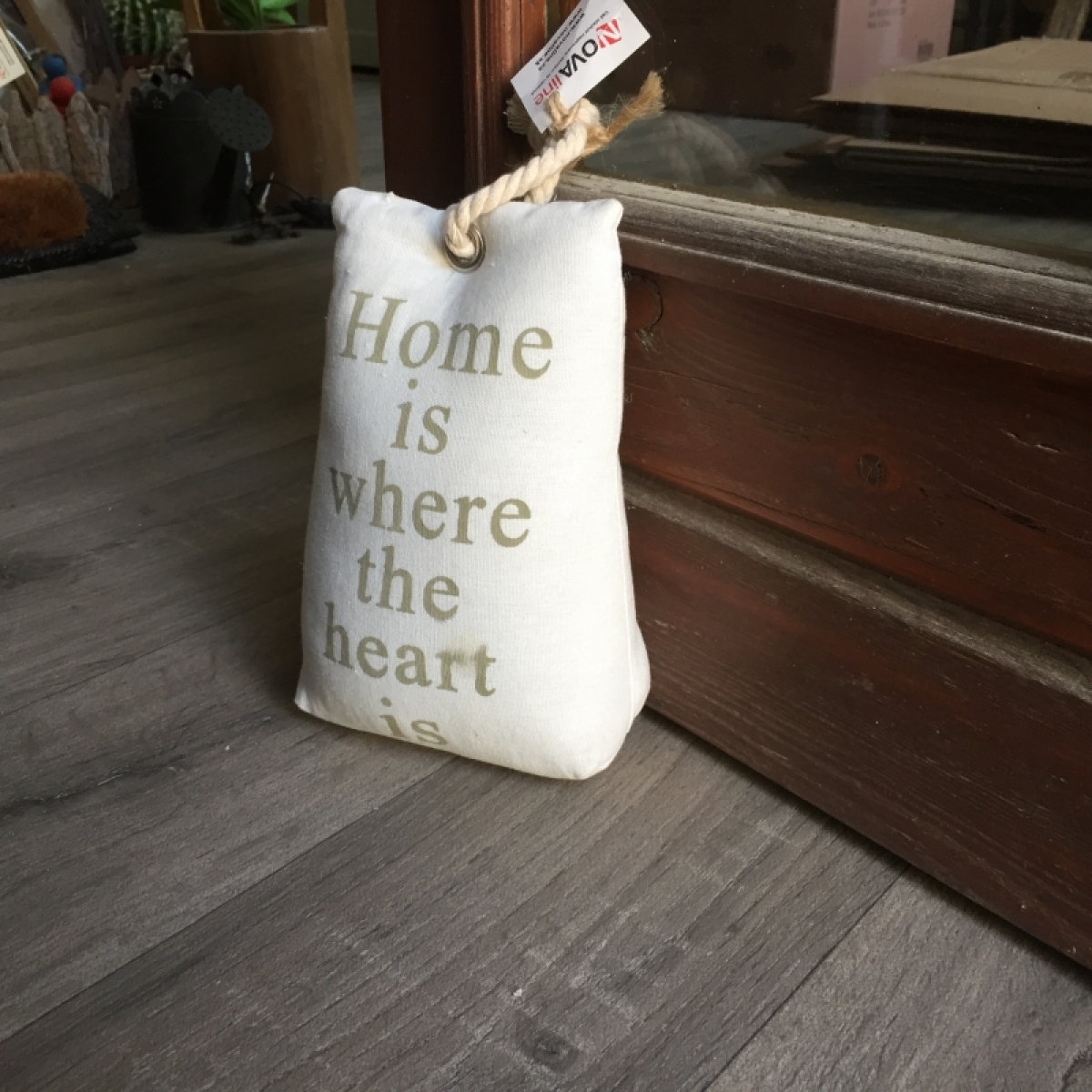 Zarářka ve tvaru pytle je naplněna pískem. Je ušita z krásné látky s nápisem HOME IS WHERE THE HEART IS. Použité neutrální odstíny jsou vhodné do každého interiéru.