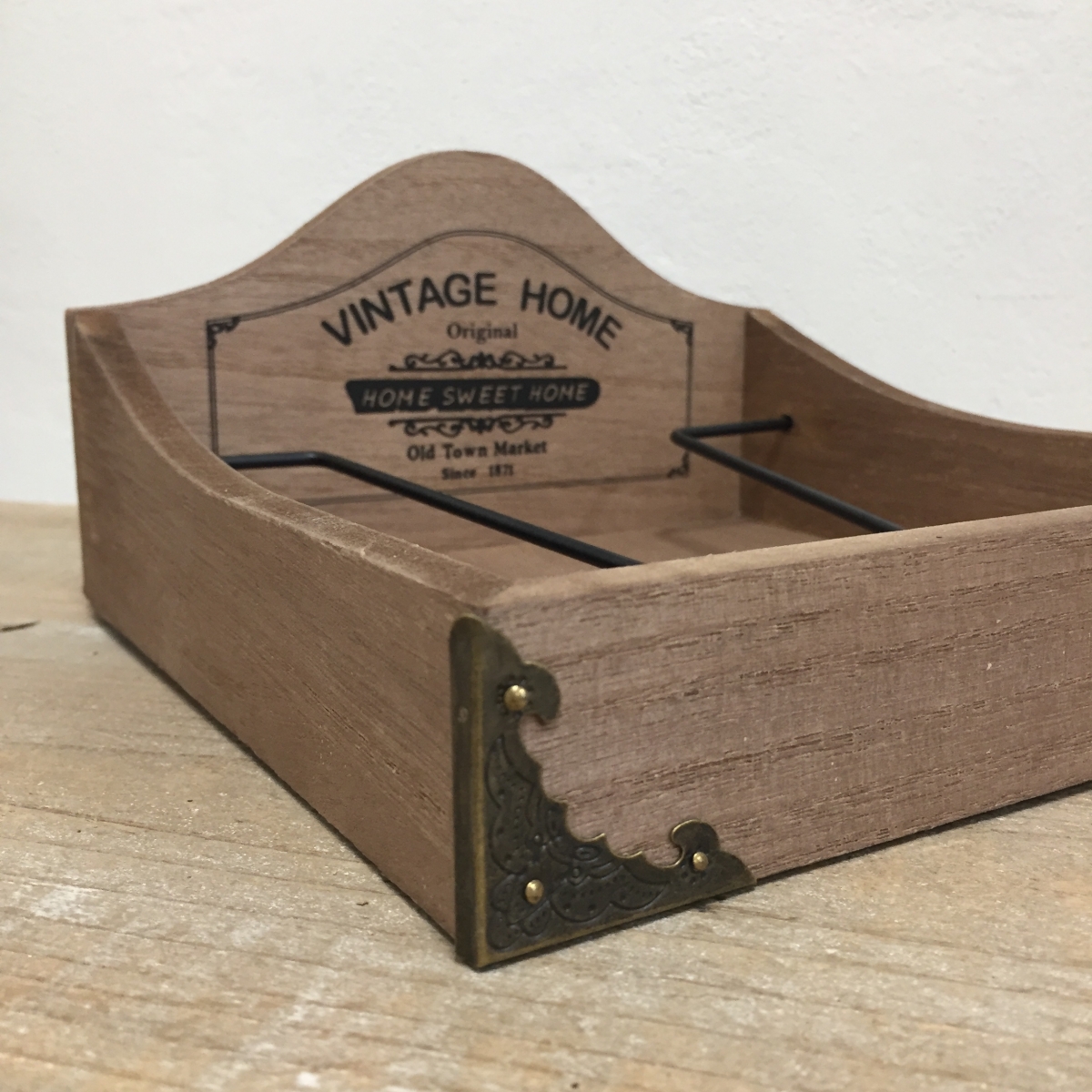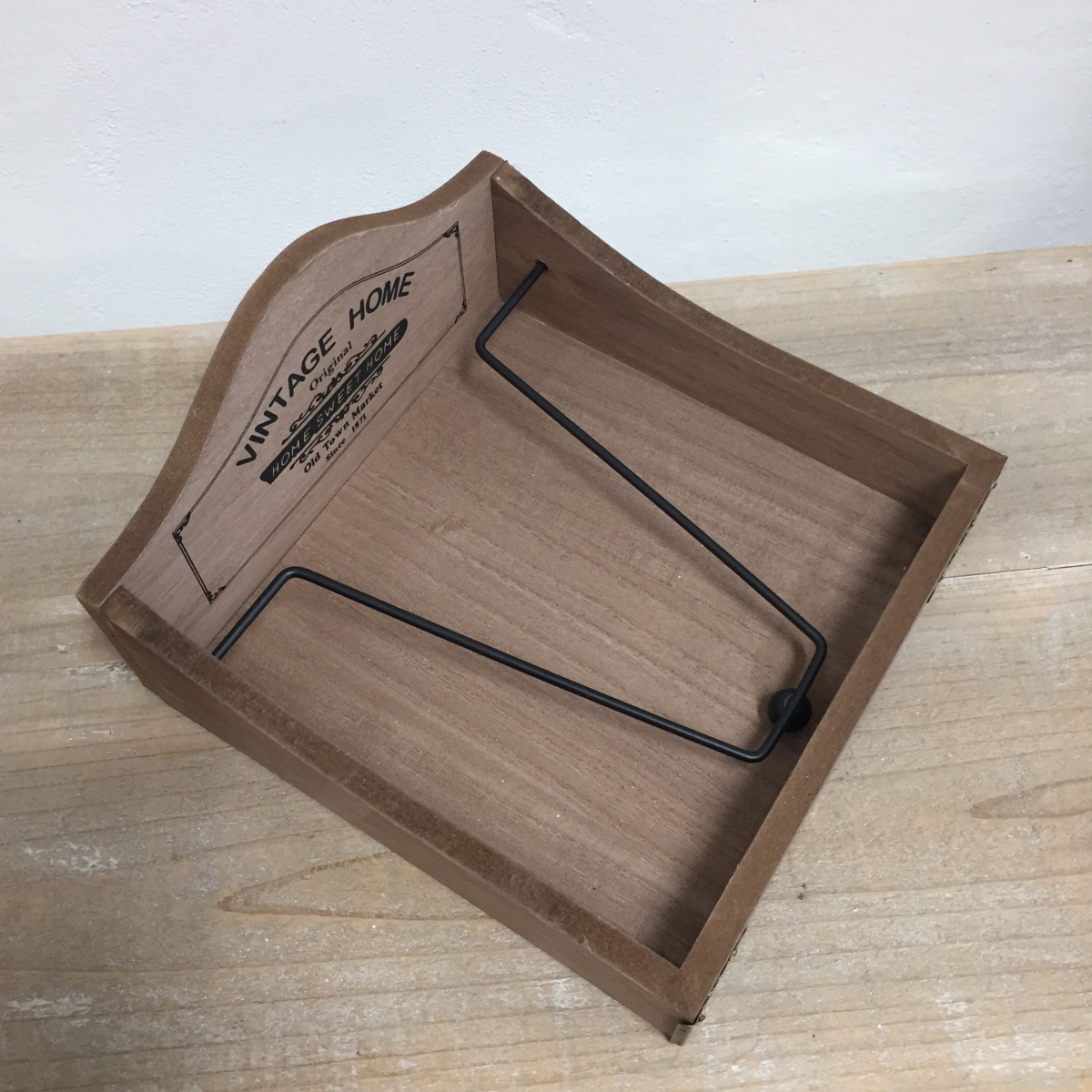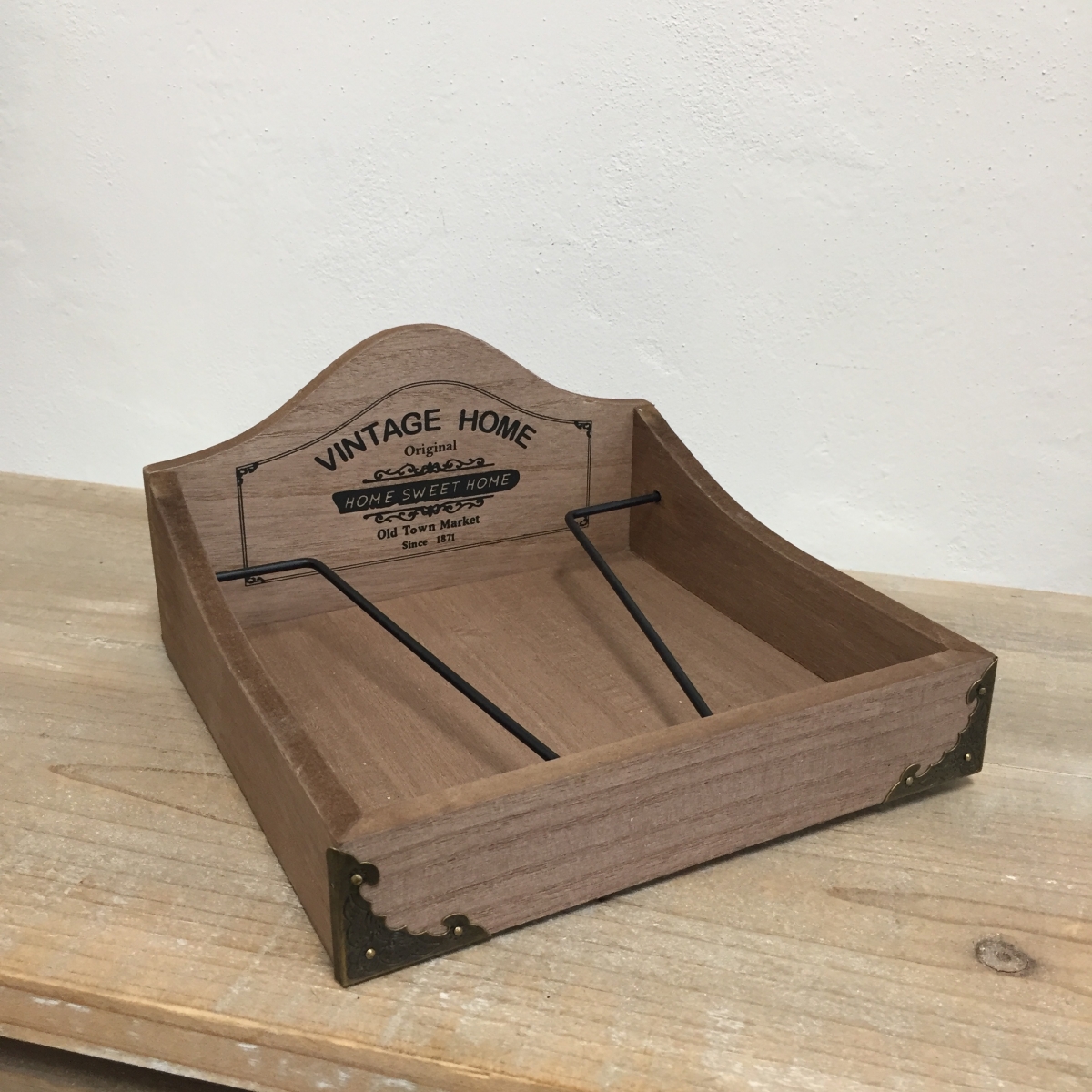 Zásobník na ubrousky vyrobený ze dřeva s nápisem VINTAGE HOME by neměl chybět v žádné kuchyni. Díky praktickému držáku se závažíčkem budou ubrousky pěkně ležet na místě a vy si můžete užívat posezení venku, bez otravného se honění za ubrousky poletujícími ve větru.