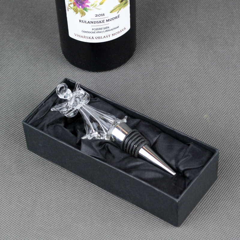Klasická kovová zátka s gumovým těsněním je doplněna o motiv andílka. Vhodné jako dárek - luxusní dárkové balení (černá papírová dárková krabička s černým lesklým textilem).