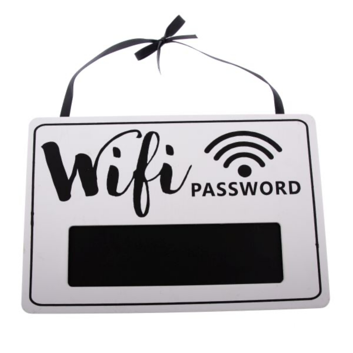 Praktická a zároveň pěkná závěsná cedule, na které jsou černě napsaná slova Wifi a password, společně s černým políčkem, kam můžete heslo vepsat. Podklad cedule je bílý, takže jsou na ní nápisy pěkně kontrastní.