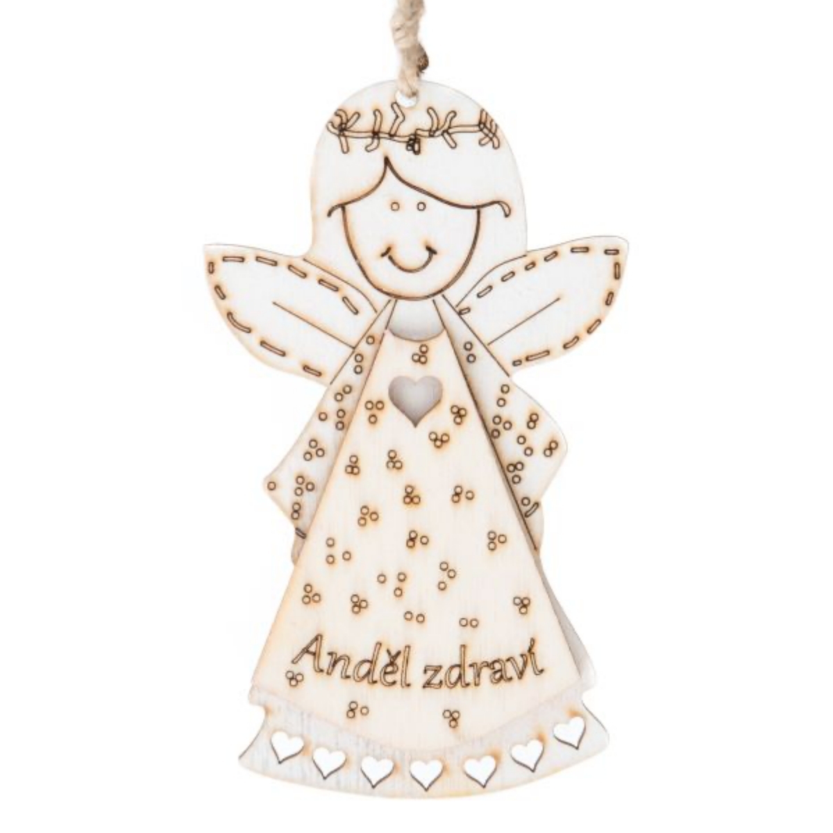 Závěsná dekorace Anděl zdraví přírodní s nápisem v 13 cm dřevěný