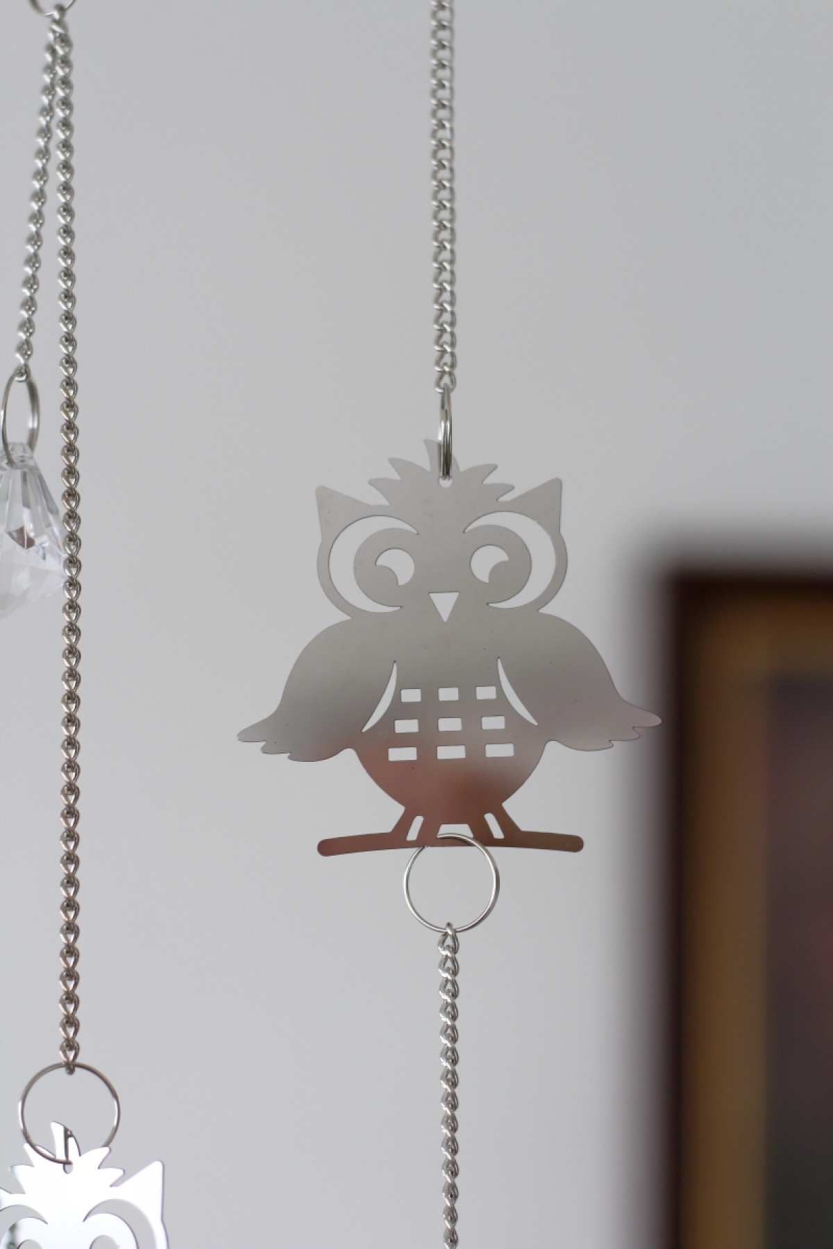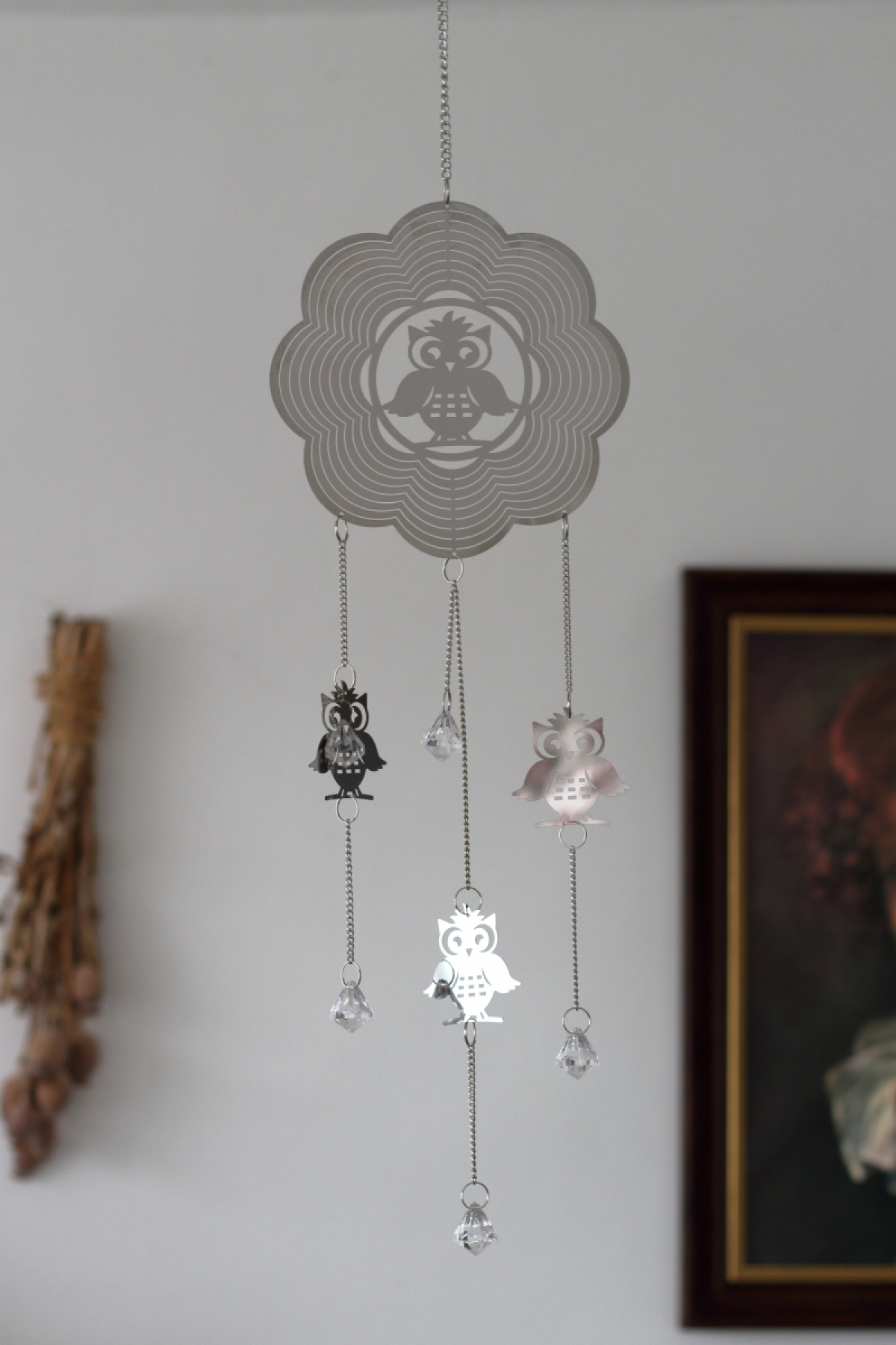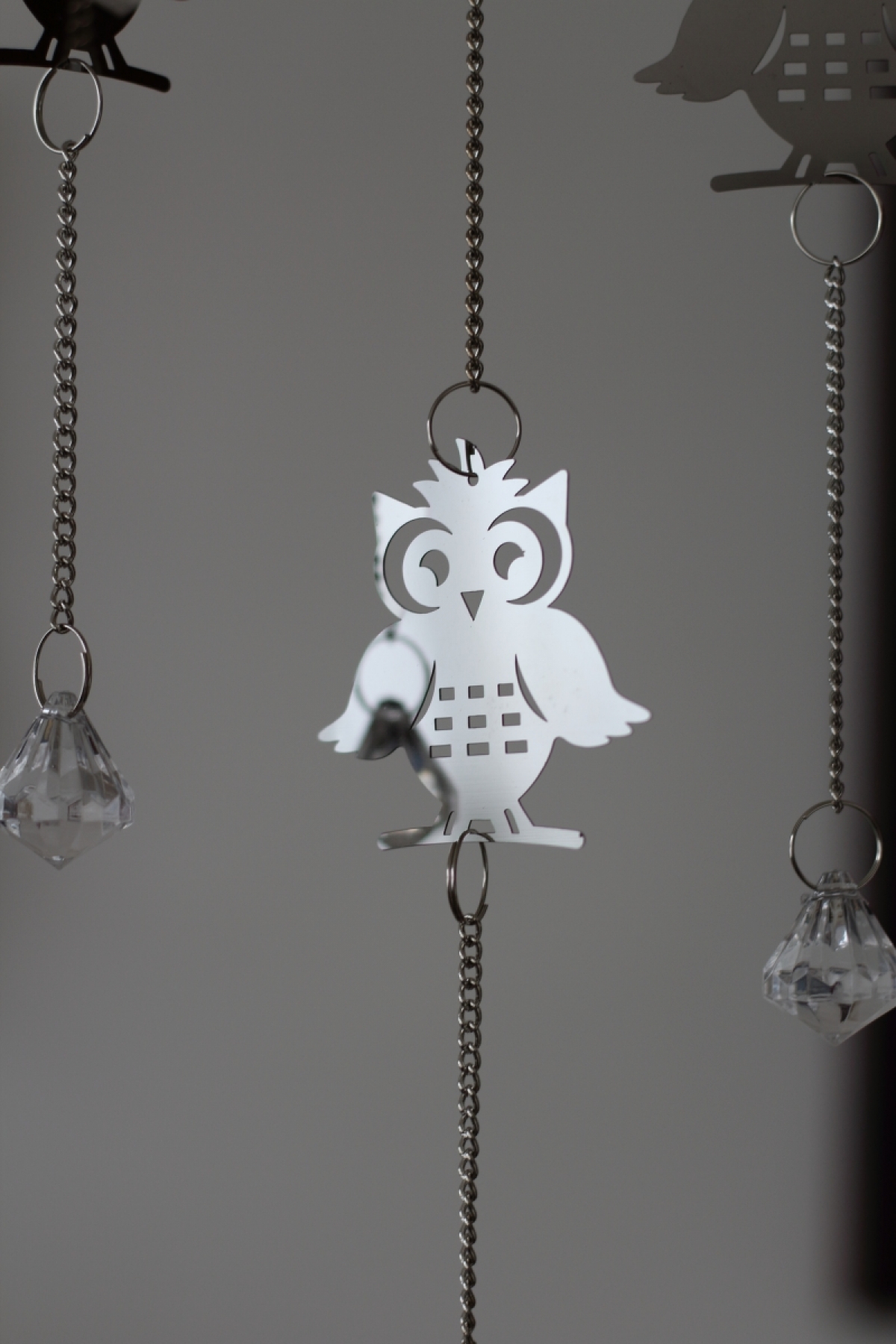 Závěsná dekorace sova na kovovém řetízku. Dekorace sova je vyrobená z plechu a zavěšená na kovovém řetízku.