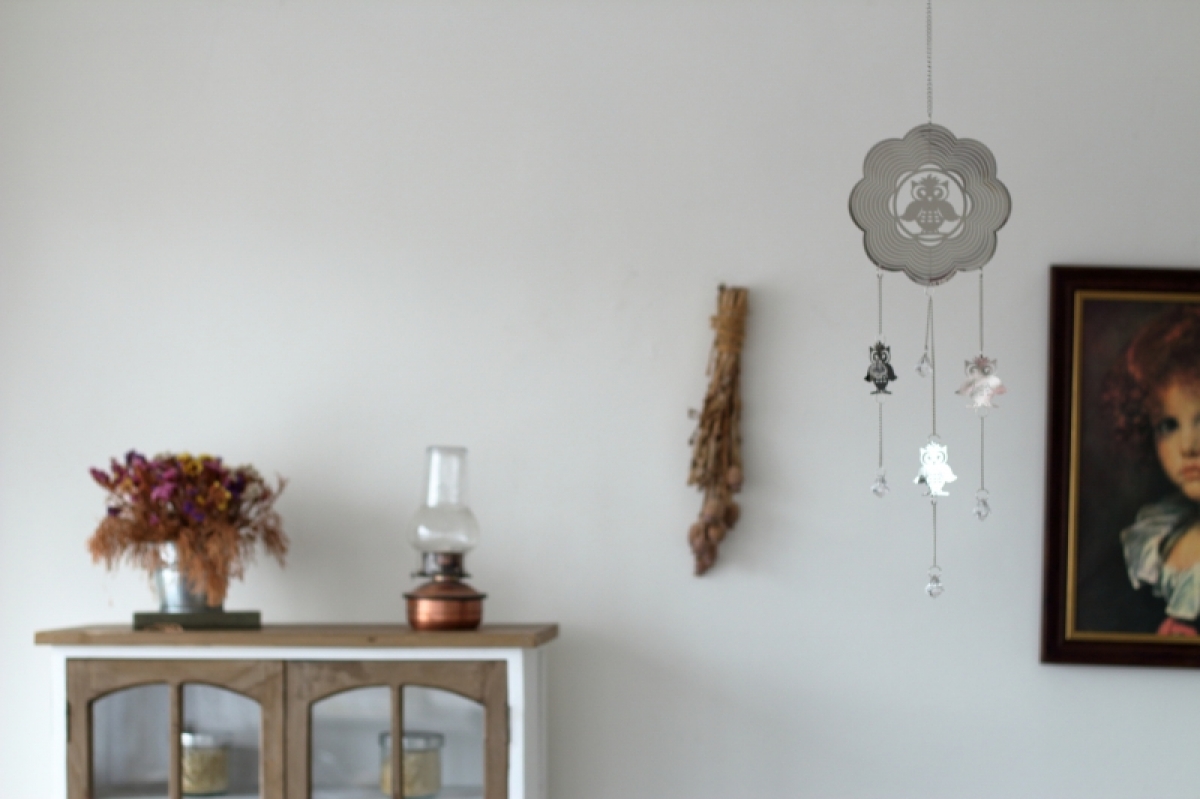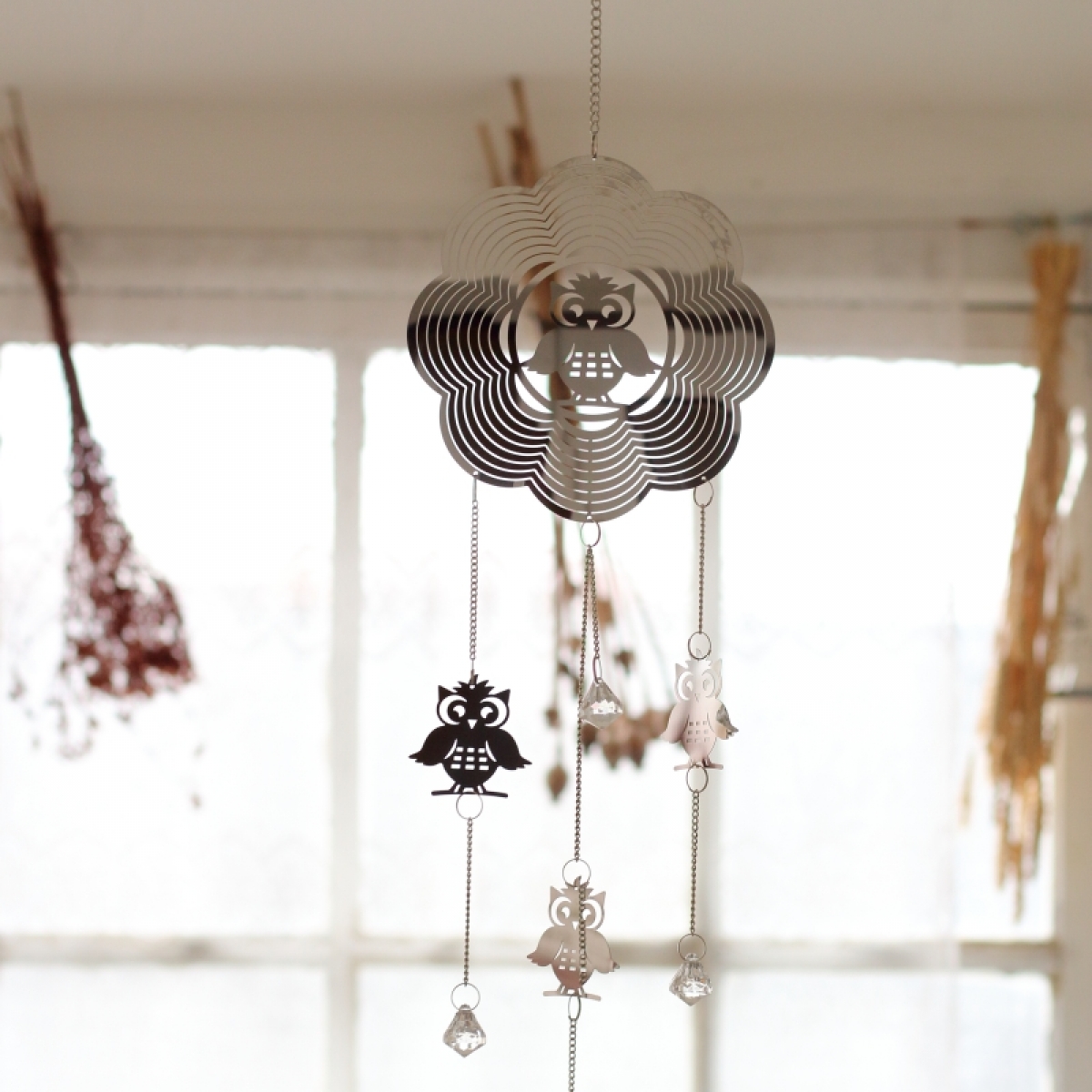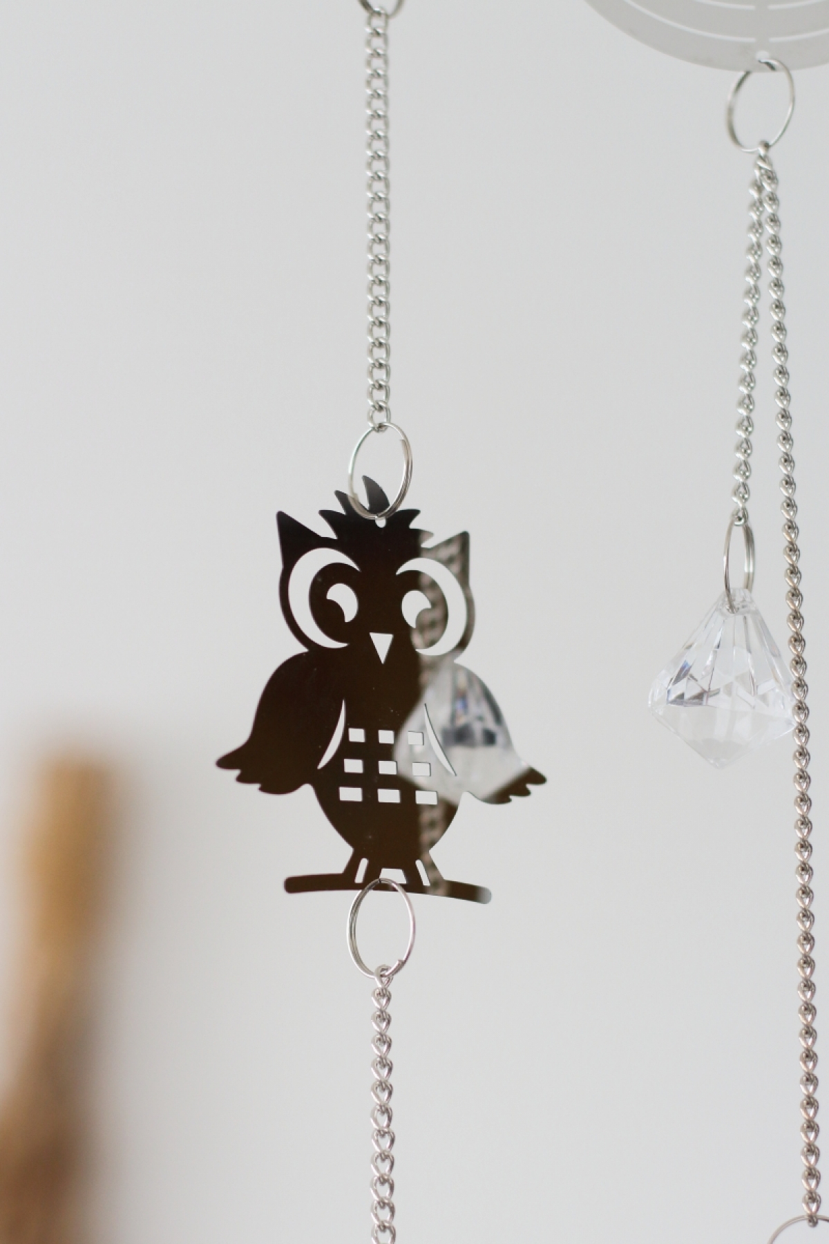 Závěsná dekorace sova na kovovém řetízku. Dekorace sova je vyrobená z plechu a zavěšená na kovovém řetízku.
