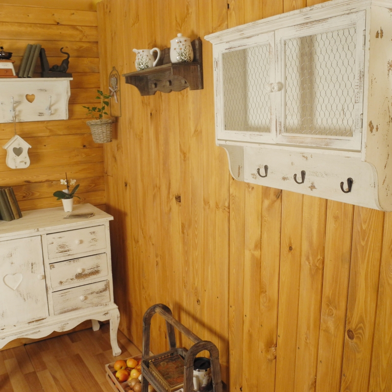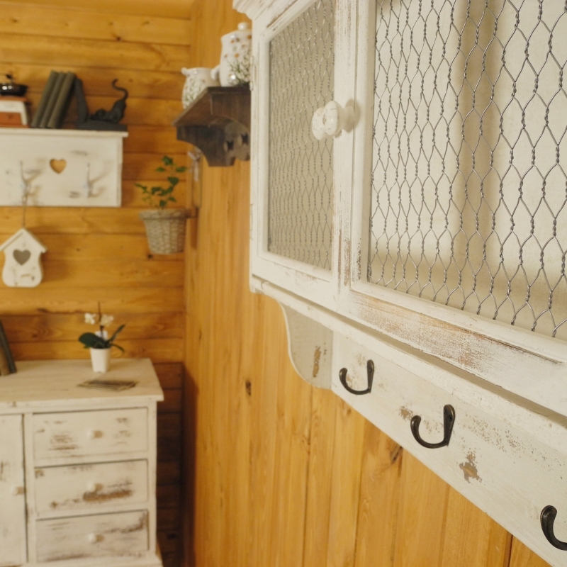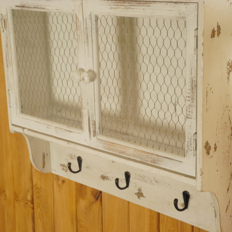 Ve spodní části bílé skříňky jsou zavěšeny tři praktické kovové háčky. Skříňka je vyrobena převážně ze dřeva, které má retro bílý nátěr.