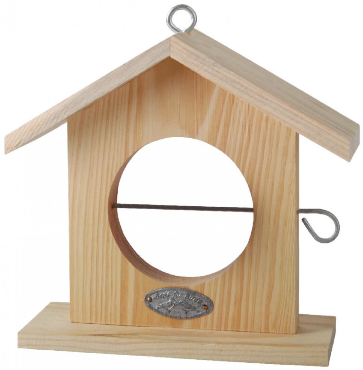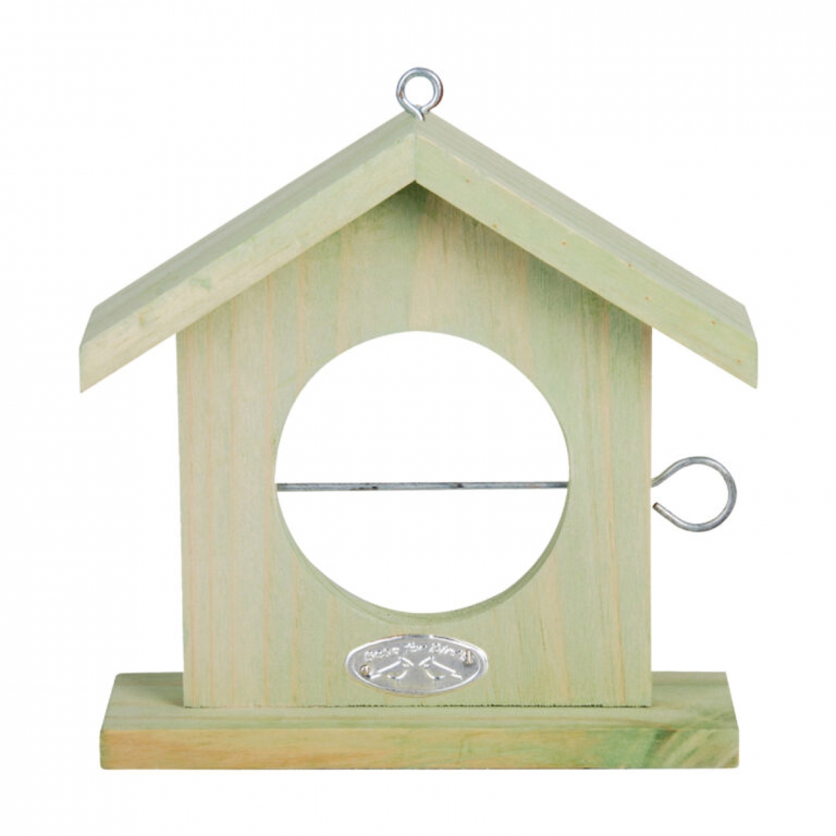 Krmítko pro ptáčky s kovovým očkem na vrchu stříšky pro zavěšení. V přírodní barvě s lehce zeleným nátěrem.