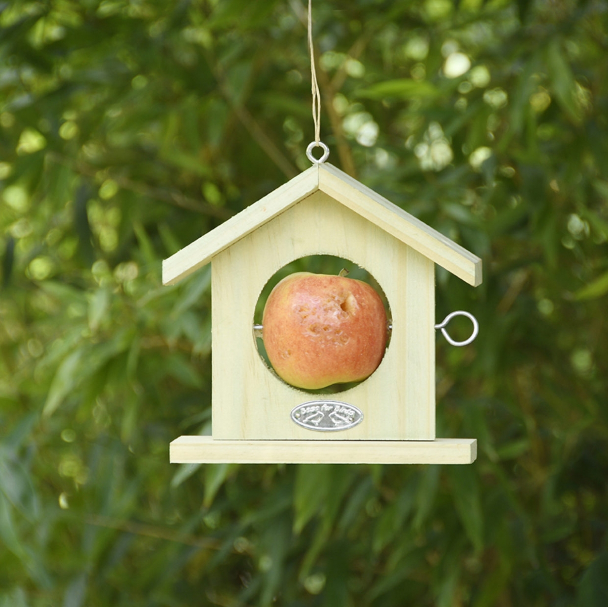 Krmítko pro ptáčky s vyřezaným otvorem na jablíčko s kovovou jehlicí pro napíchnutí požadovaného kusu ovoce nebo lojové krmné koule.