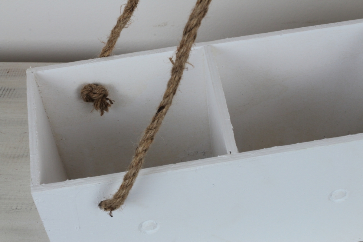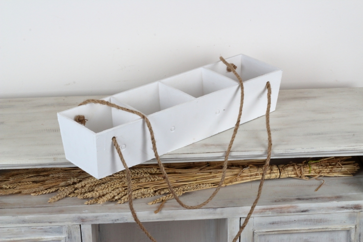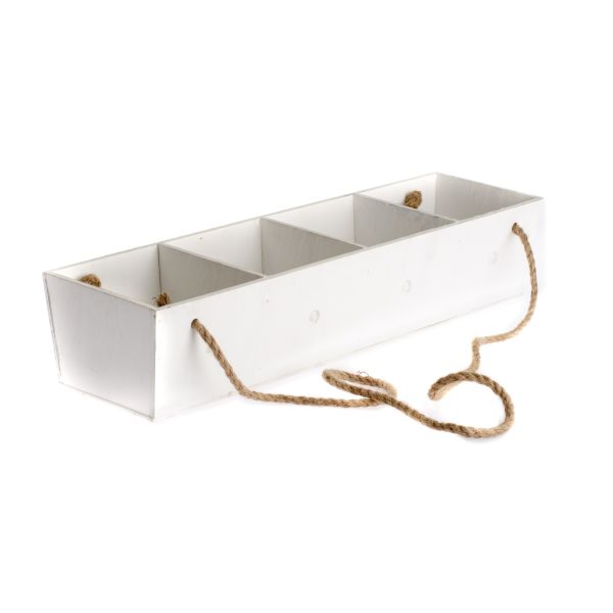 Dřevěný truhlík má dva provázky sloužící k zavěšení. Je rozdělen na 4 přihrádky, a tak můžete rosltiny od sebe snadno oddělit.