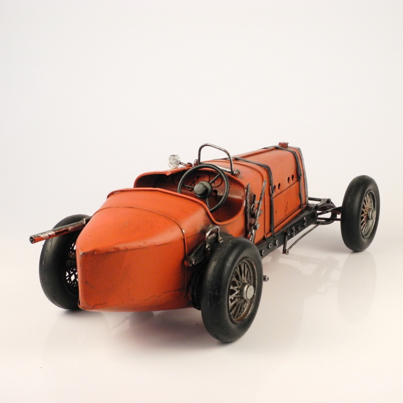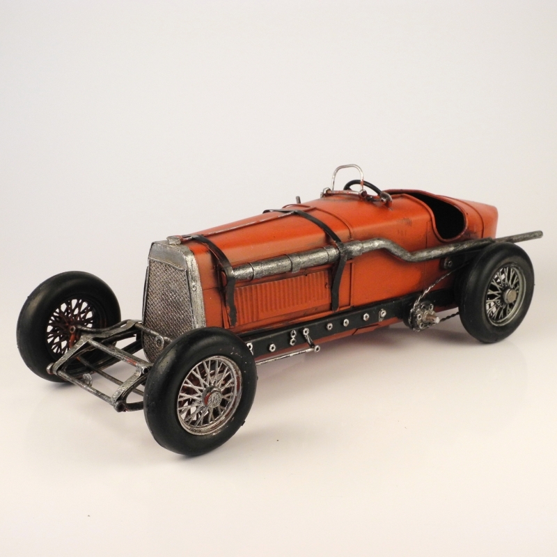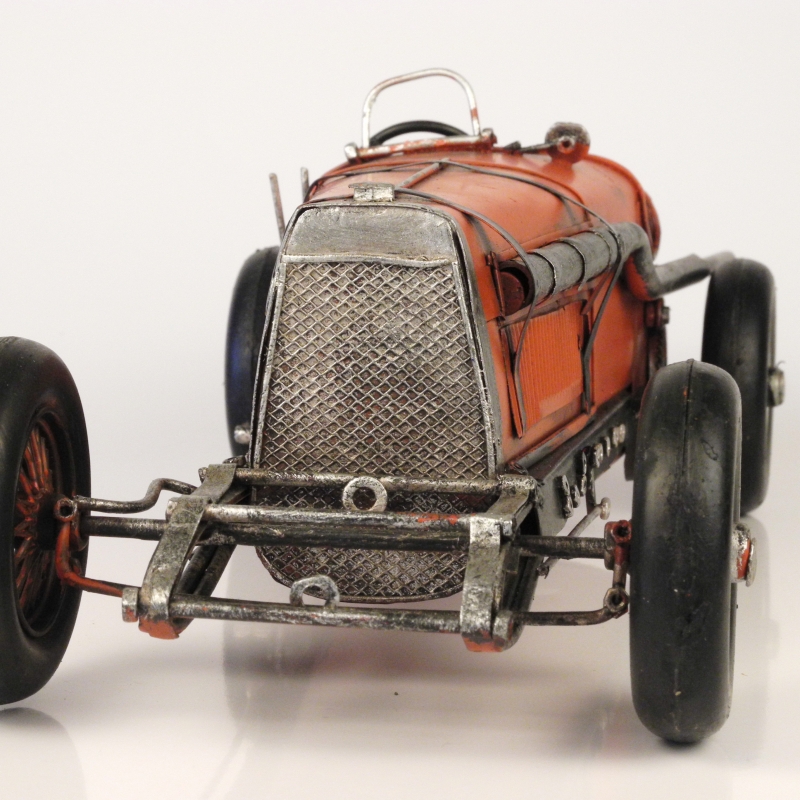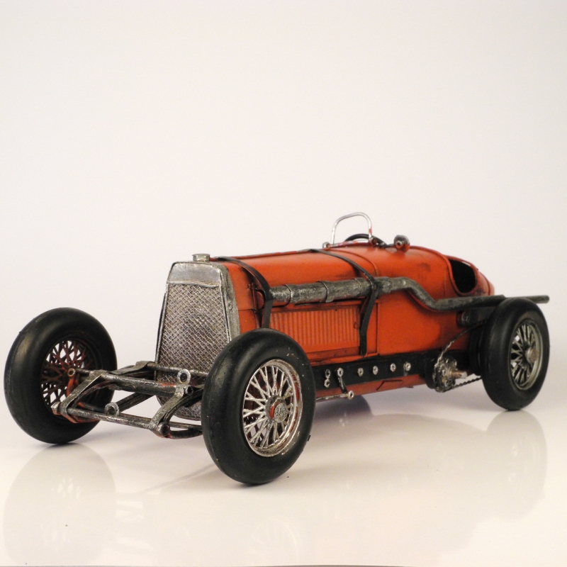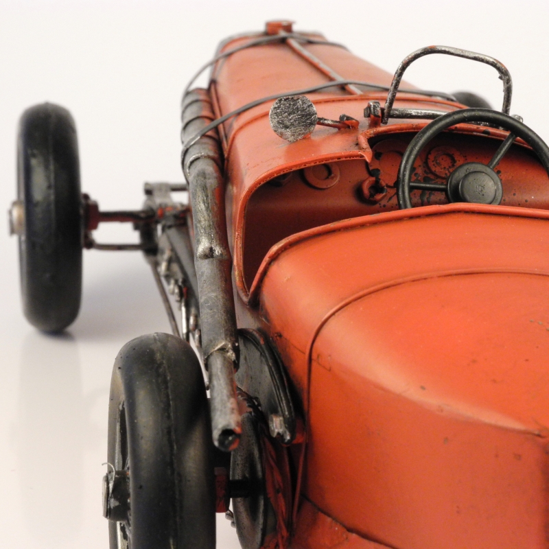 Auto je červené vyrobené z plechu.