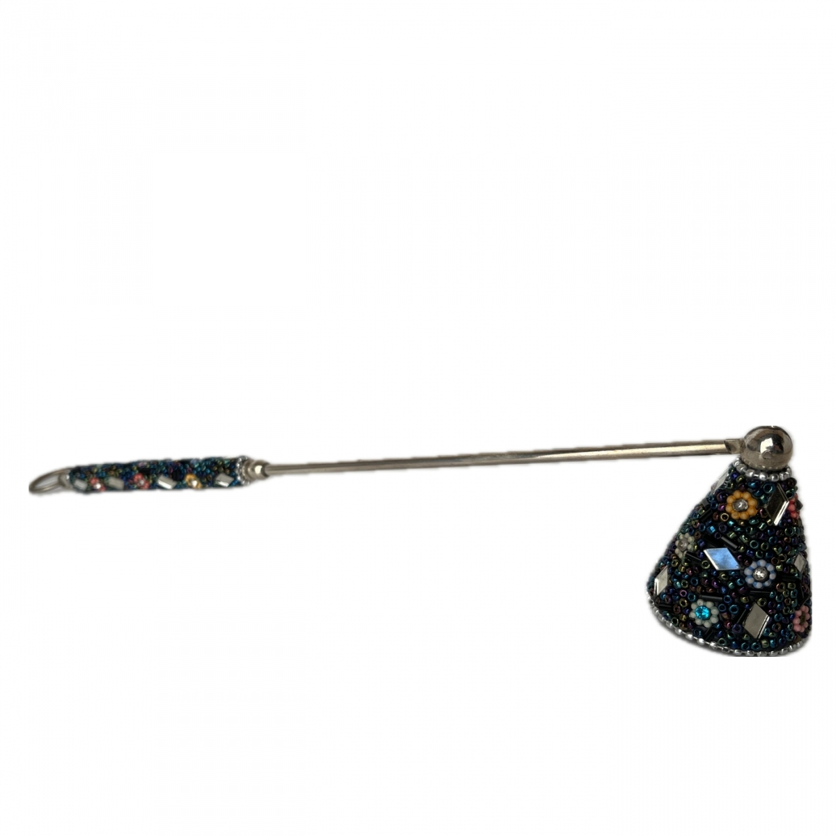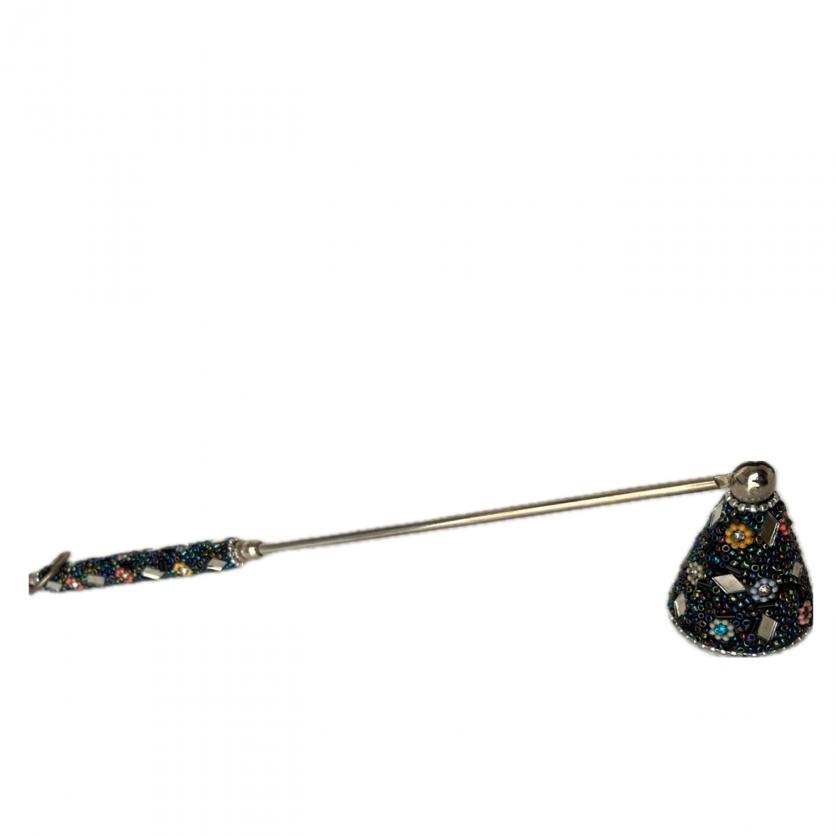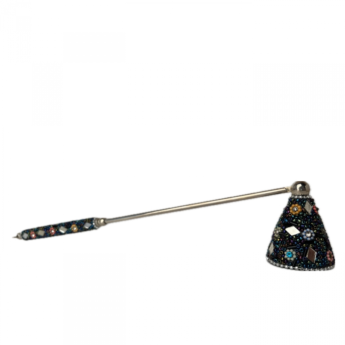 Zhášedlo na svíčky je vyrobeno ze stříbrného kovu, hlava zhasínatka a rukojeť jsou zdobeny drobnými barevnými korálky a sklíčky, které jsou ručně vkládané na povrch zhasínatka.