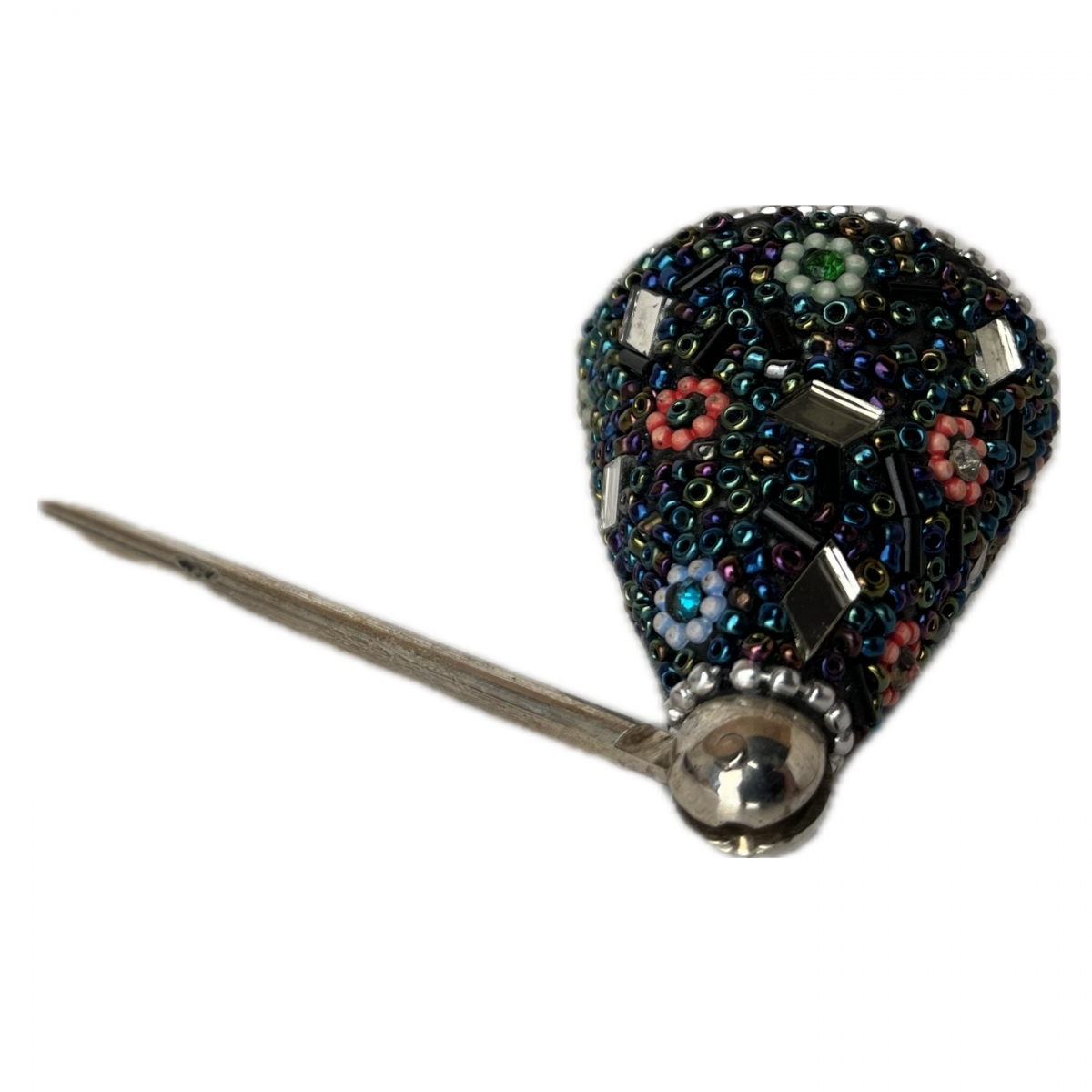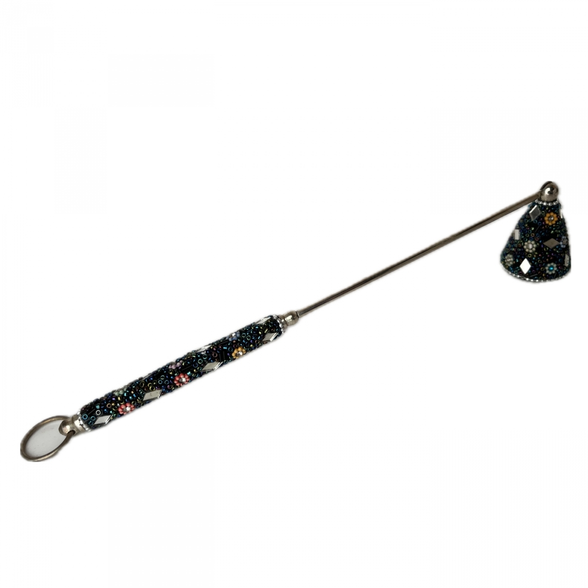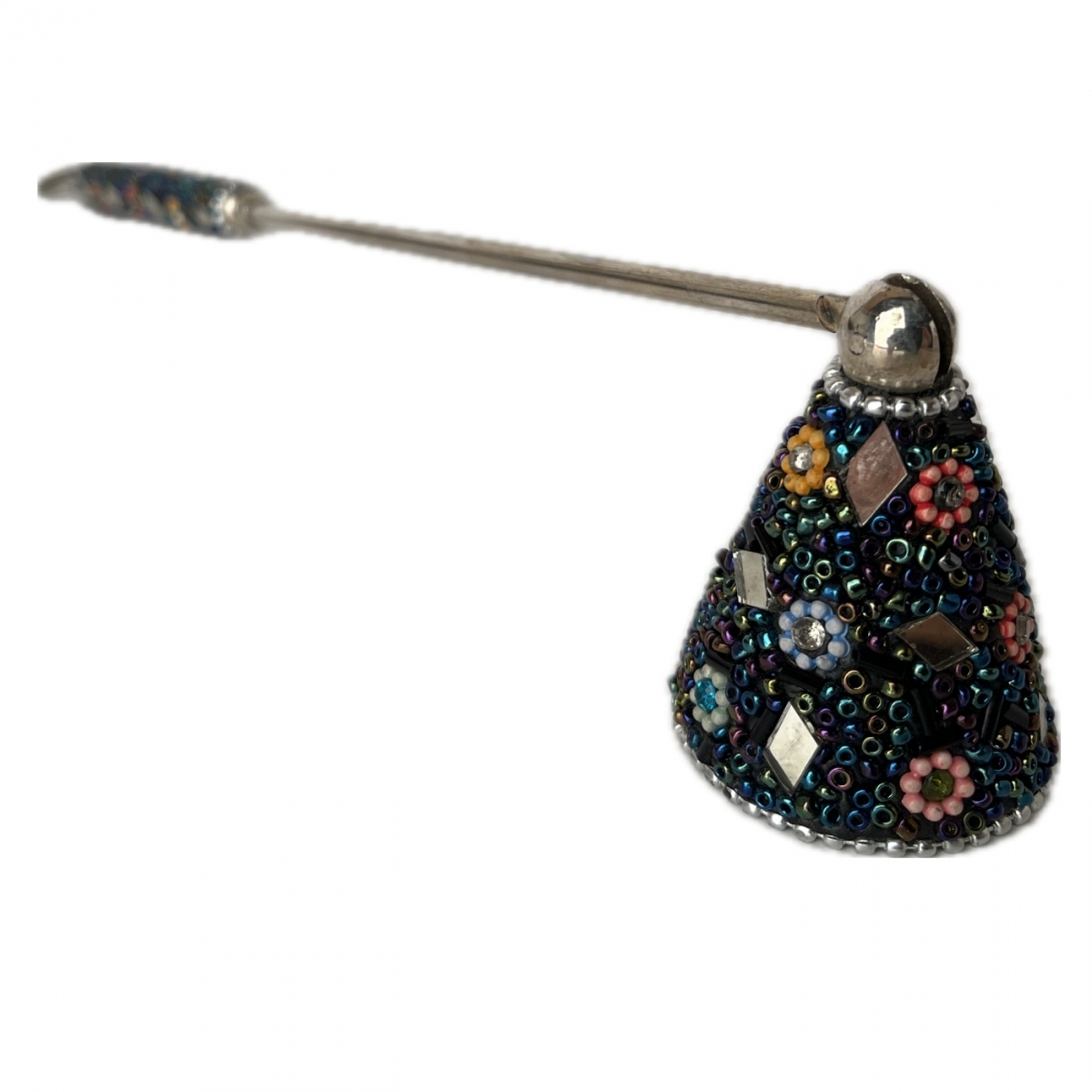 Zhášedlo na svíčky je vyrobeno ze stříbrného kovu, hlava zhasínatka a rukojeť jsou zdobeny drobnými barevnými korálky a sklíčky, které jsou ručně vkládané na povrch zhasínatka.