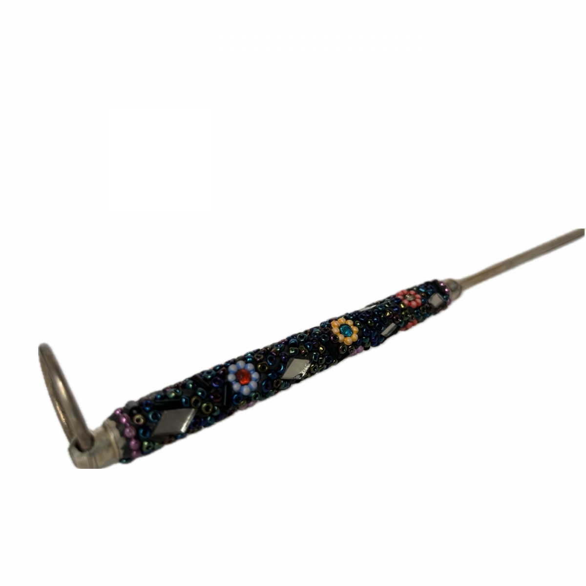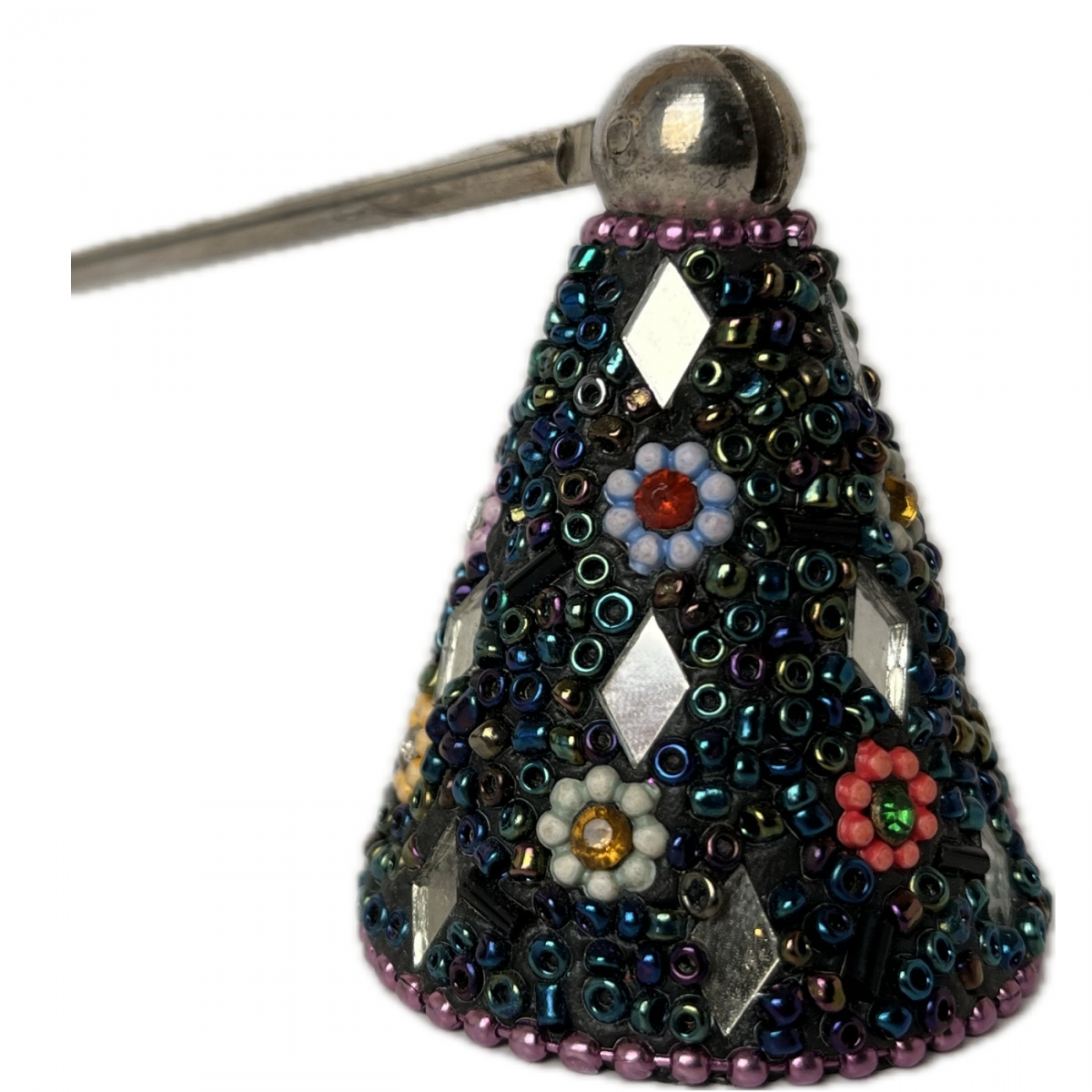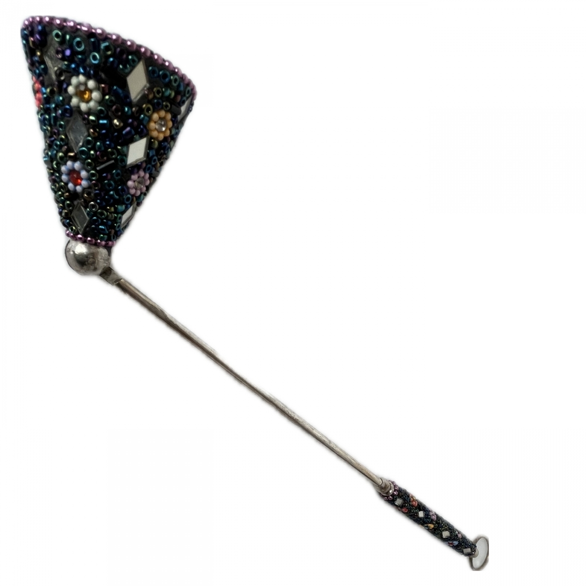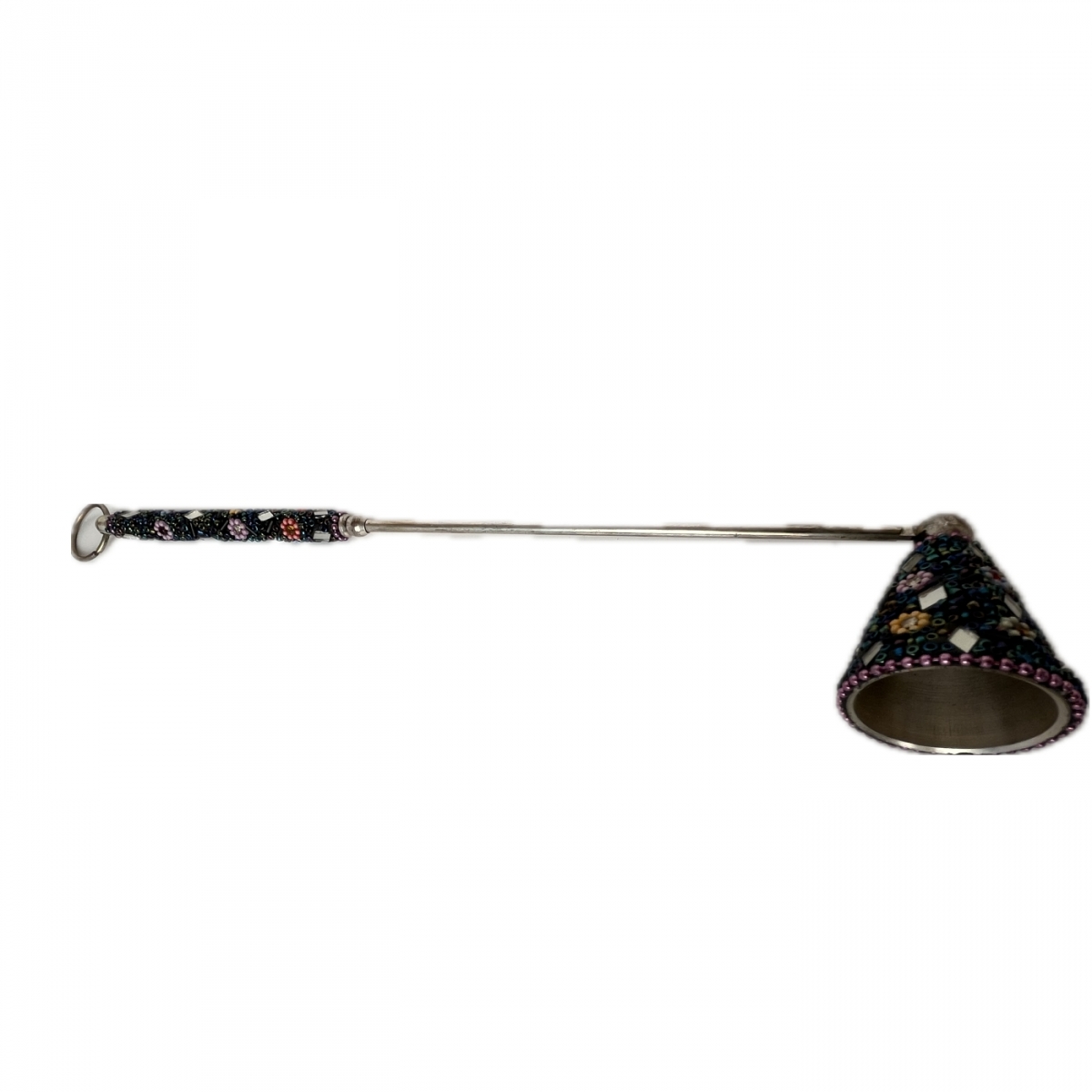 Zhášedlo na svíčky je vyrobeno se stříbrného kovu, hlava zhasínátka a rukojeť jsou zdobené drobnými barevnými korálky a sklíčky, které jsou ručně vkládané na povrch zhasínátka.