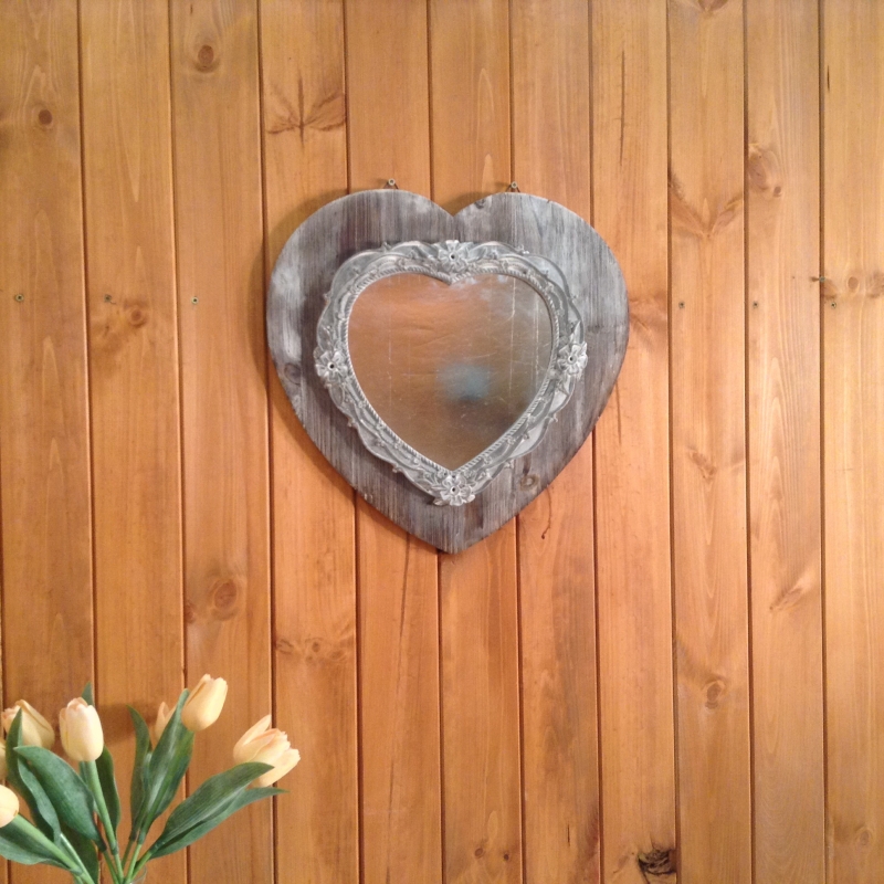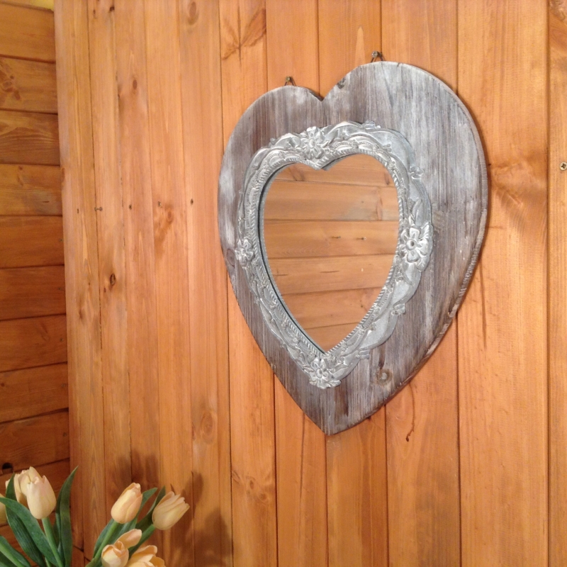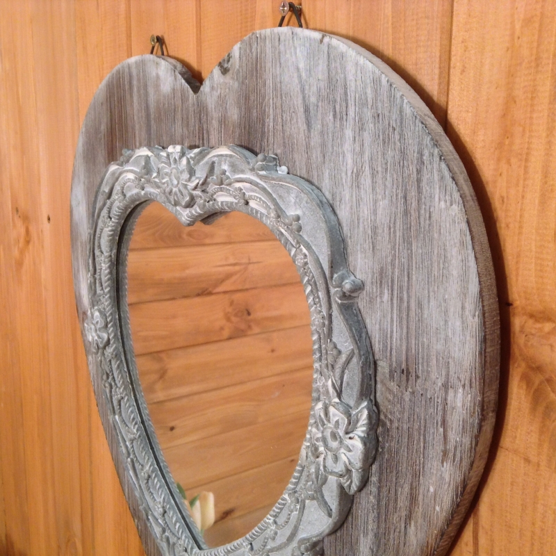 Zrcadlo ve tvaru srdce je ozdobené květinovým soustružením. Jedná se o zdařilou ruční práci, která jen tak nezevšední.