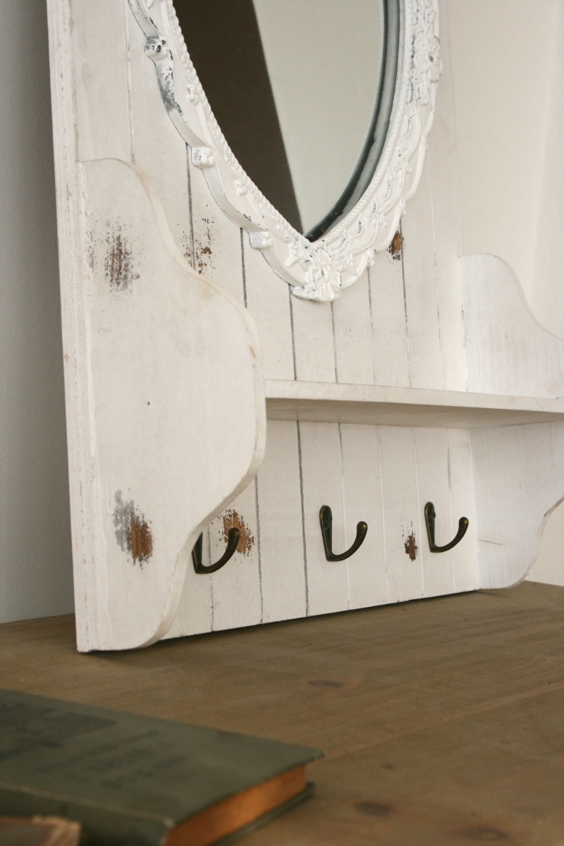 Zrcadlo je připevněno na dřevěné prkenné desce v bílé barvě s výraznou patinou. Kraje samotného zrcadla jsou bohatě zdobeny ornamenty se sádrovým povrchem. Polička na nezbytnosti a tři malé háčky dělají ze zrcadla jakousi věšákovou stěnu, která je vhodná do předsíní, ale i do ložnic nad toaletní stolek.
