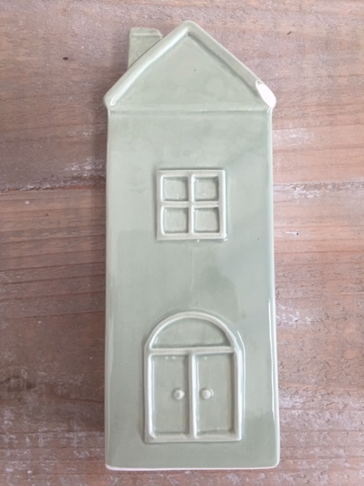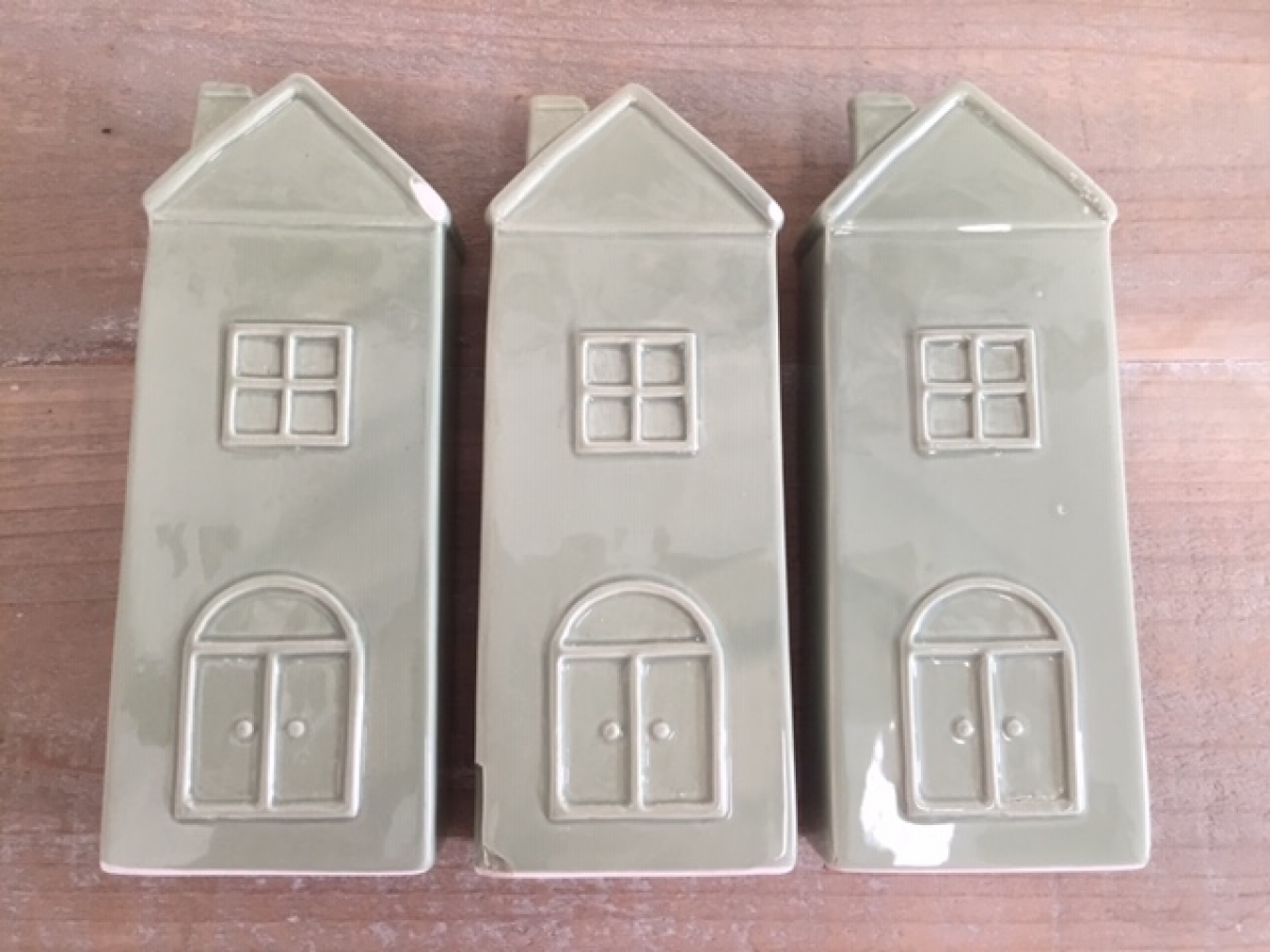Zvlhčovače vzduchu v podobě zelených keramických domečků jsou vyřazeny z důvodu poškození na glazuře a chybějících háčků na zavěšení, které lze nahradit kouskem drátu, nalezeného v domácnosti.